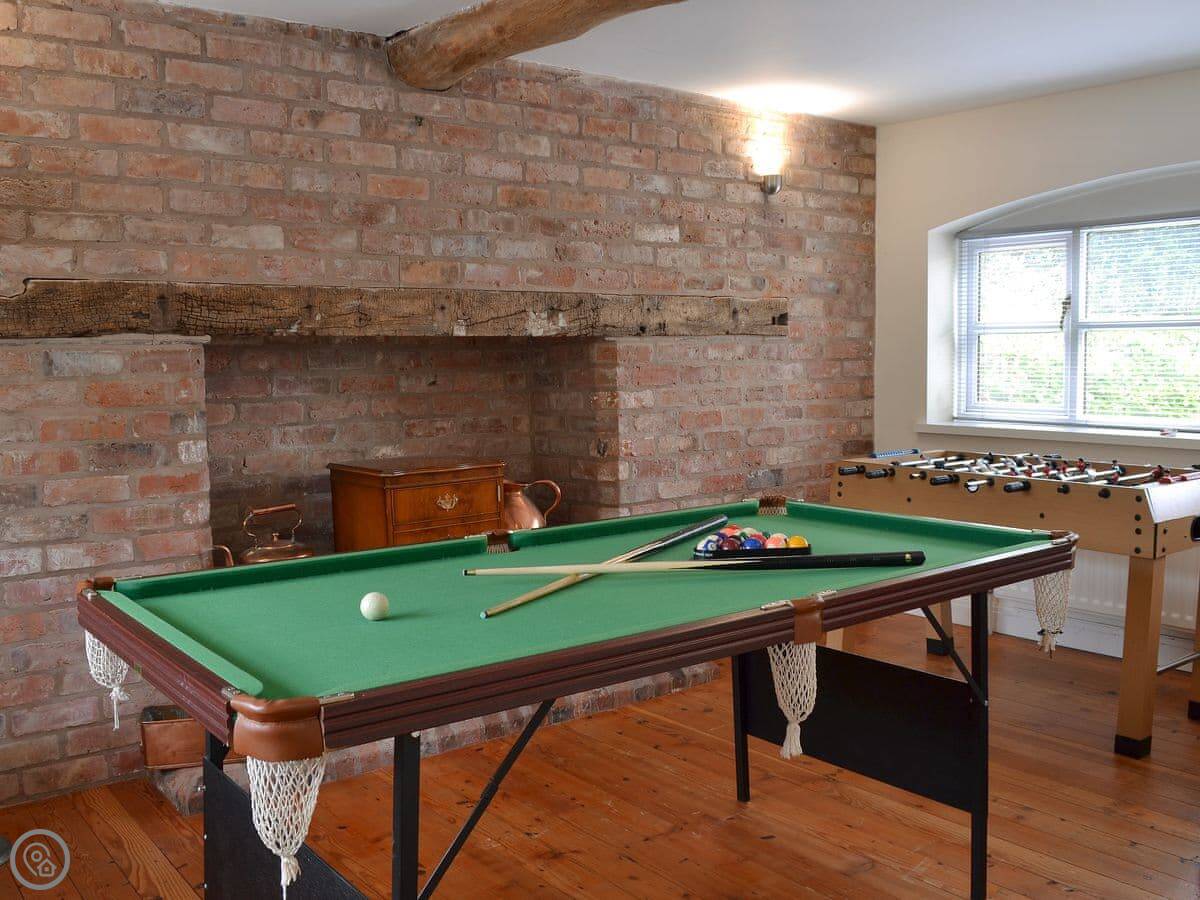 There's a wood burner in the living room. It gets a proper draught so it lights well. The games room is through that archway. It's got a pool table.