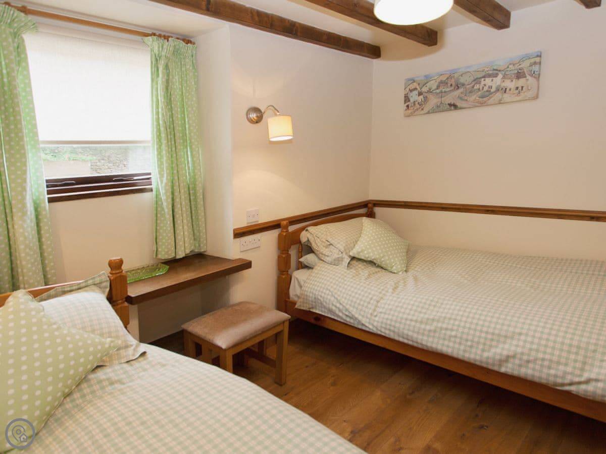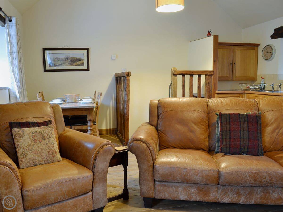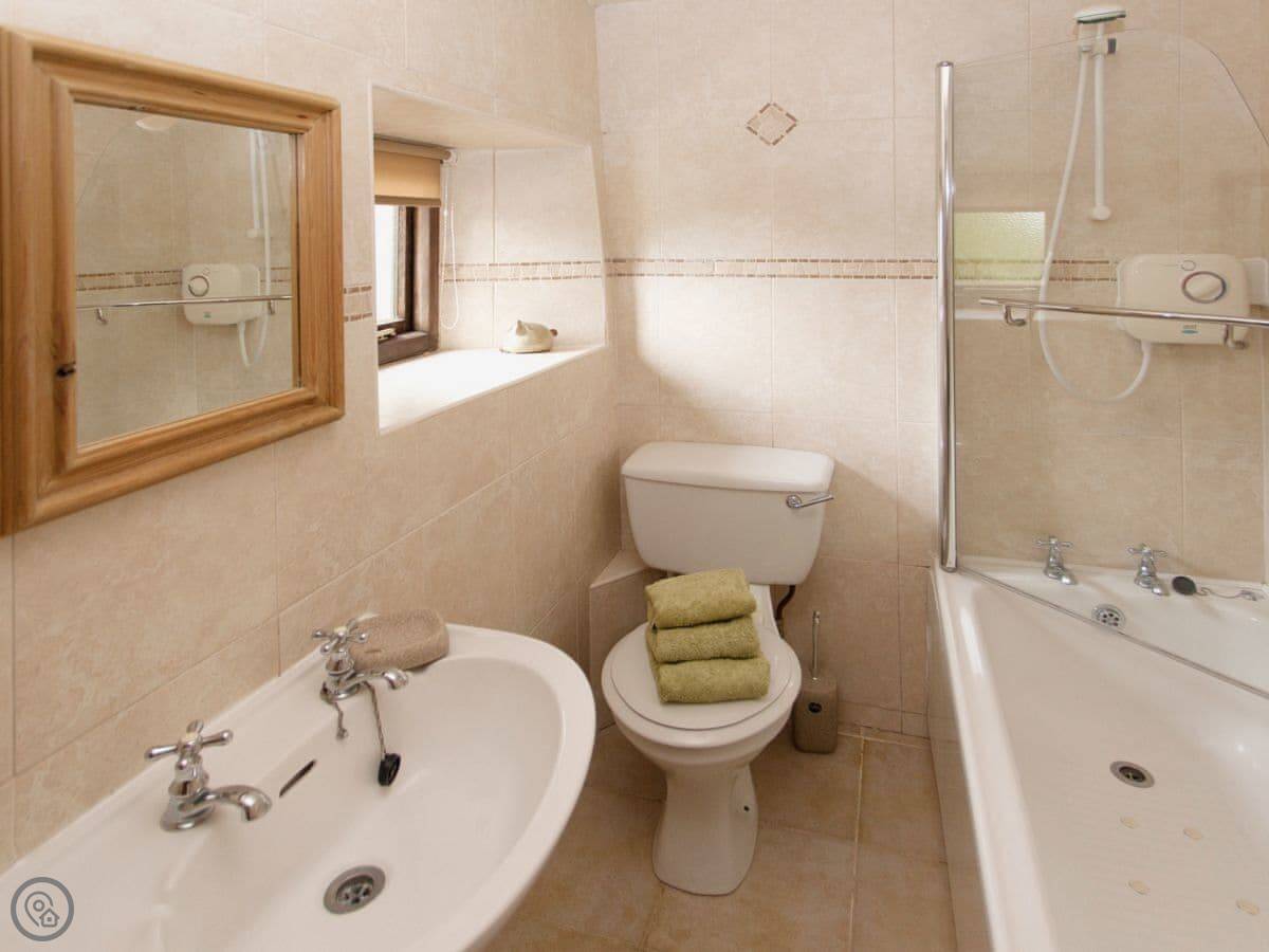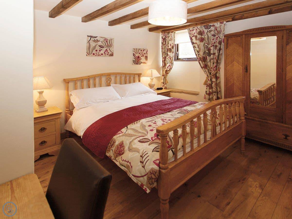 It sleeps four. Two bedrooms, one bathroom. It's got a 4 Star rating, which means it's comfortable and well-equipped. It's open plan downstairs, with the beams left in. The spa bathroom is new.