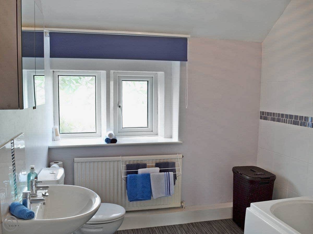 Inside, it's got what you'd expect: a washing machine, dishwasher, WiFi, TV. Bedding and towels are included. We can provide a cot and highchair. You can bring two dogs. There's parking.