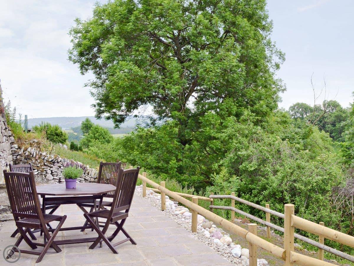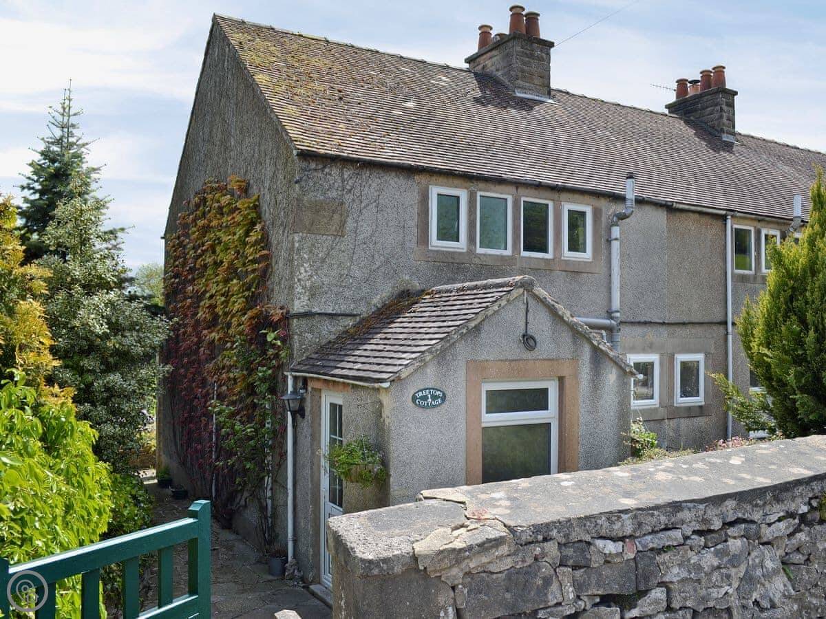 Tree Tops is on the edge of Youlgreave. It's the end house in a terrace of three. You get a patio round the back with nice views over the fields. It catches the evening sun.