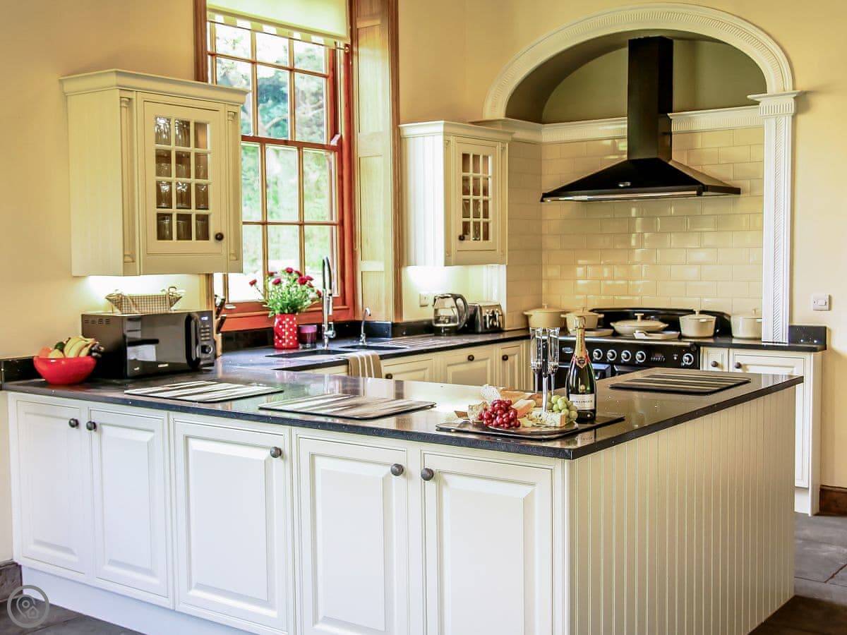 It sleeps 16 people. There are seven bedrooms, and each one has its own bathroom. It's a 5 Star property, which means it's finished to a high standard and is well-equipped. The kitchen is large, with a range cooker. The lounge has oak beams.