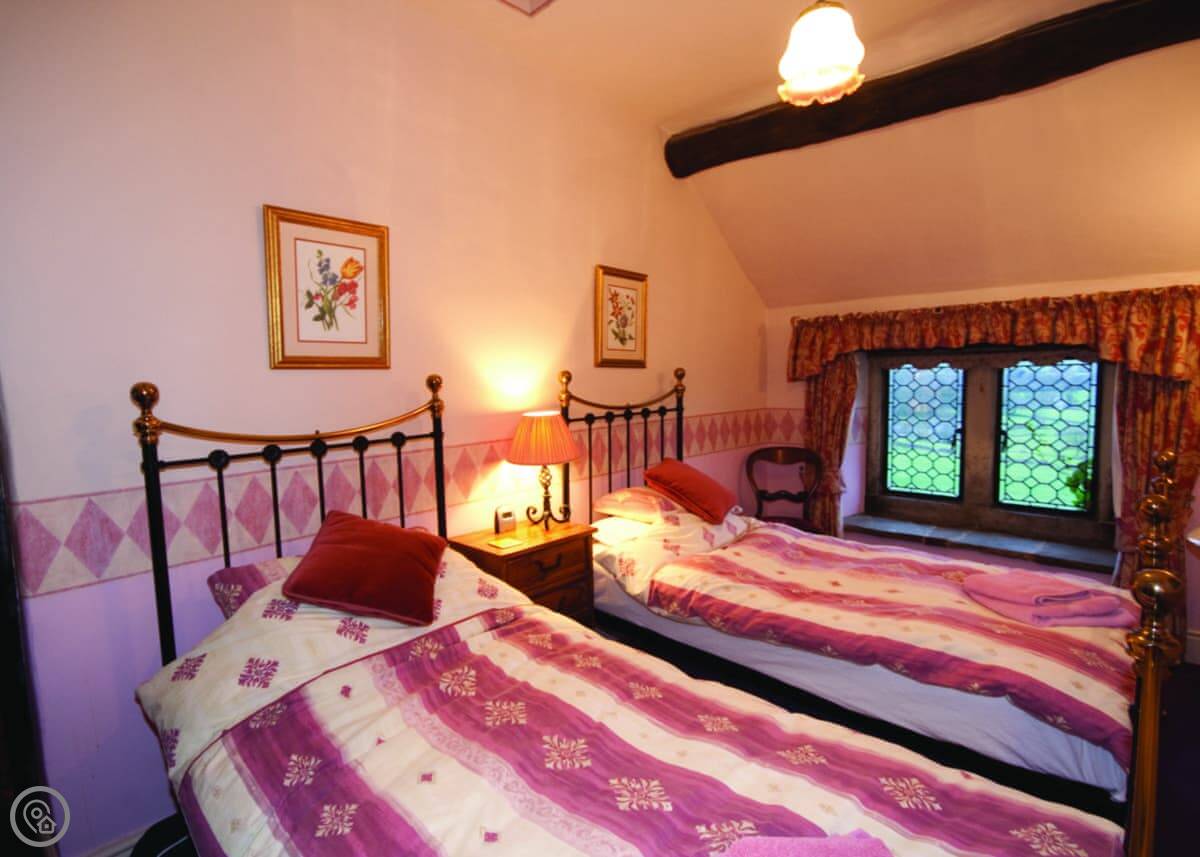 The cottage sleeps six. Three bedrooms and two bathrooms, which is handy. It's a 4 Star place, so it's comfortable and well looked after. It's got thick walls and low beams in places, which is normal for round here.