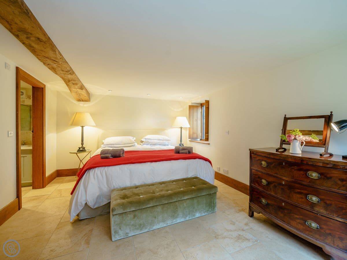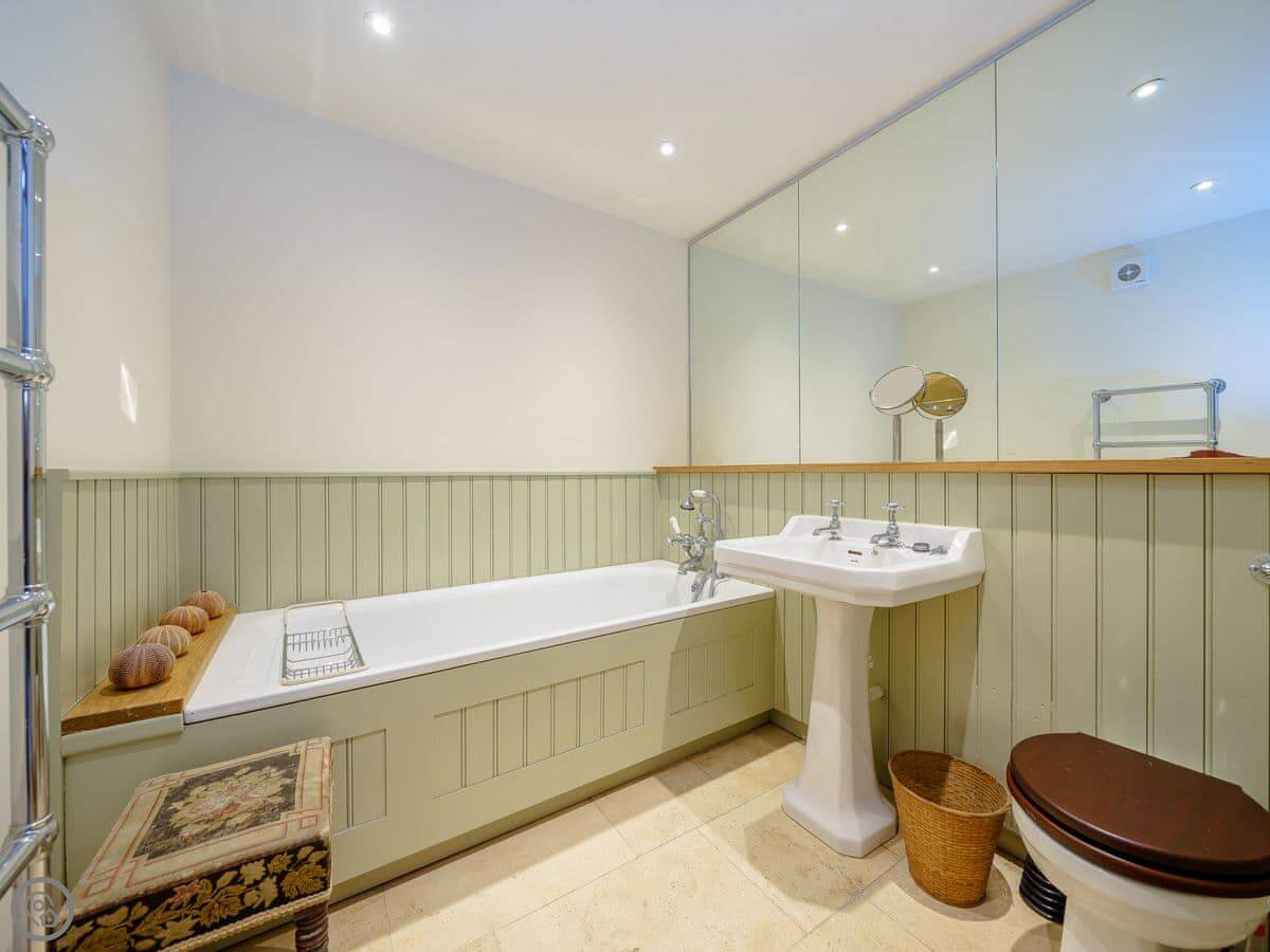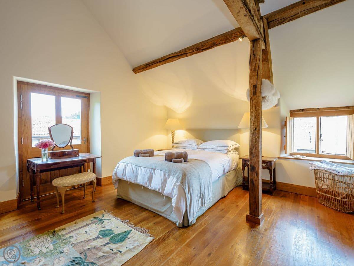 It sleeps eight. Four bedrooms, three bathrooms. One bedroom and its bathroom are upstairs. The other three are on the ground floor. It's a 5 Star place, so it's well-equipped. All bedding and towels are included.