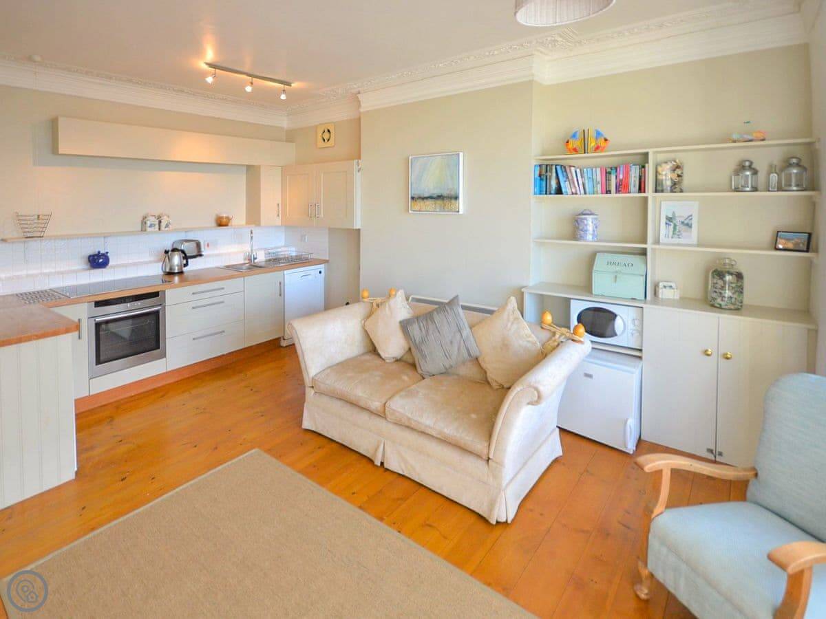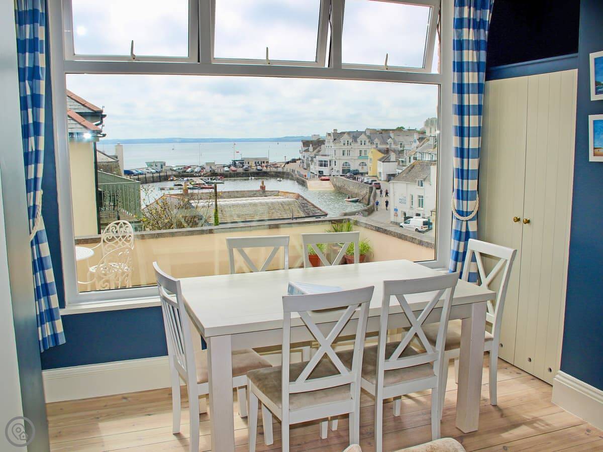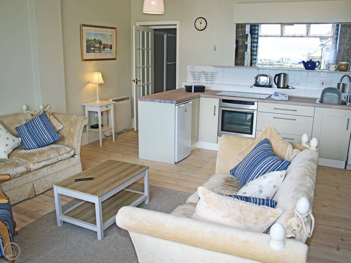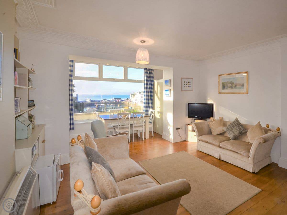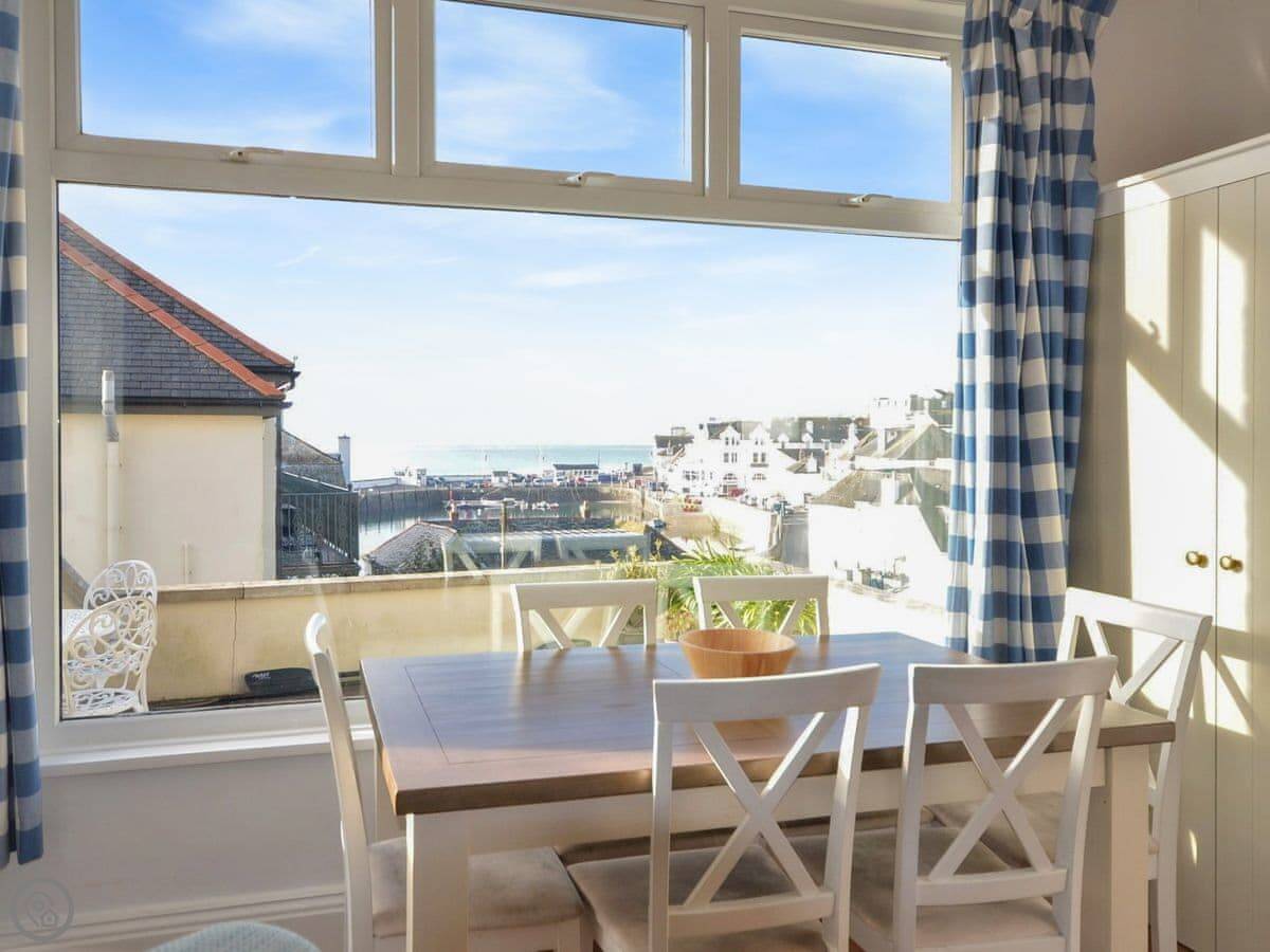 The main room is open plan: kitchen, dining area, and sitting area all together. The kitchen has the usual stuff: dishwasher, fridge, freezer, oven. The best bit is the view from the dining table. You look straight out over the harbour. It's a proper working harbour, so there's always something going on.