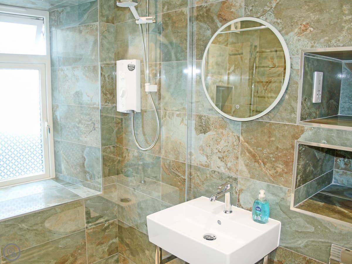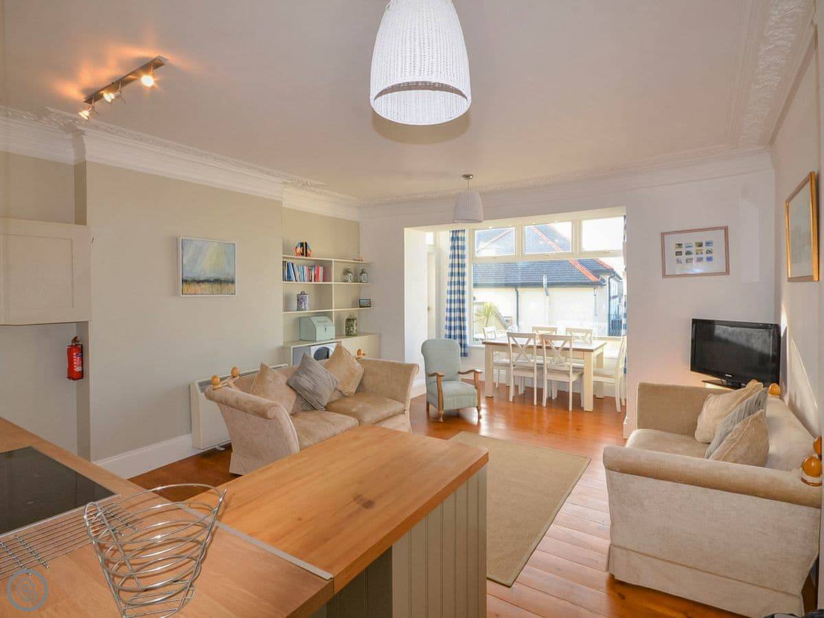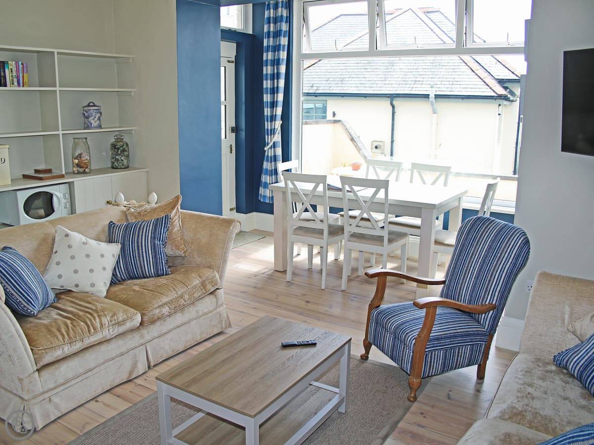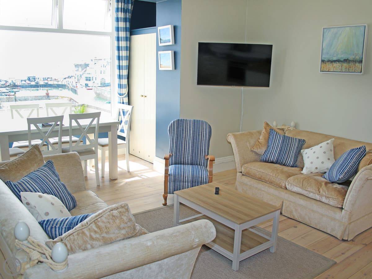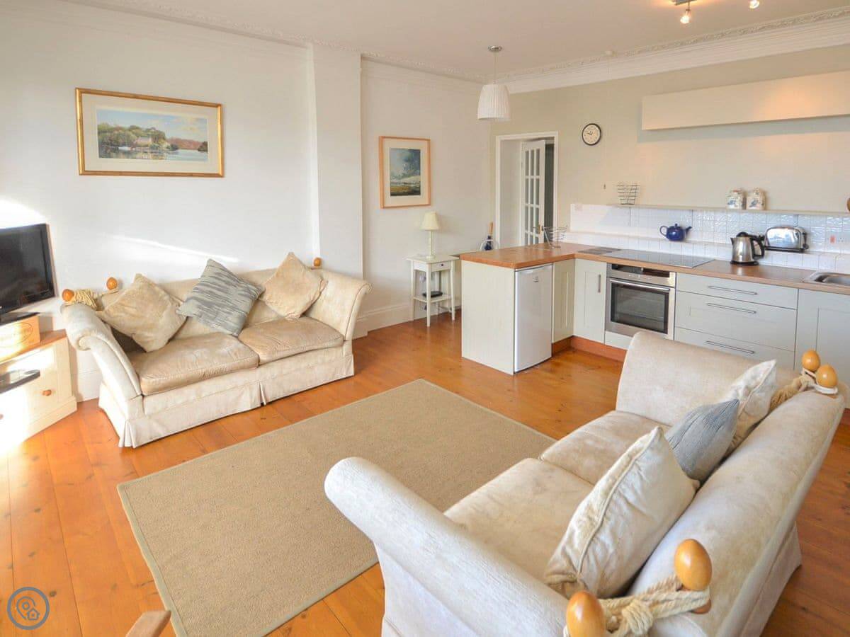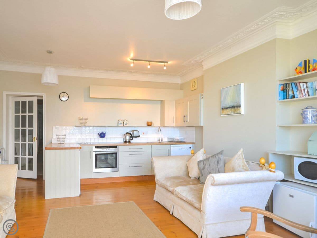 The main room is open plan: kitchen, dining area, and sitting area all together. The kitchen has the usual stuff: dishwasher, fridge, freezer, oven. The best bit is the view from the dining table. You look straight out over the harbour. It's a proper working harbour, so there's always something going on.