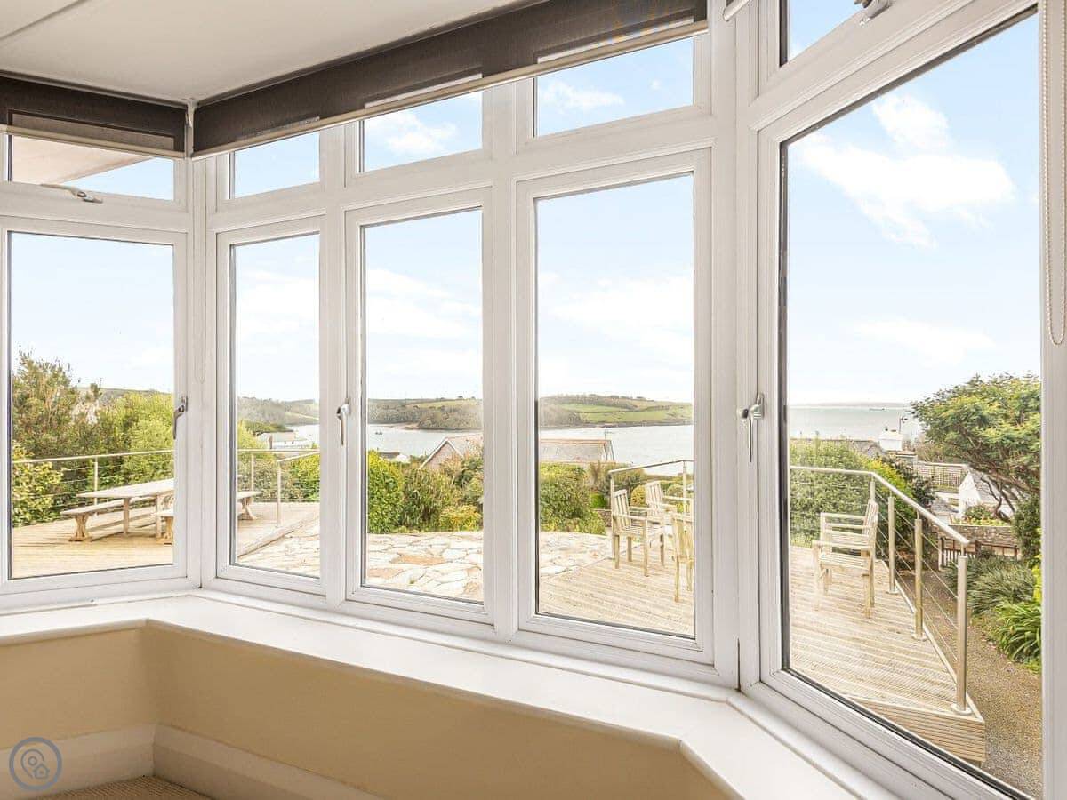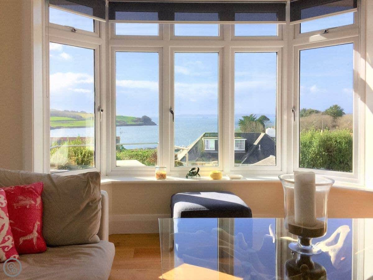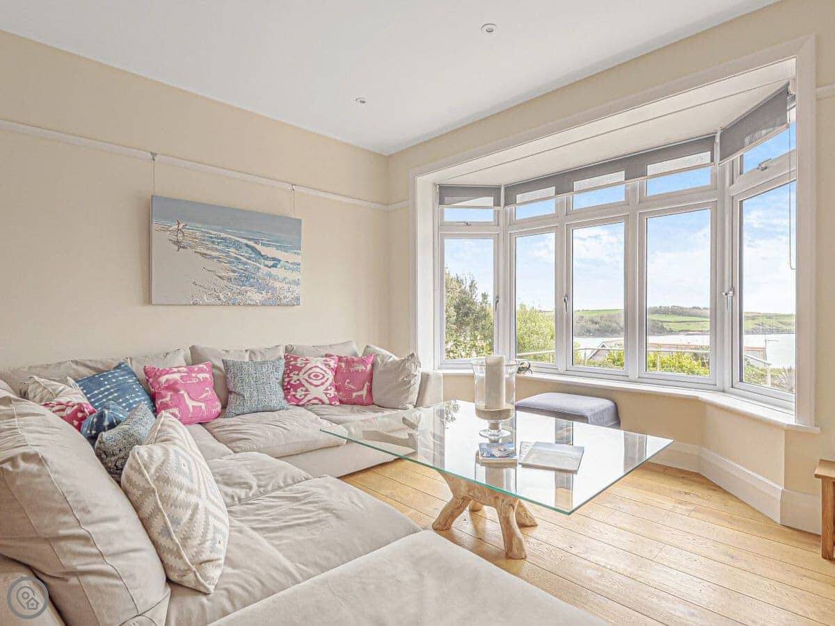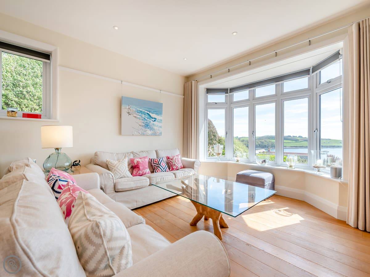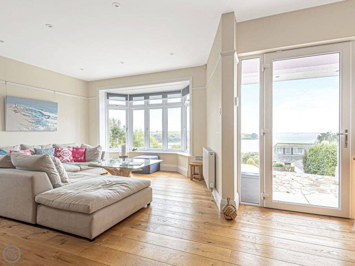 The main room is open plan. Big kitchen, dining area, and a sitting bit with a bay window looking right out over the estuary and Falmouth Bay. There's a second sitting room too, with a TV. You can shut the doors between them if you want.