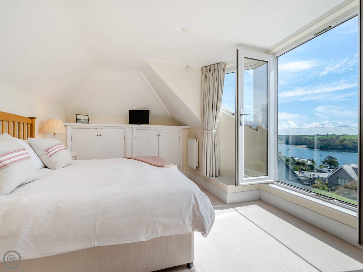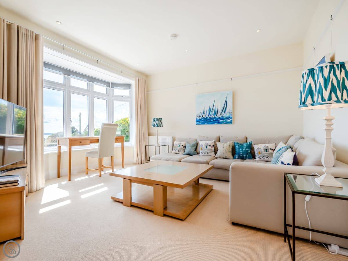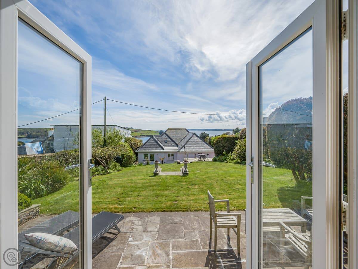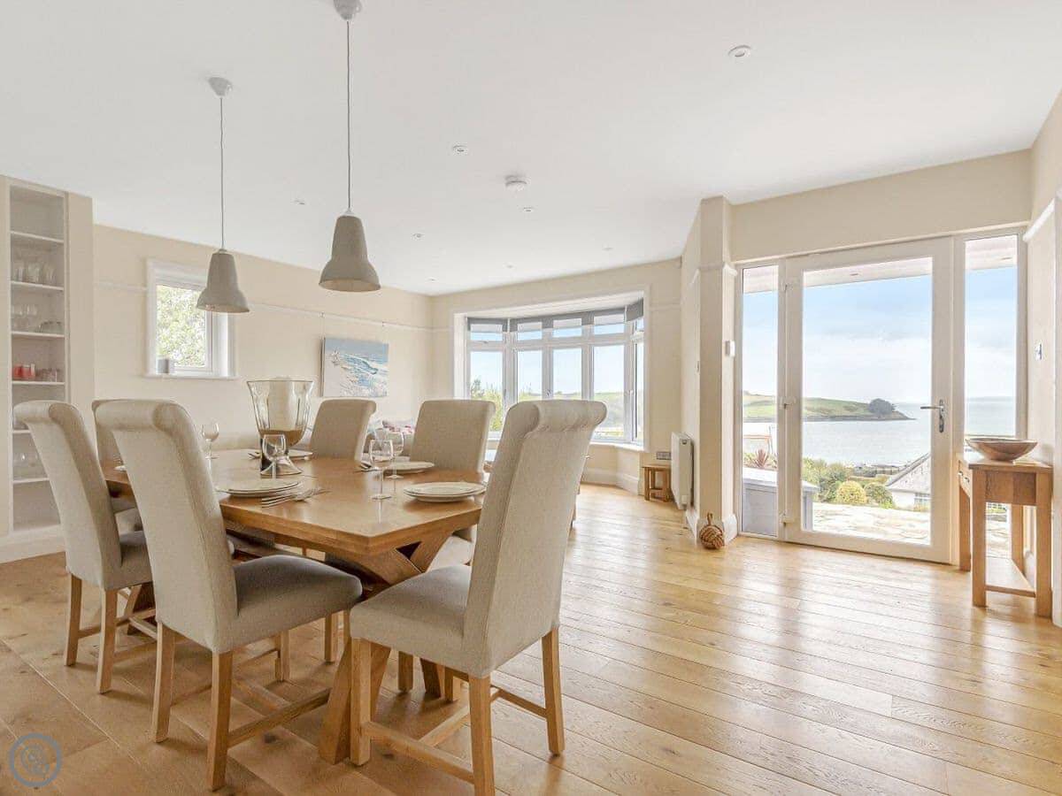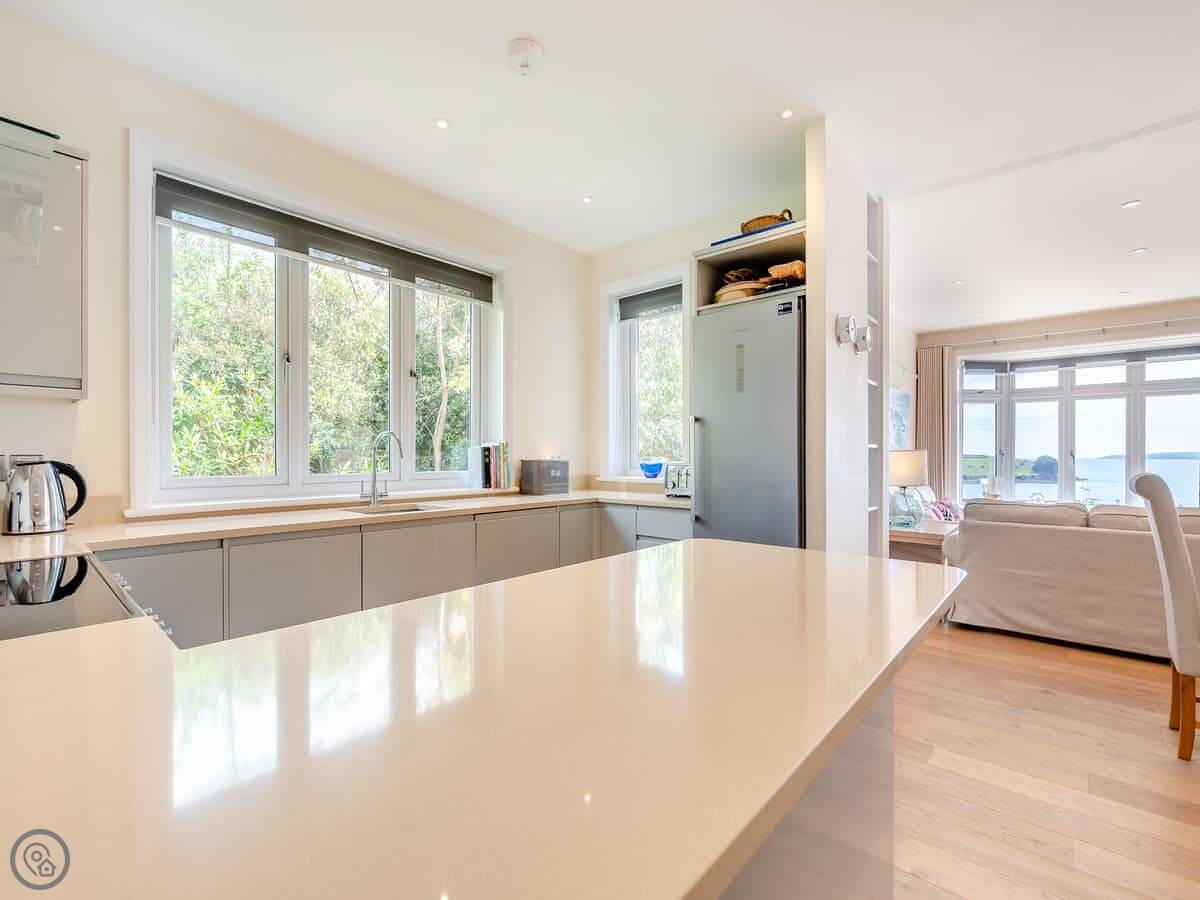 The main room is open plan. Big kitchen, dining area, and a sitting bit with a bay window looking right out over the estuary and Falmouth Bay. There's a second sitting room too, with a TV. You can shut the doors between them if you want.