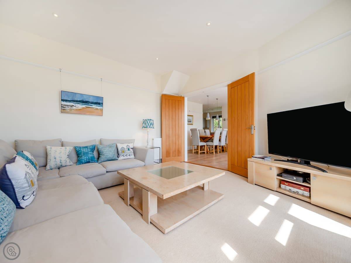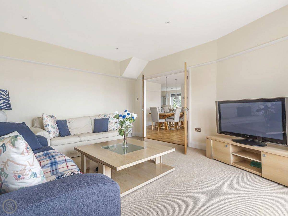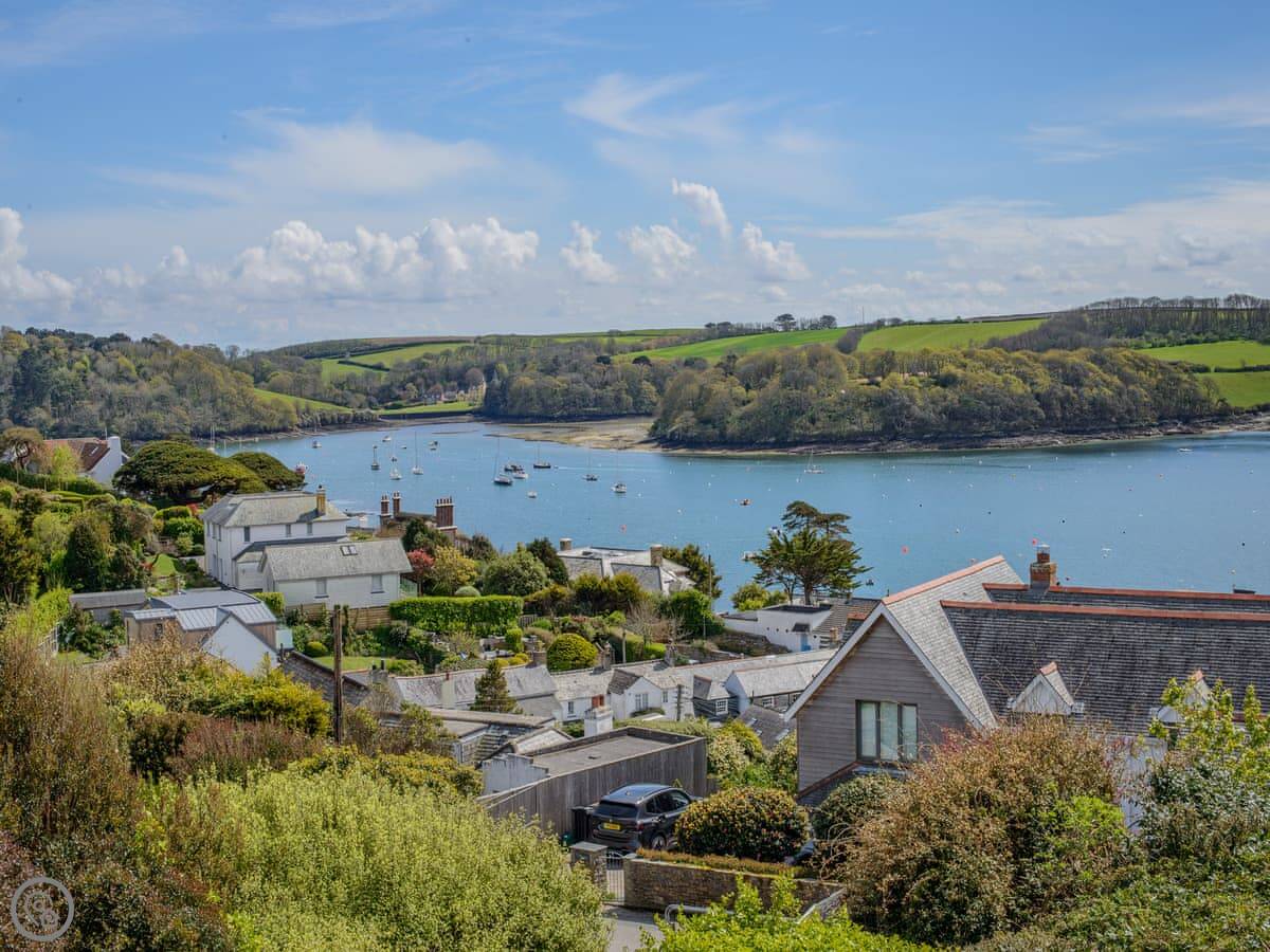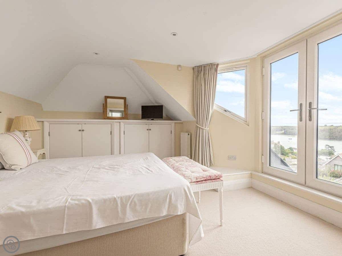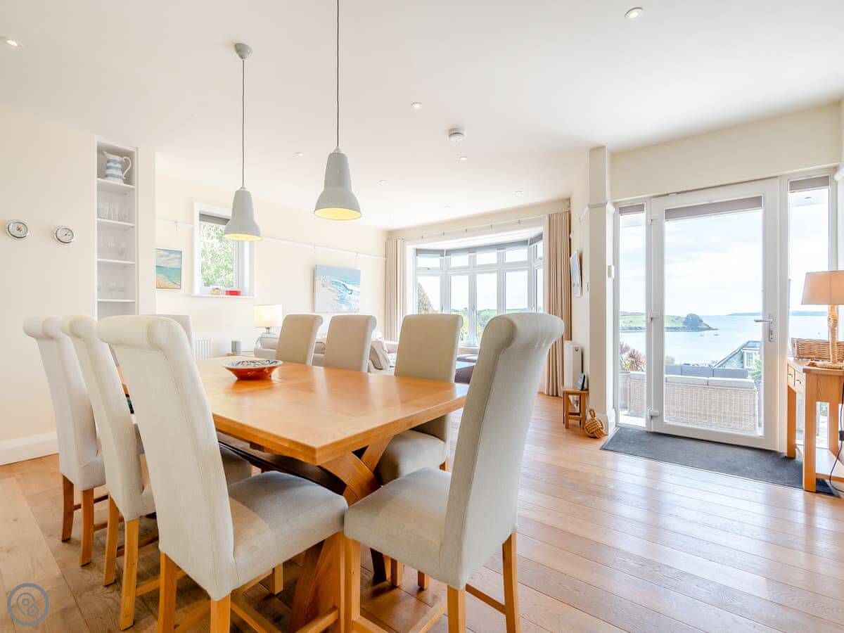 The main room is open plan. Big kitchen, dining area, and a sitting bit with a bay window looking right out over the estuary and Falmouth Bay. There's a second sitting room too, with a TV. You can shut the doors between them if you want.