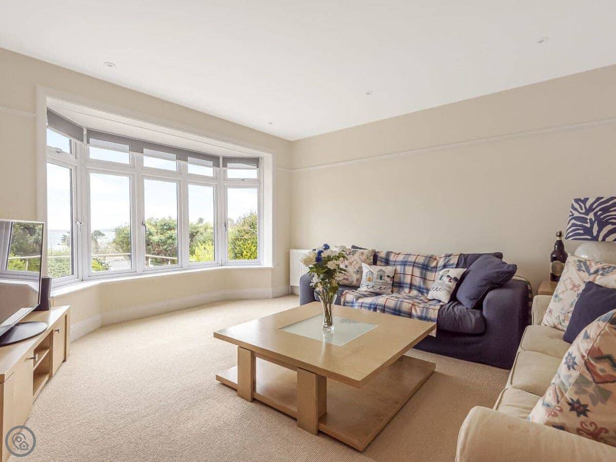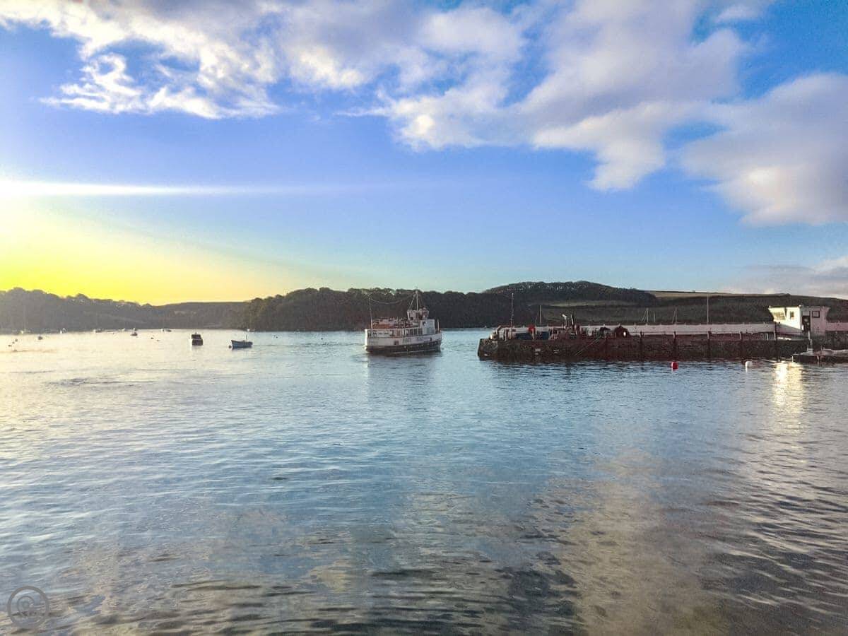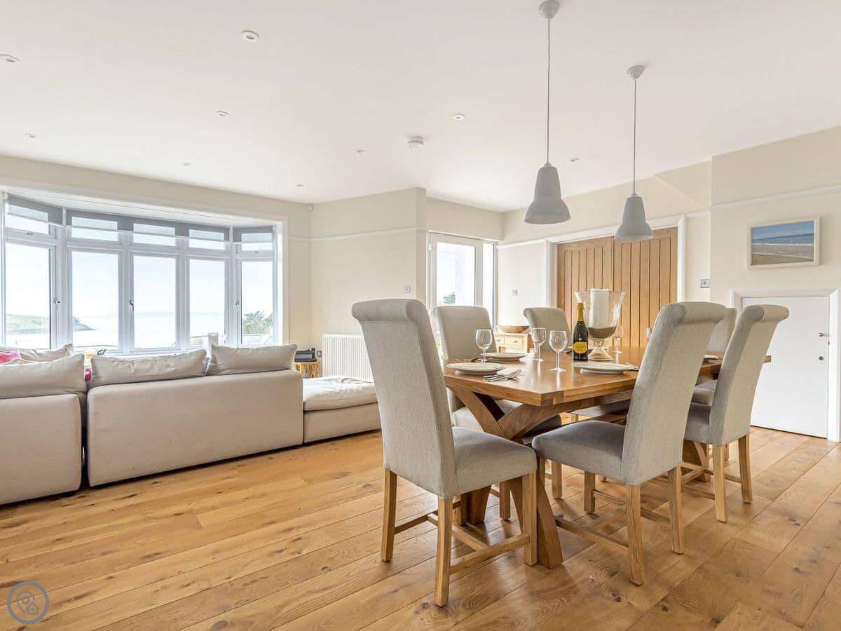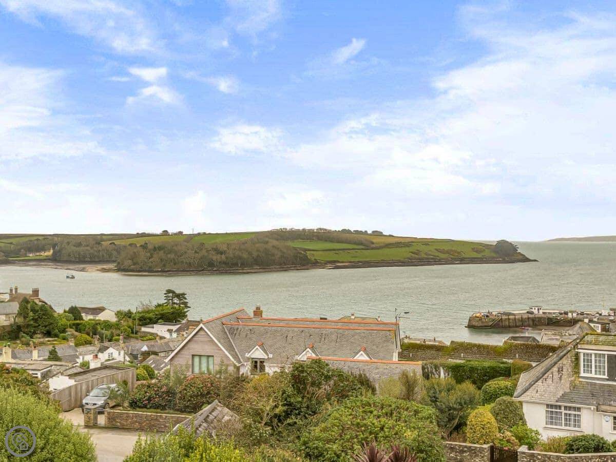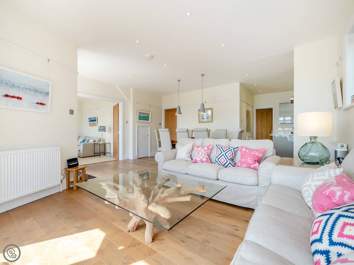 The main room is open plan. Big kitchen, dining area, and a sitting bit with a bay window looking right out over the estuary and Falmouth Bay. There's a second sitting room too, with a TV. You can shut the doors between them if you want.