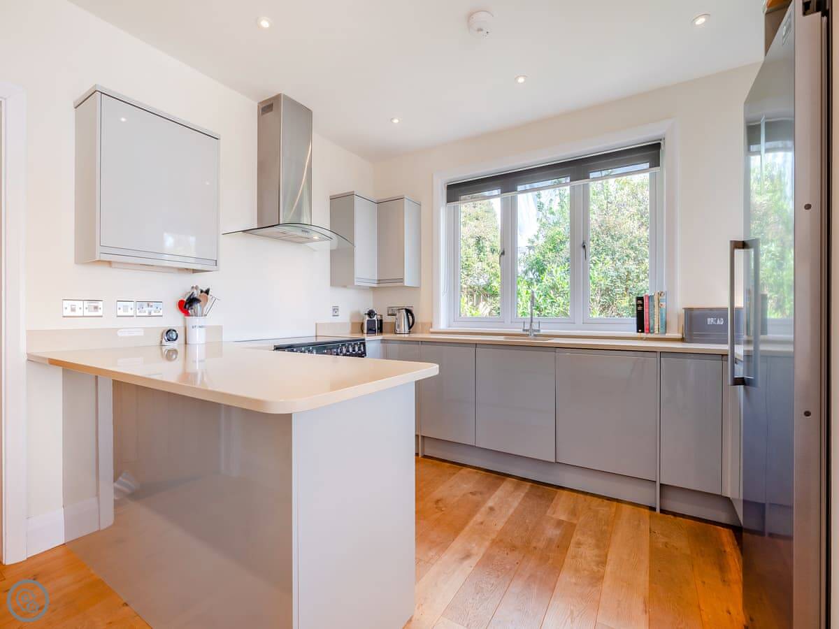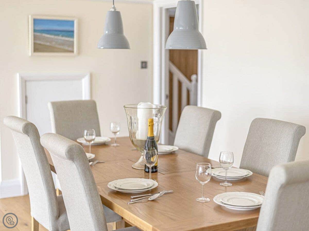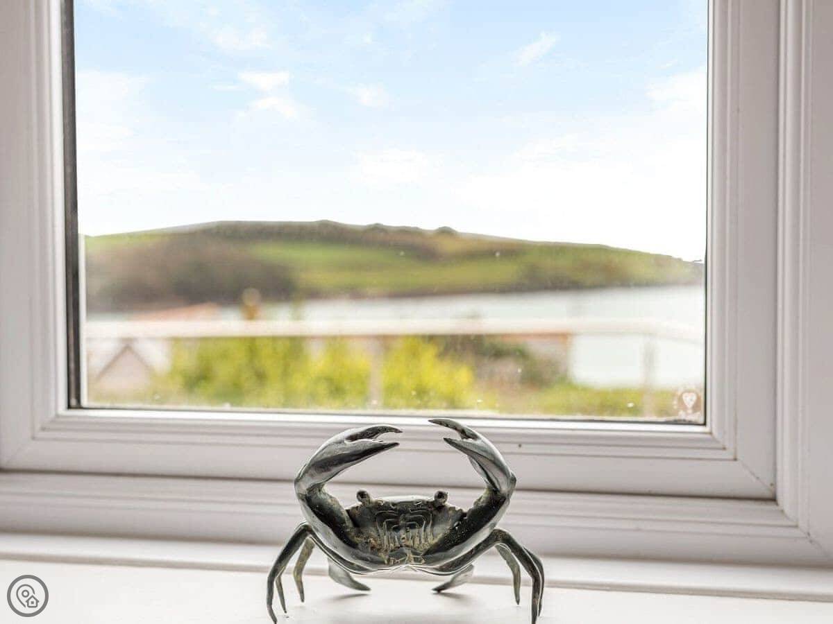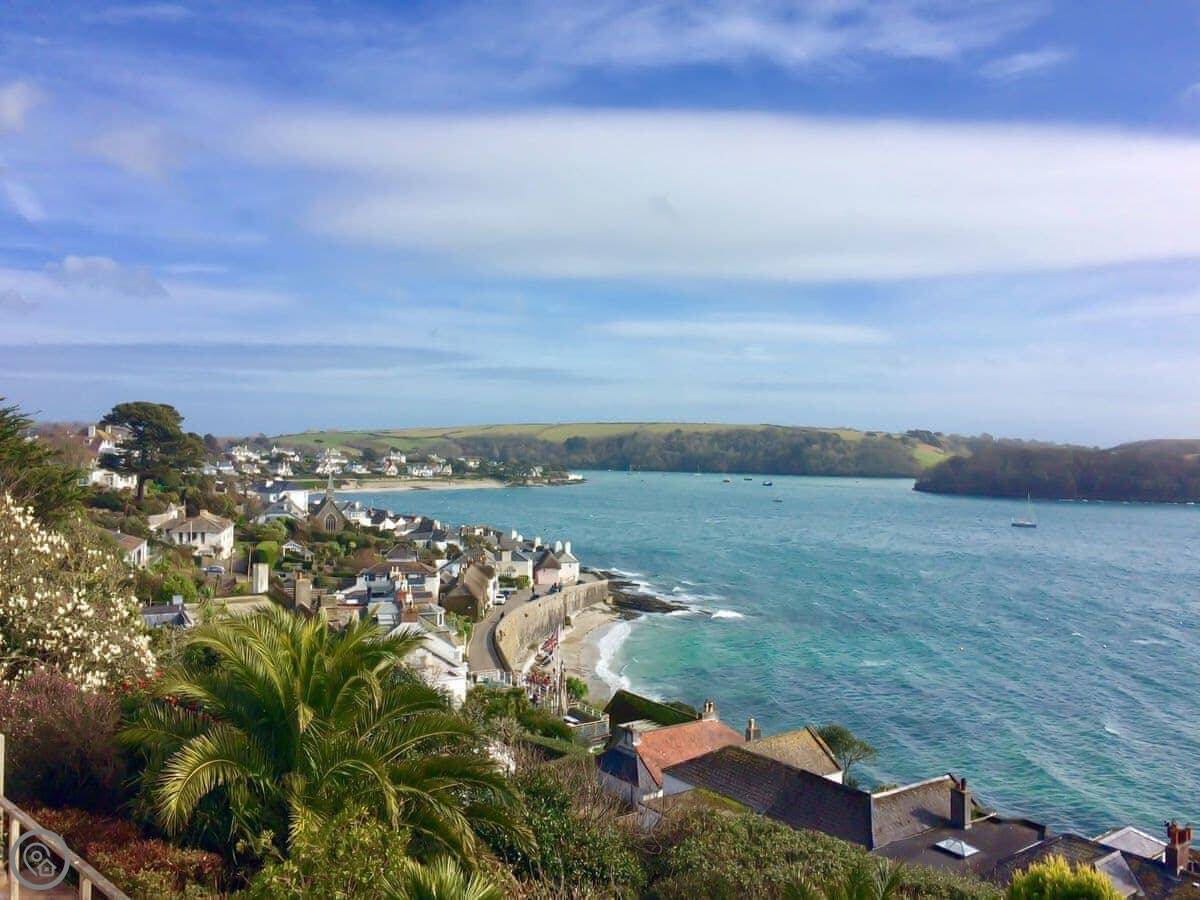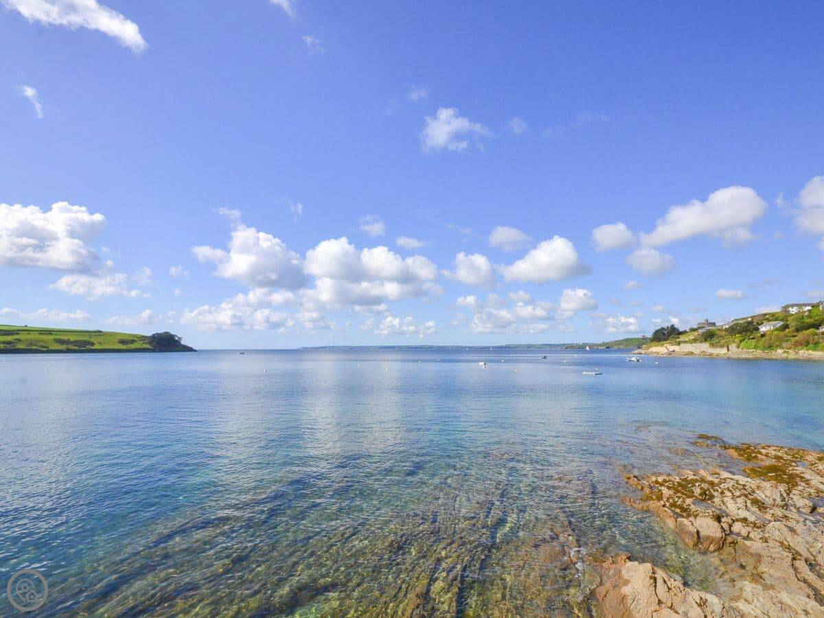 The main room is open plan. Big kitchen, dining area, and a sitting bit with a bay window looking right out over the estuary and Falmouth Bay. There's a second sitting room too, with a TV. You can shut the doors between them if you want.