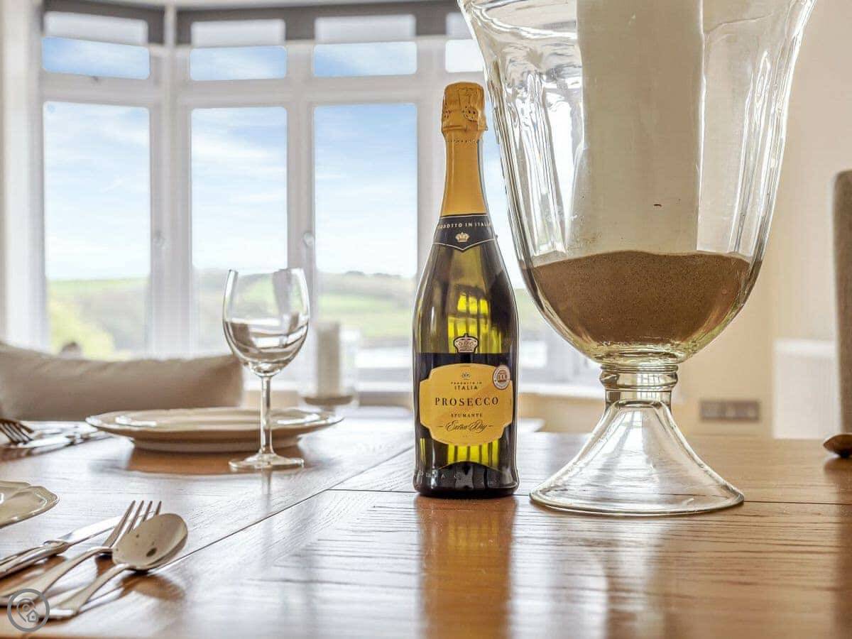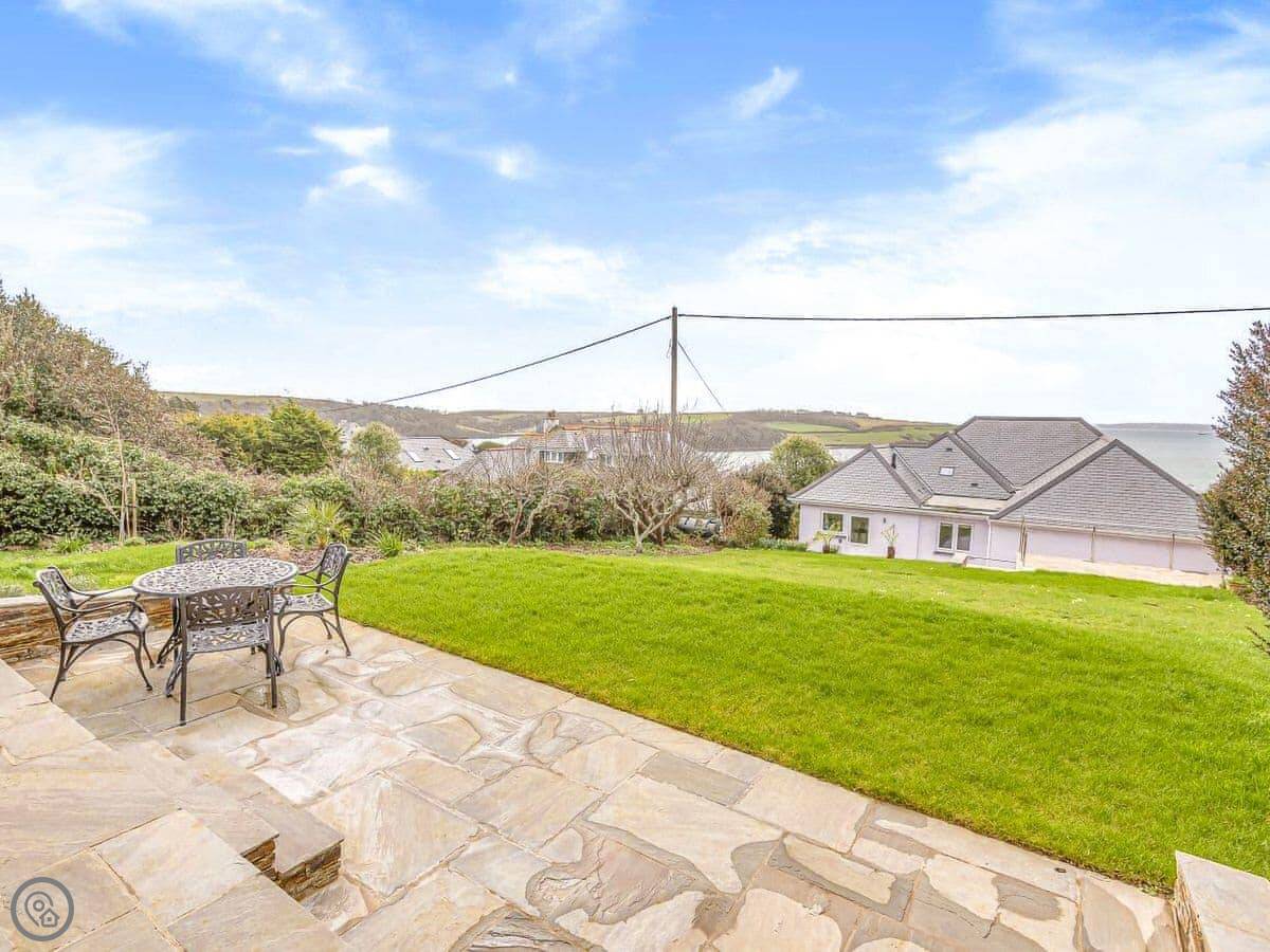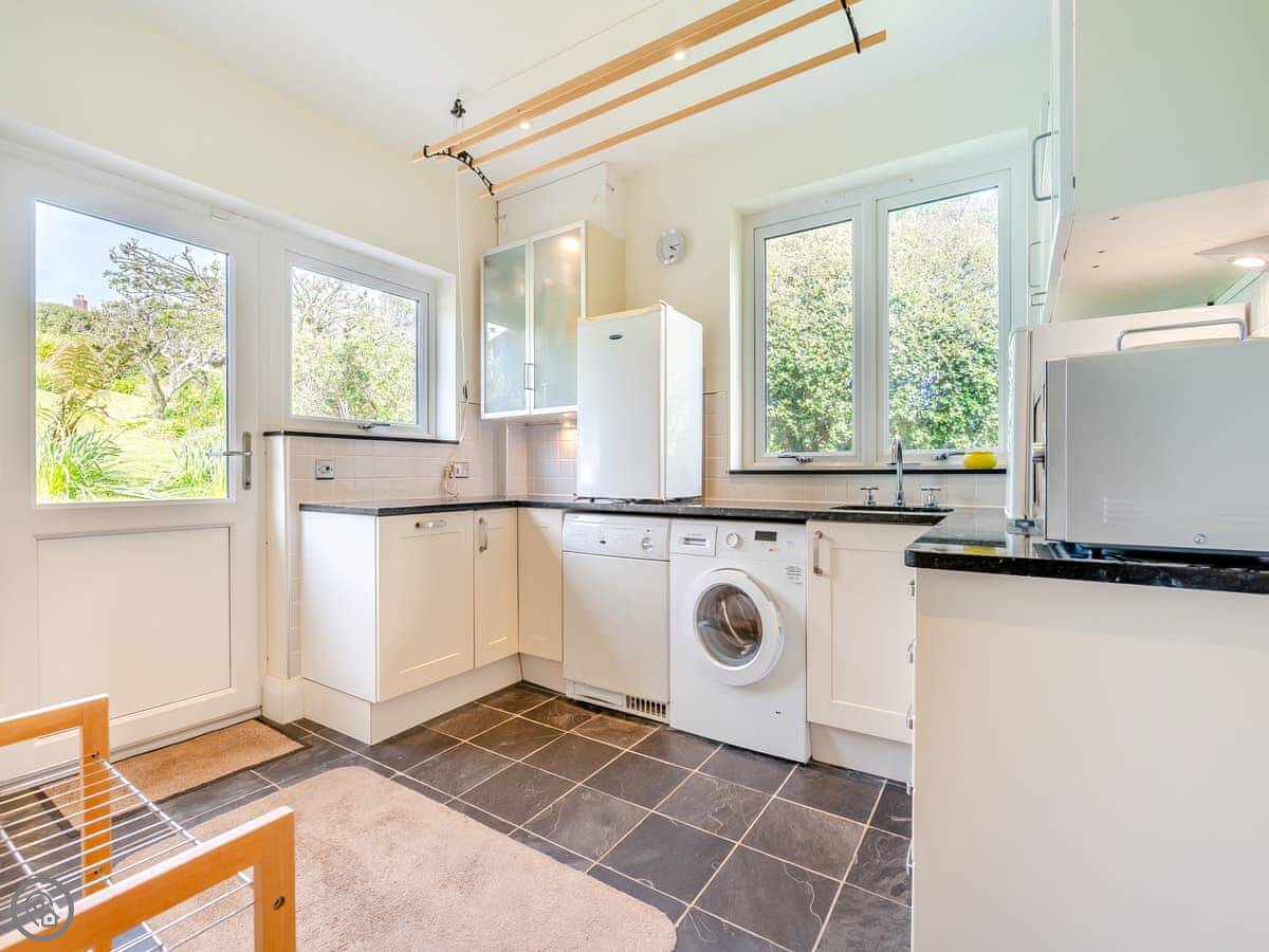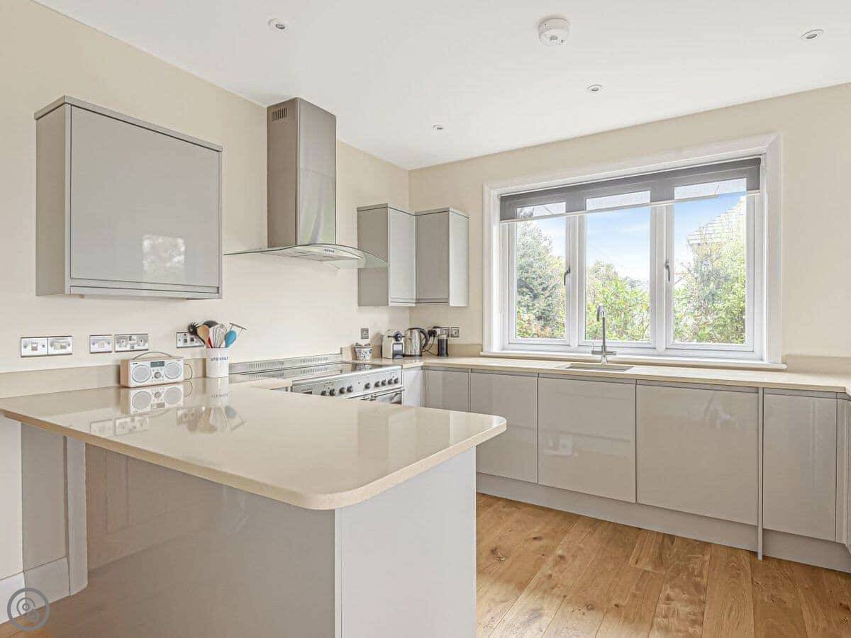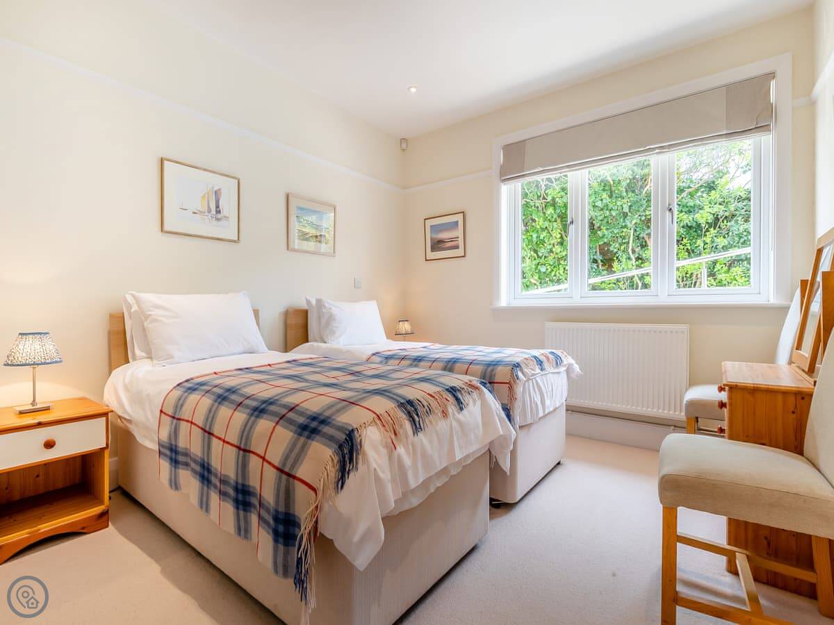 The main room is open plan. Big kitchen, dining area, and a sitting bit with a bay window looking right out over the estuary and Falmouth Bay. There's a second sitting room too, with a TV. You can shut the doors between them if you want.