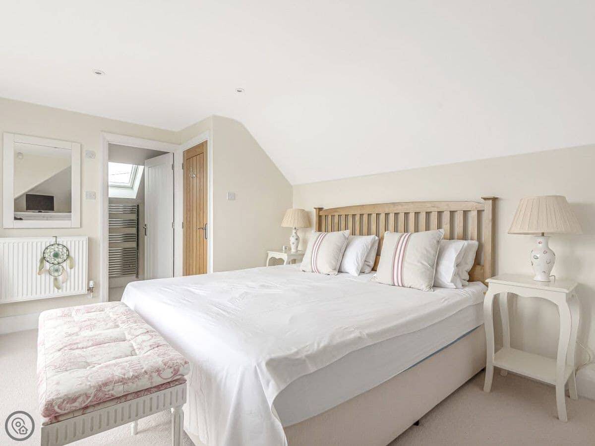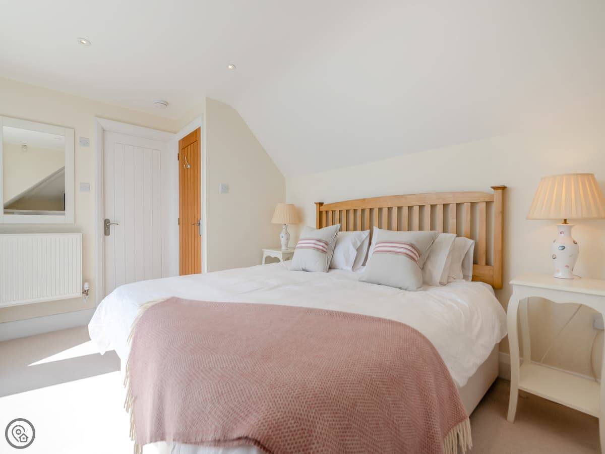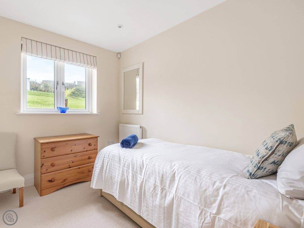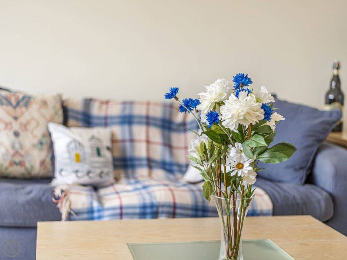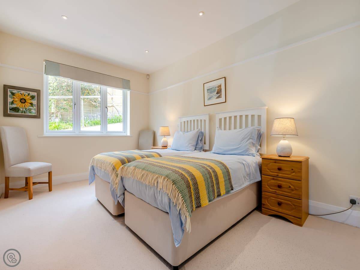 The main room is open plan. Big kitchen, dining area, and a sitting bit with a bay window looking right out over the estuary and Falmouth Bay. There's a second sitting room too, with a TV. You can shut the doors between them if you want.
