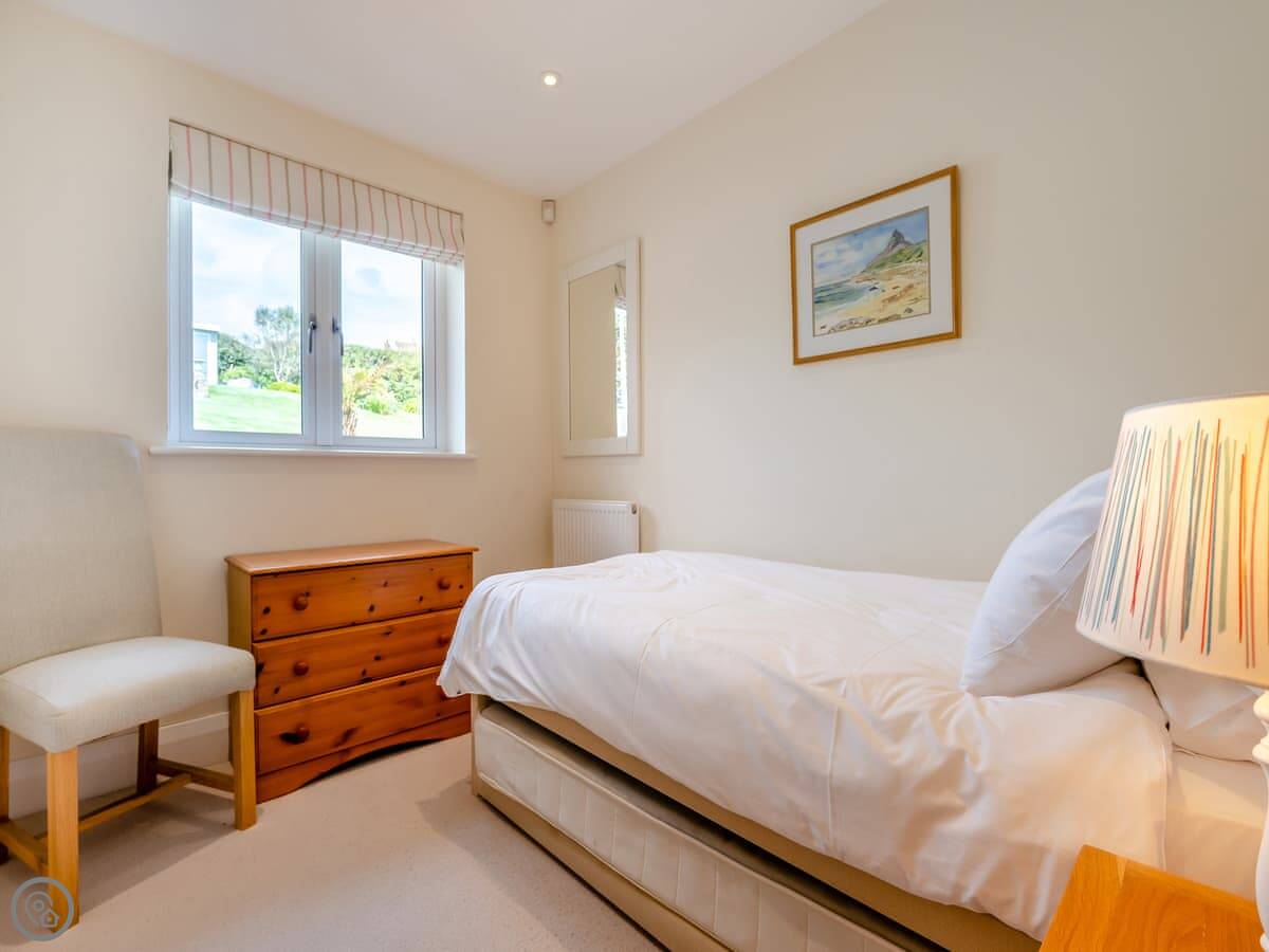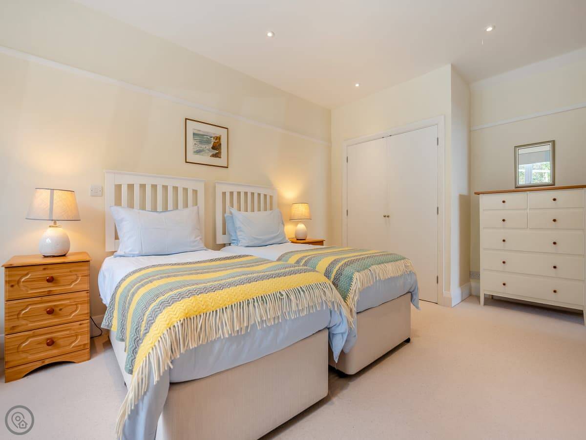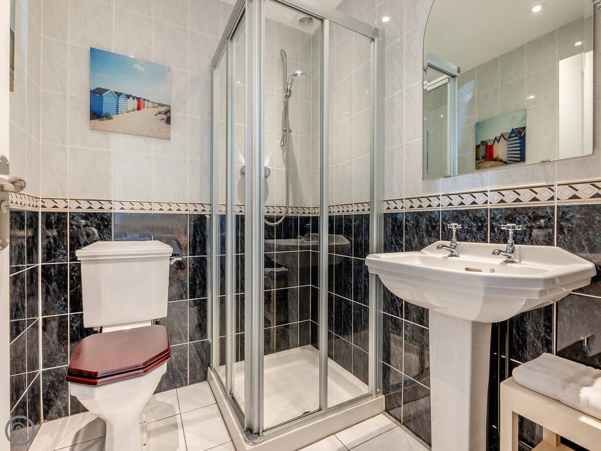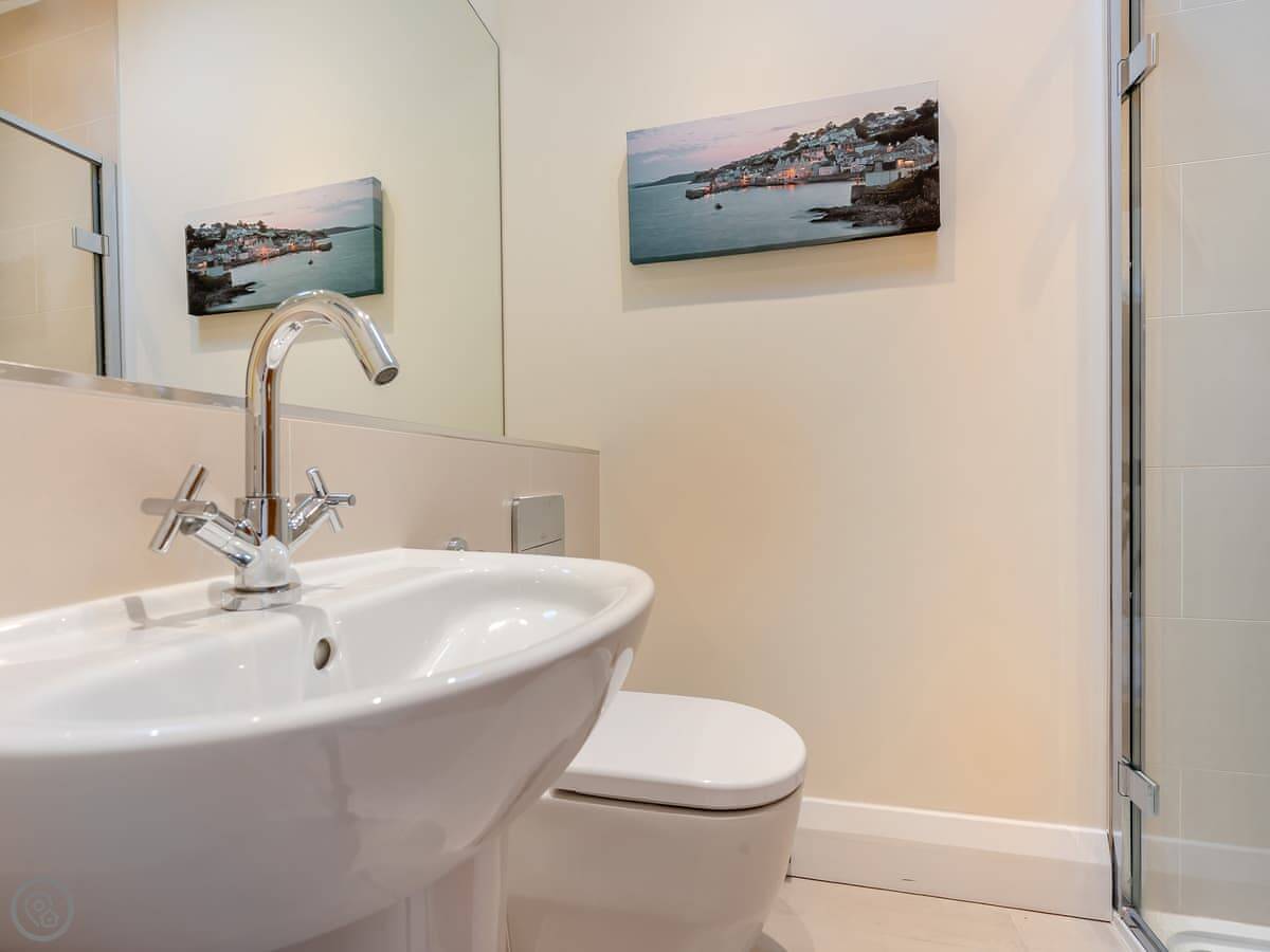 Three of the bedrooms are downstairs. Two can be set up as twins or doubles, they each have an ensuite shower room. There's a third single room down there as well, and a separate shower room. Upstairs is the main bedroom. It has doors that open onto a Juliet balcony, so you get the best view from there. It's got an ensuite bathroom with a shower over the bath.