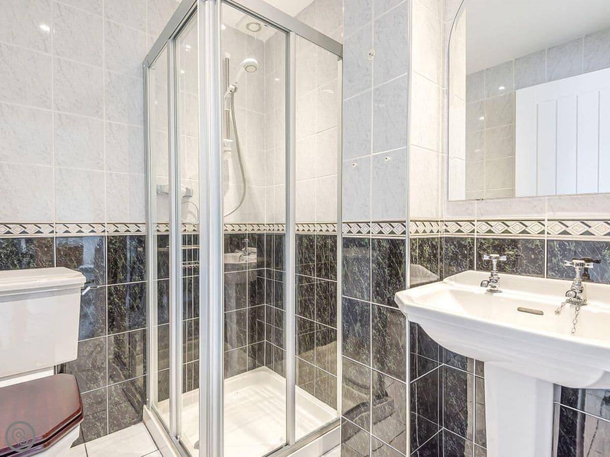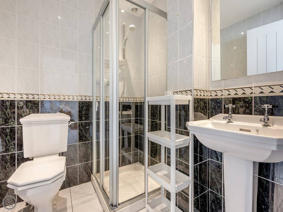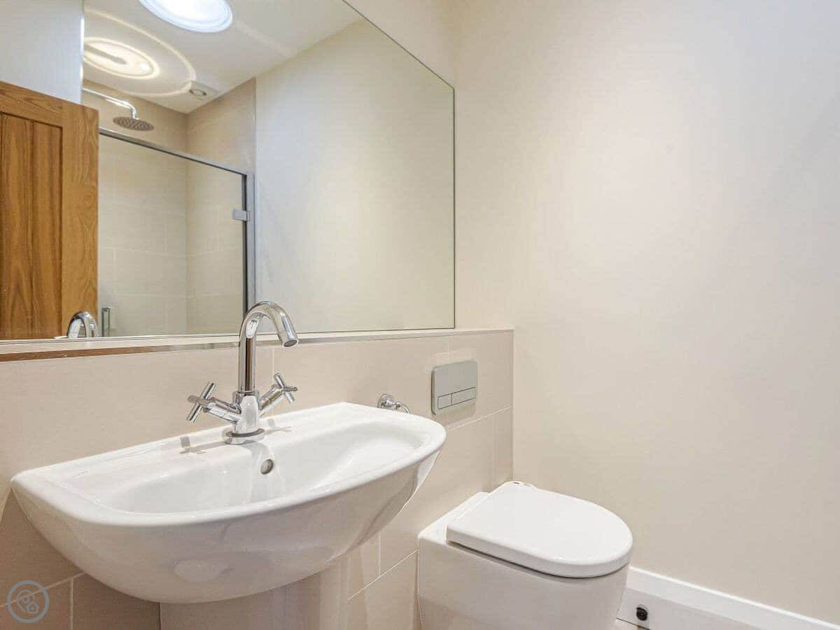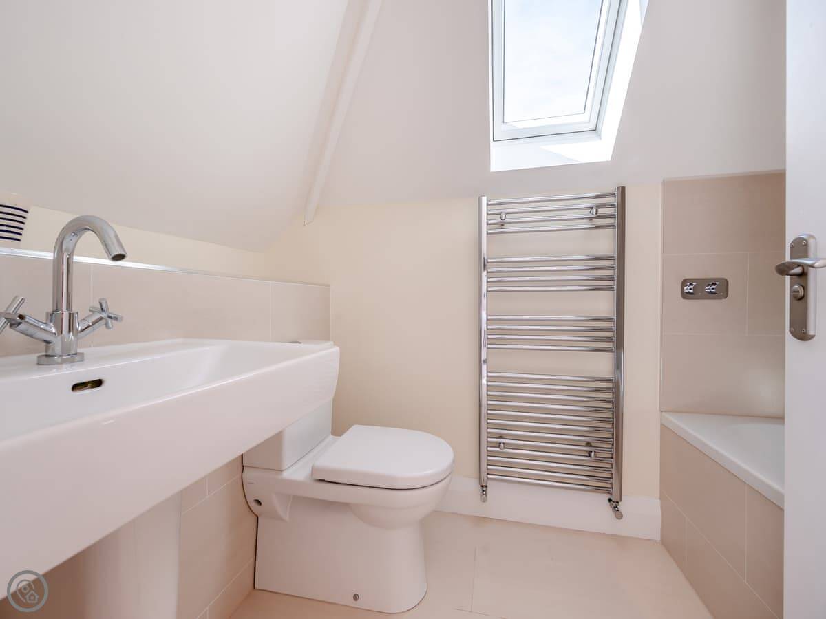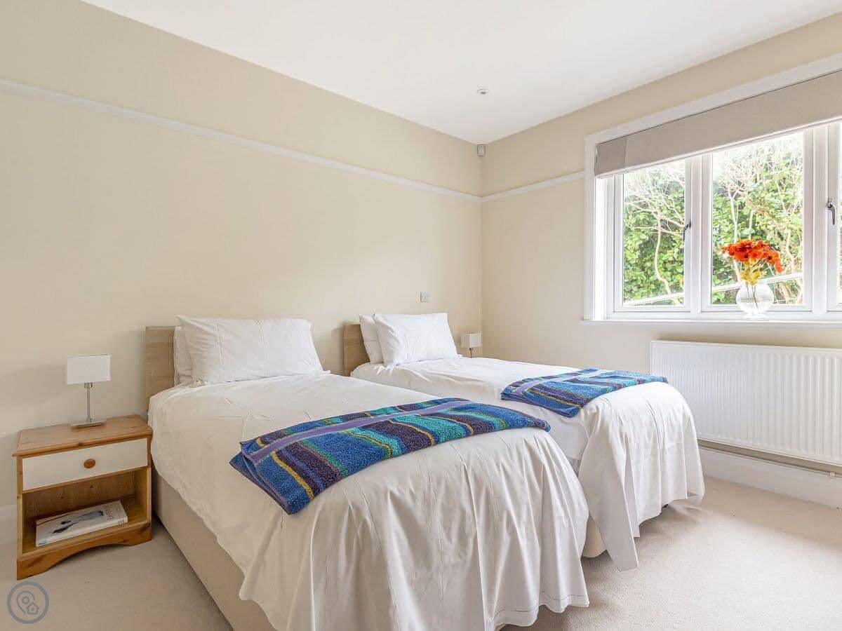 Three of the bedrooms are downstairs. Two can be set up as twins or doubles, they each have an ensuite shower room. There's a third single room down there as well, and a separate shower room. Upstairs is the main bedroom. It has doors that open onto a Juliet balcony, so you get the best view from there. It's got an ensuite bathroom with a shower over the bath.