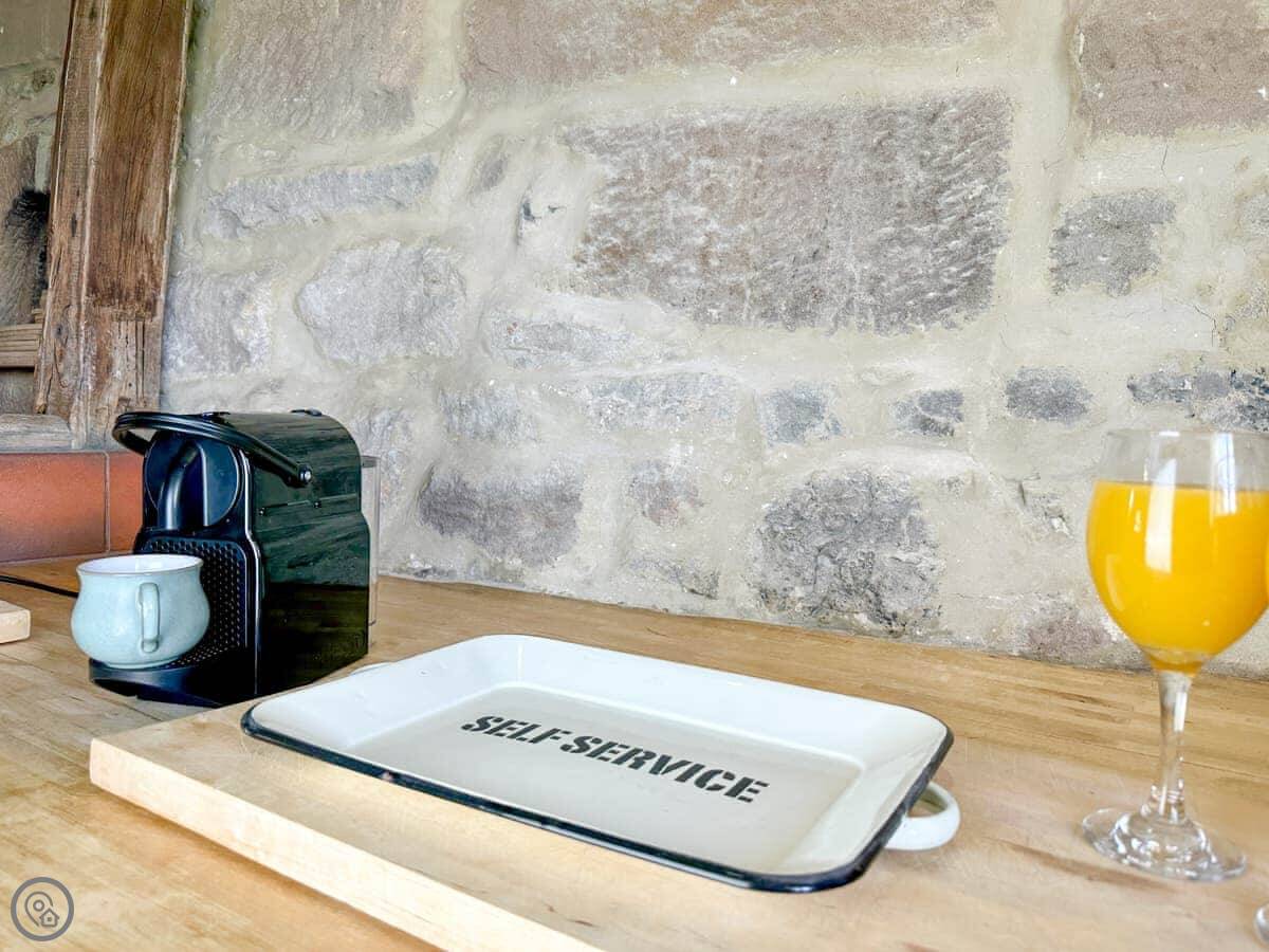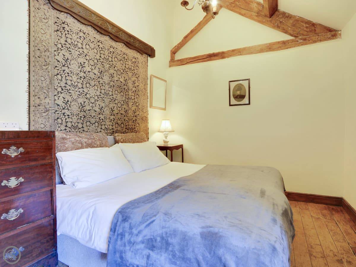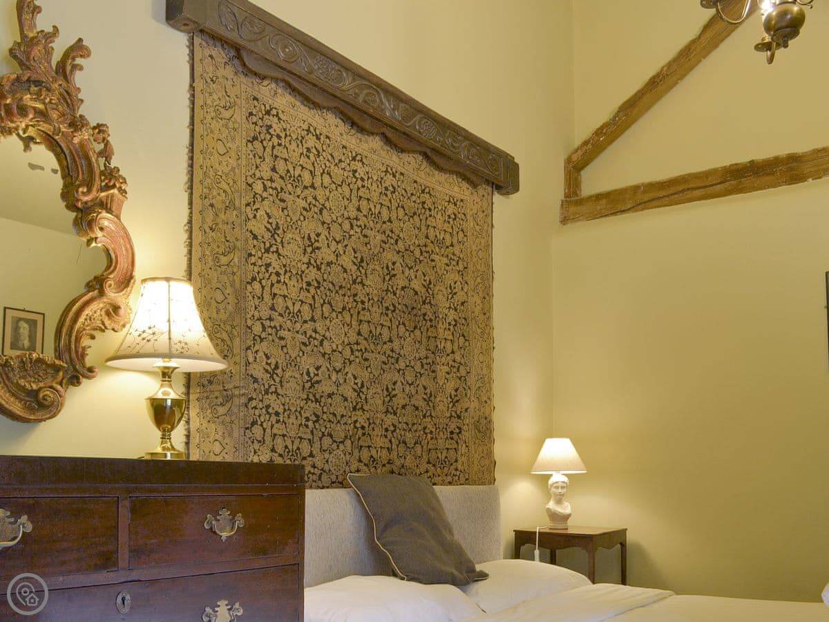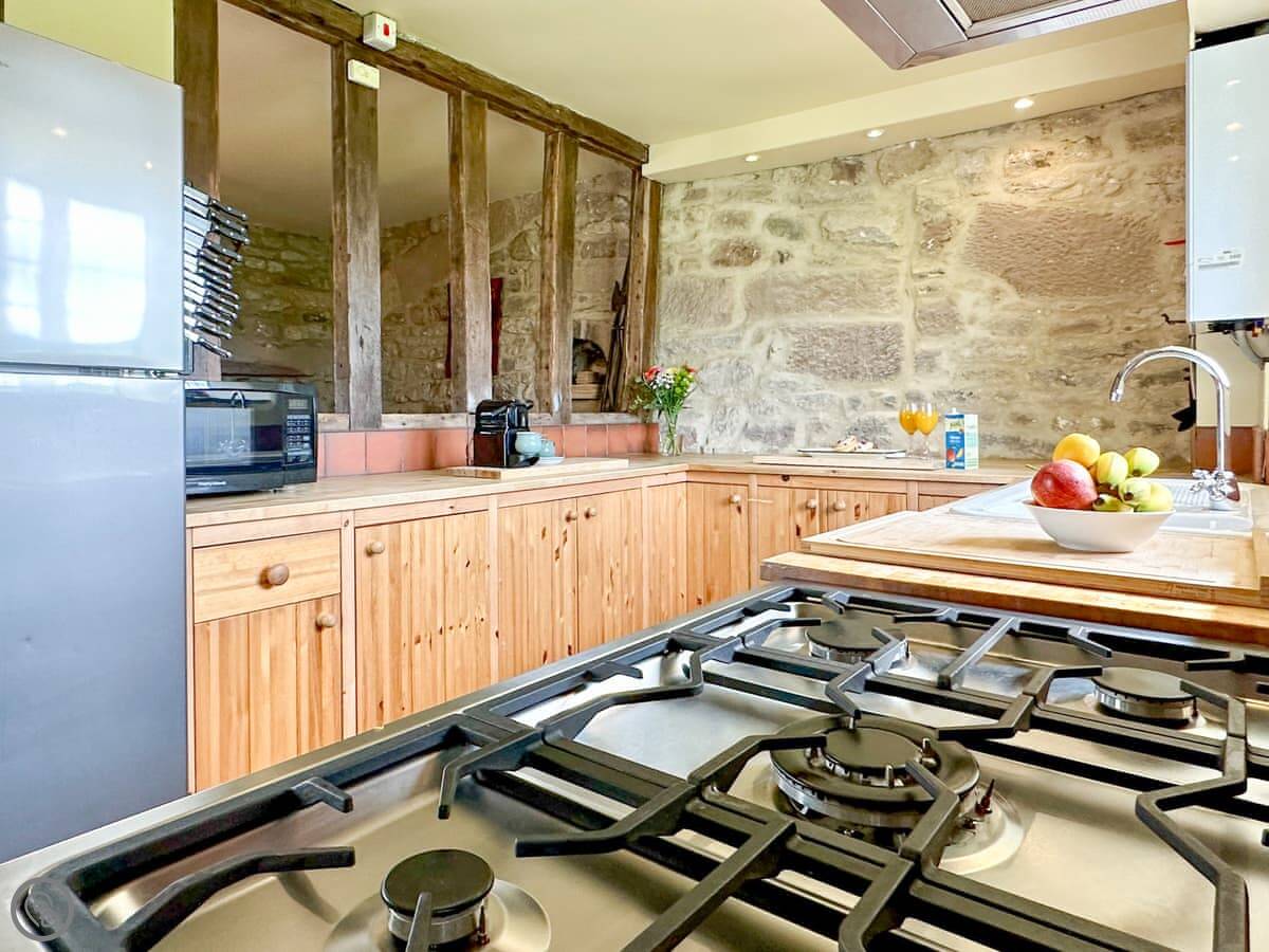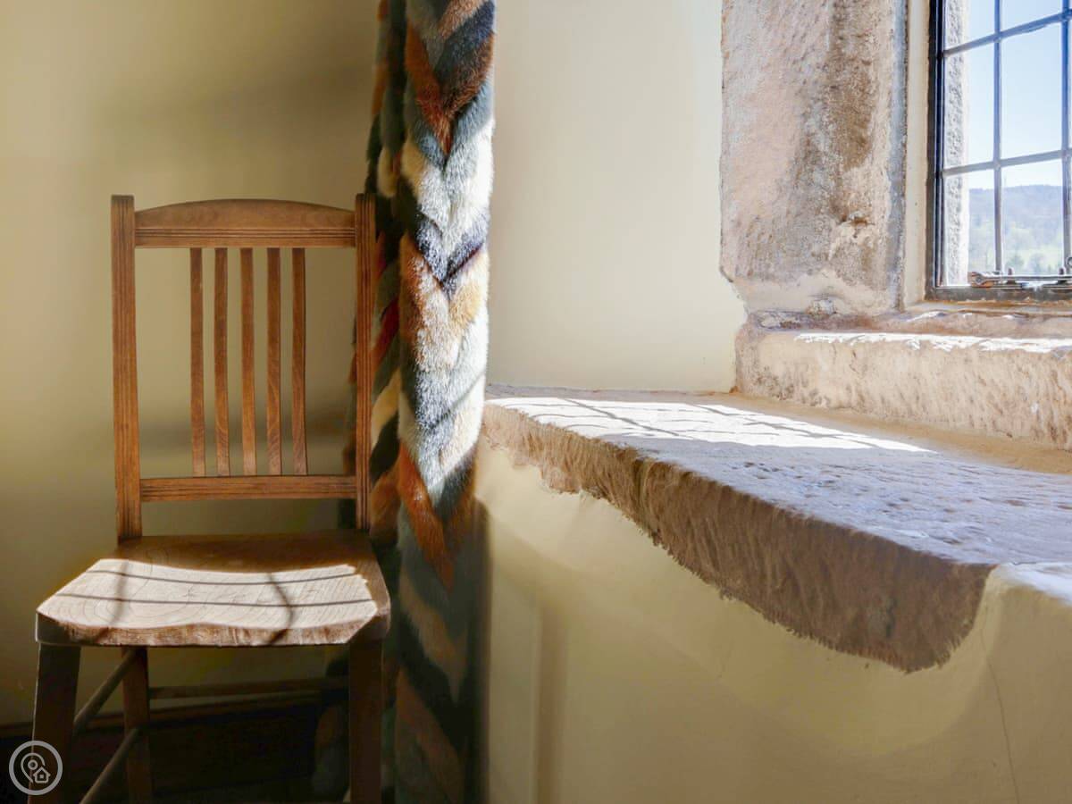 The building is old, so you get thick stone walls, wooden beams, and flagstone floors. The windows are the original mullion type. It's part of a small courtyard with a few other cottages.