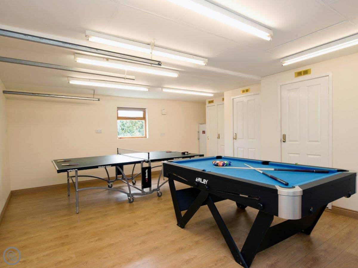 The main bit has a living room with a wood burner, a dining area, a kitchen, and a south-facing conservatory. There's a separate games room a few steps away with a pool table and table tennis. Above that is a studio room with its own ensuite. It's good if part of the group wants a bit of space.