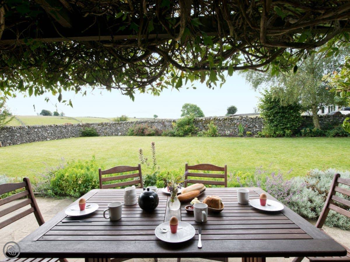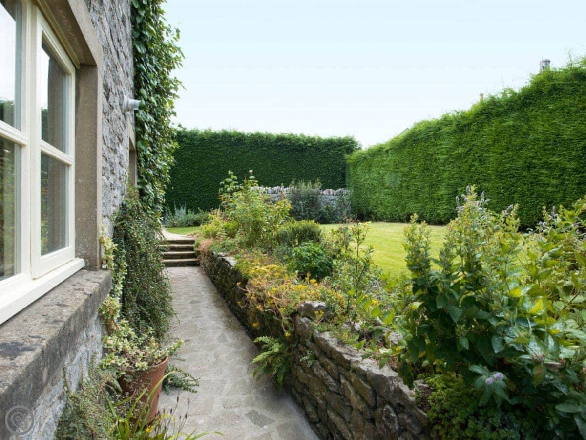 The garden is enclosed. It's got a patio with a built-in barbecue, a couple of lawns, and parking for four cars. The pub is about a hundred yards away. It's friendly and does good food.