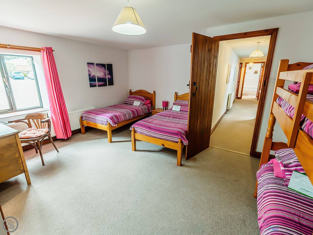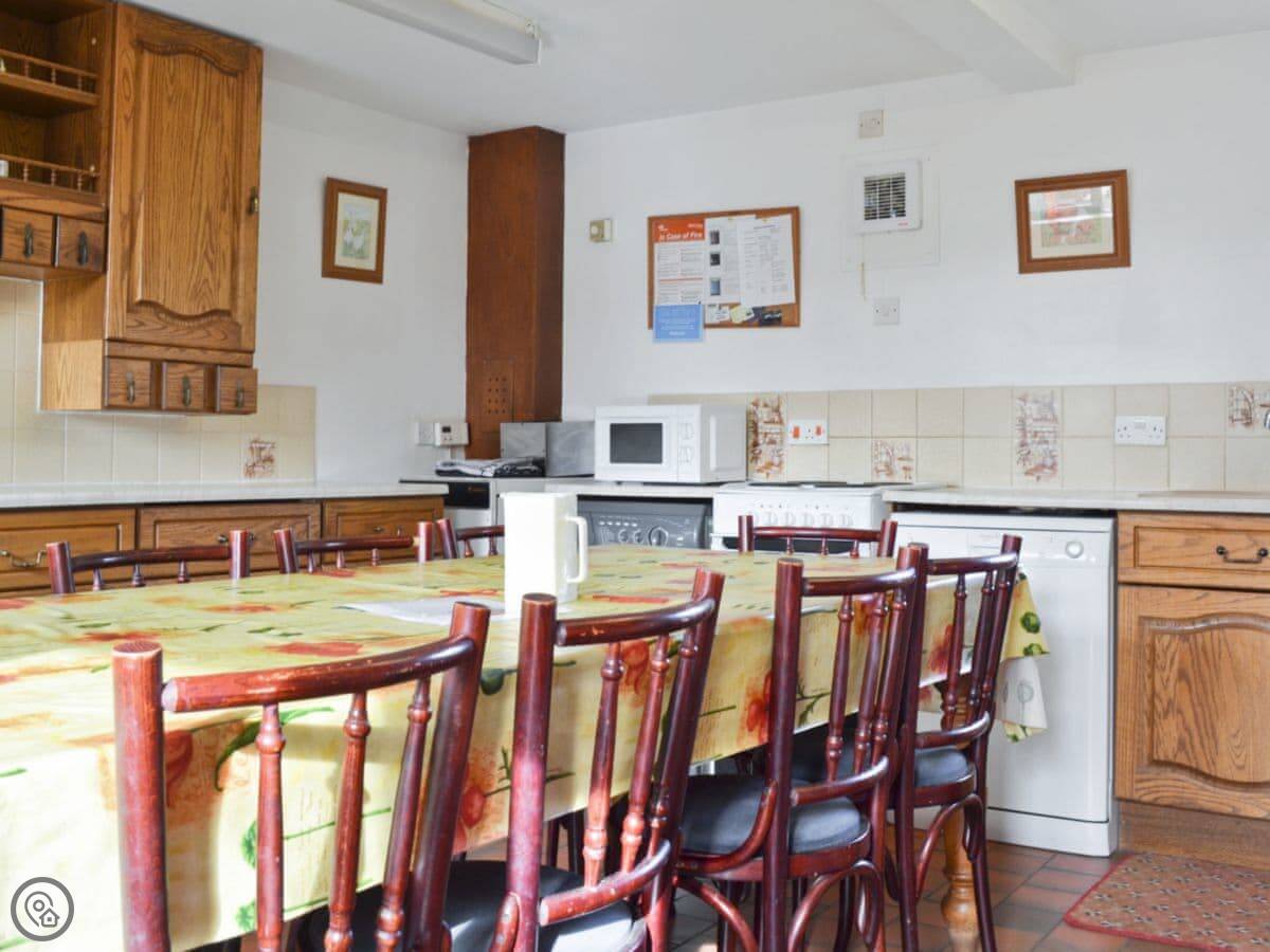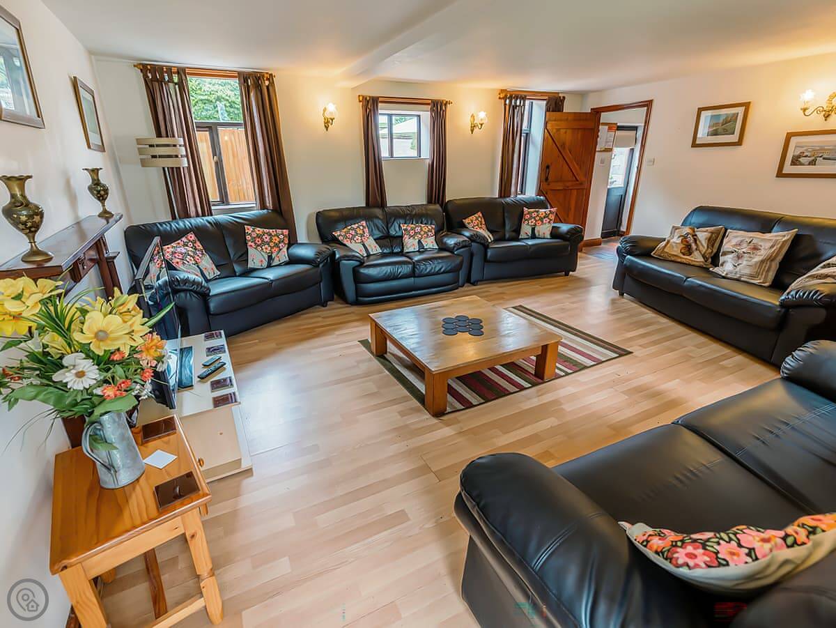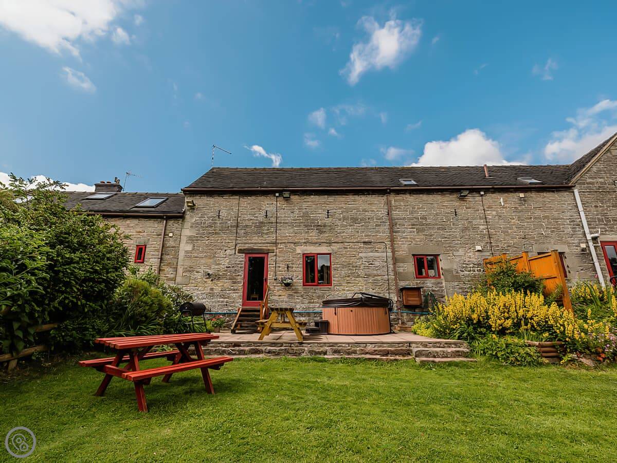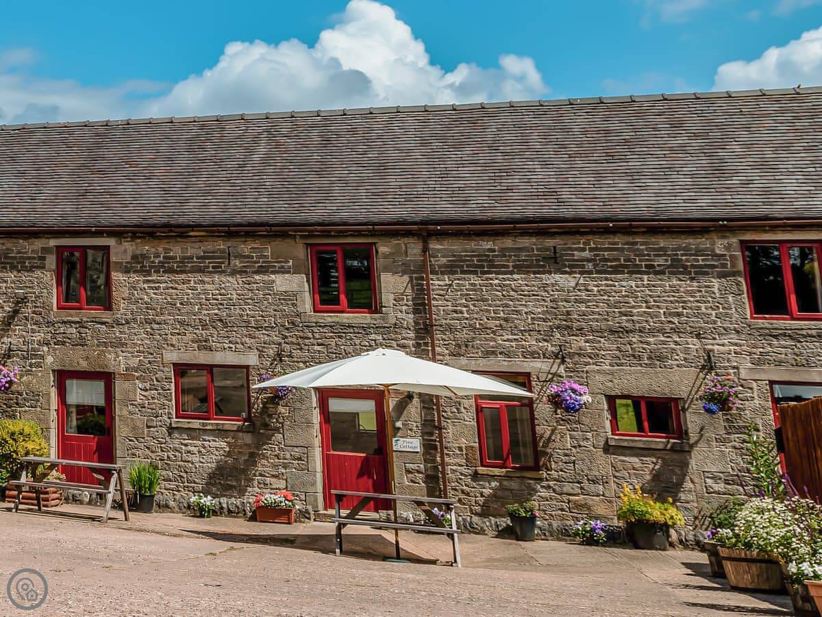 Pine Cottage is in Waterhouses, right on the edge of the Peak District. It’s one of a group of barns in a courtyard. It sleeps twelve, with four bedrooms. There are three bathrooms, which should help with that many people.
