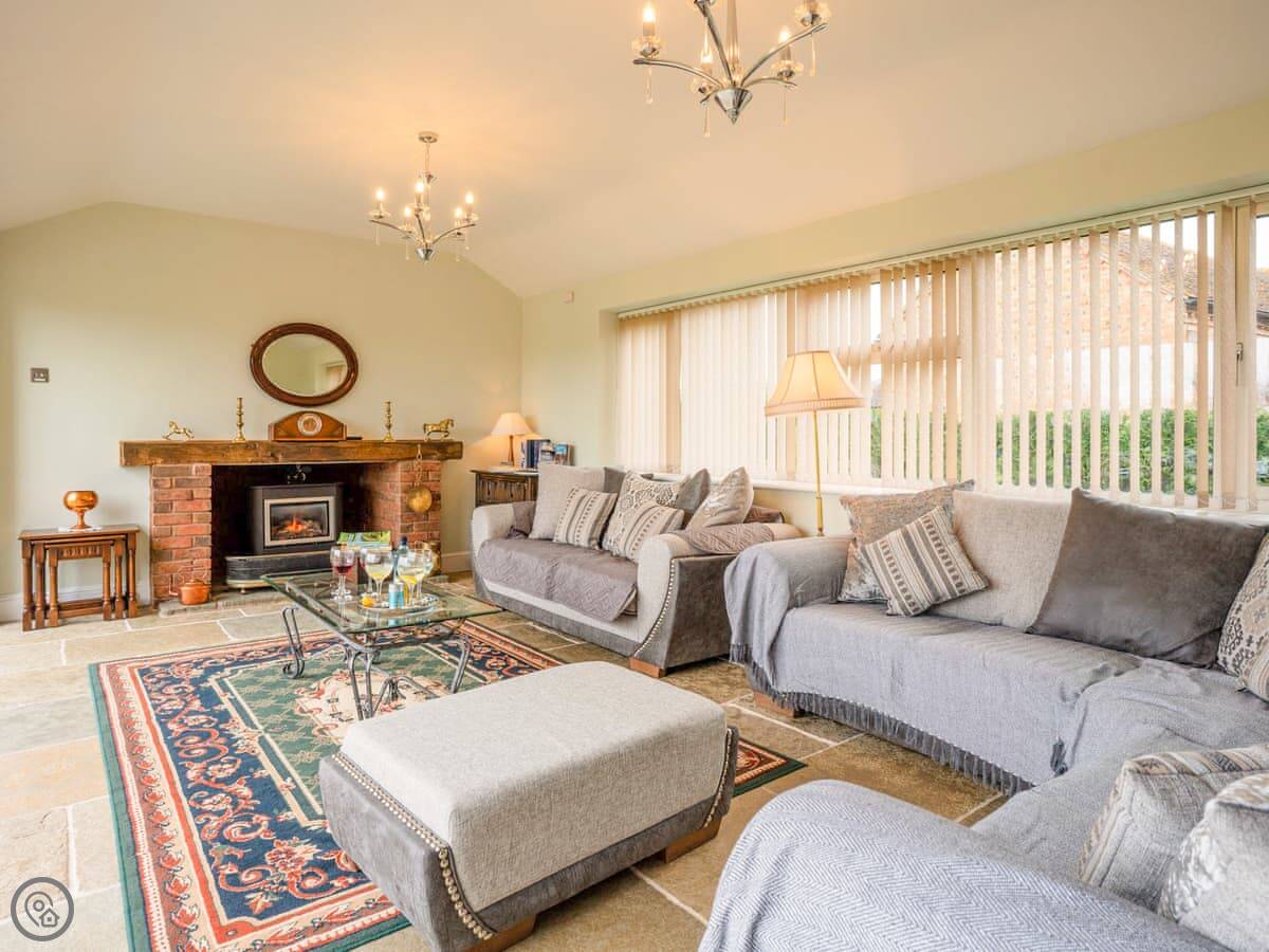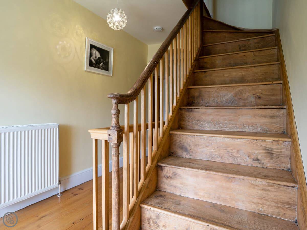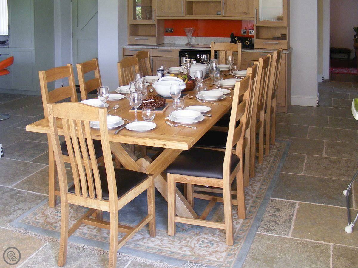 It sleeps up to ten people. Five bedrooms, three bathrooms. It has a 5 Star rating, which means it’s well-equipped and kept to a high standard. The kitchen has an electric Aga and a steam cooker. There’s a wood burner in the sitting room.