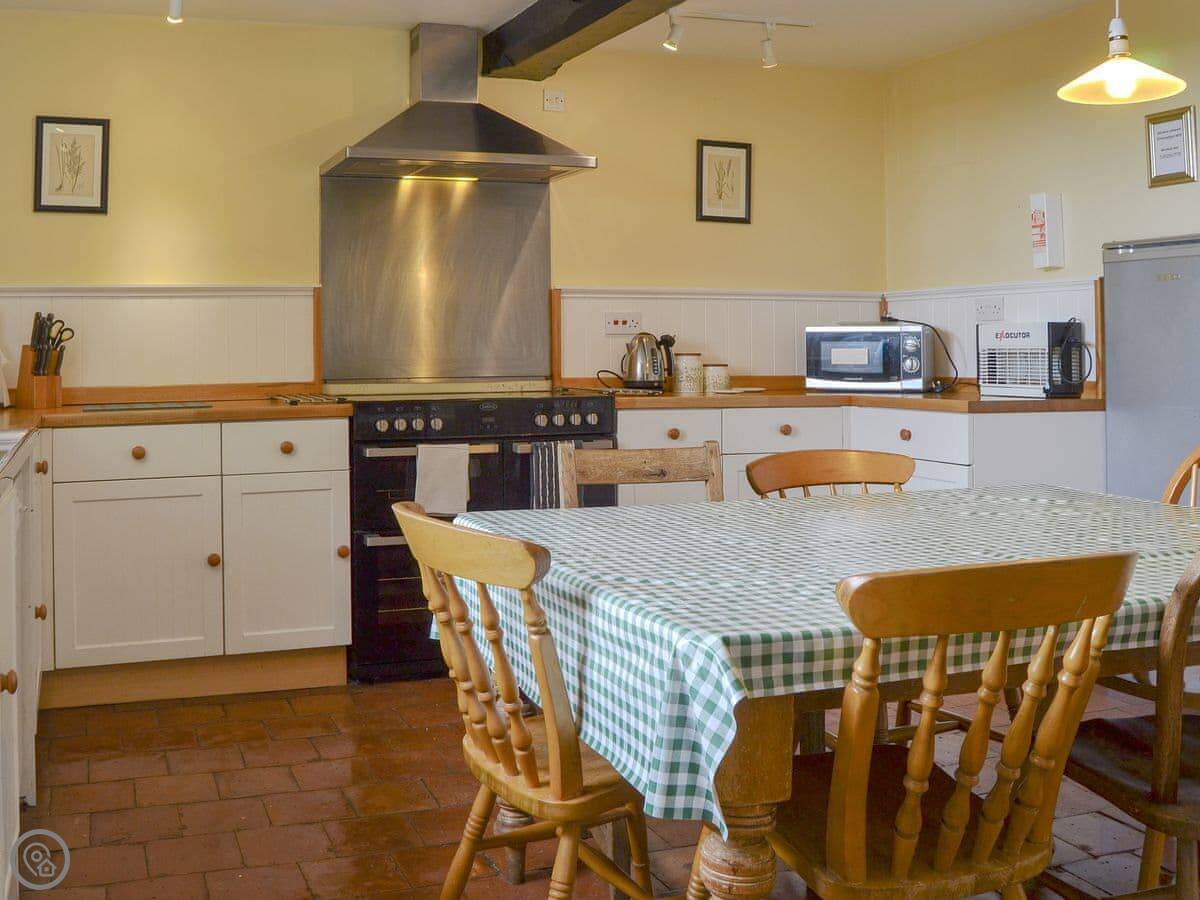 The kitchen is farmhouse-style, it's got what you need. The dining area is large, good for a big group. There's a washing machine, a dishwasher, and a BBQ outside. Bedding and towels are included. You can bring up to two dogs.