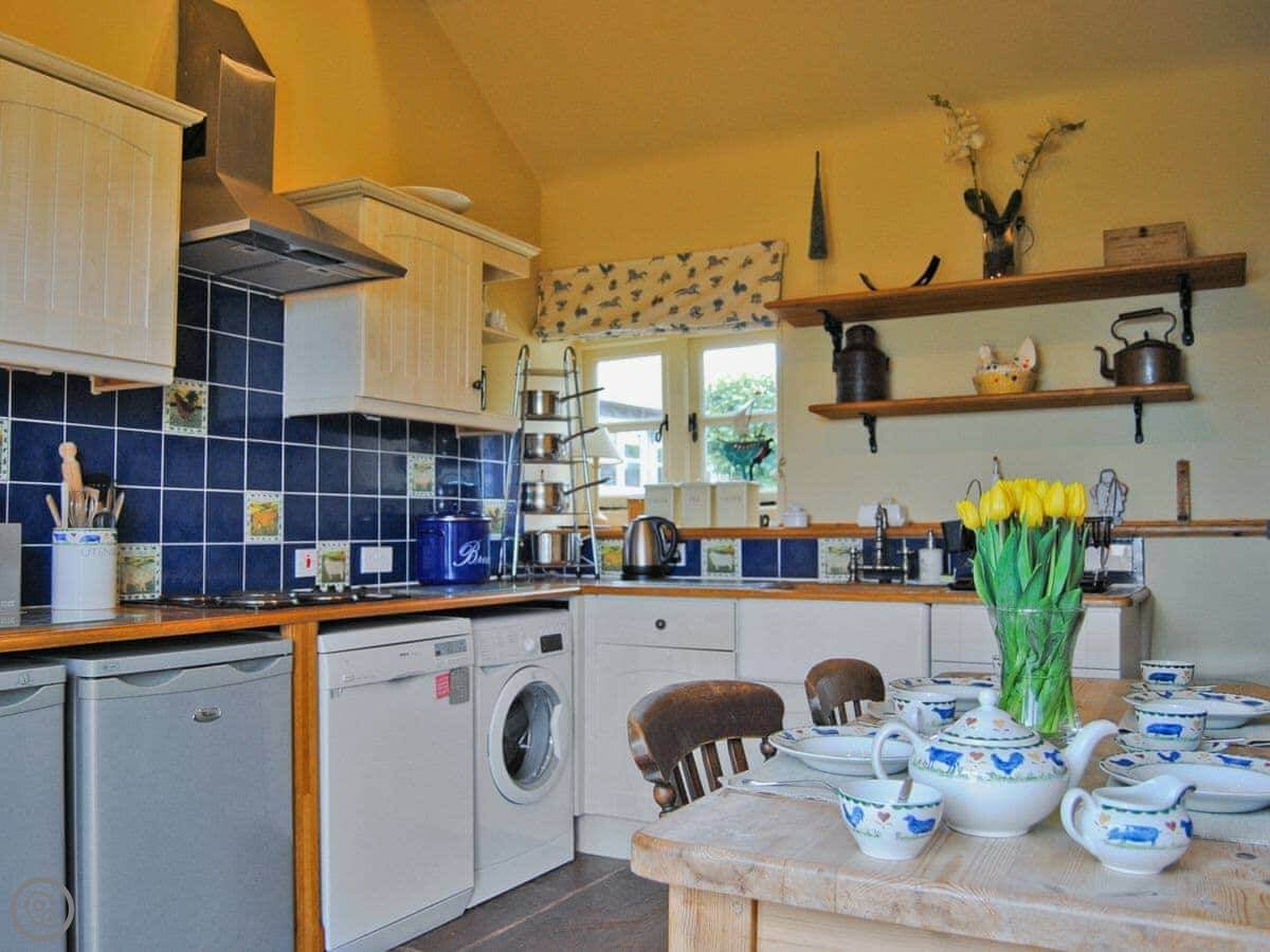 Inside, there's a woodburning stove for cooler evenings, a TV, and WiFi. There's a dishwasher and a washing machine. Bedding and towels are included. We can provide a cot and highchair. Parking is right outside.