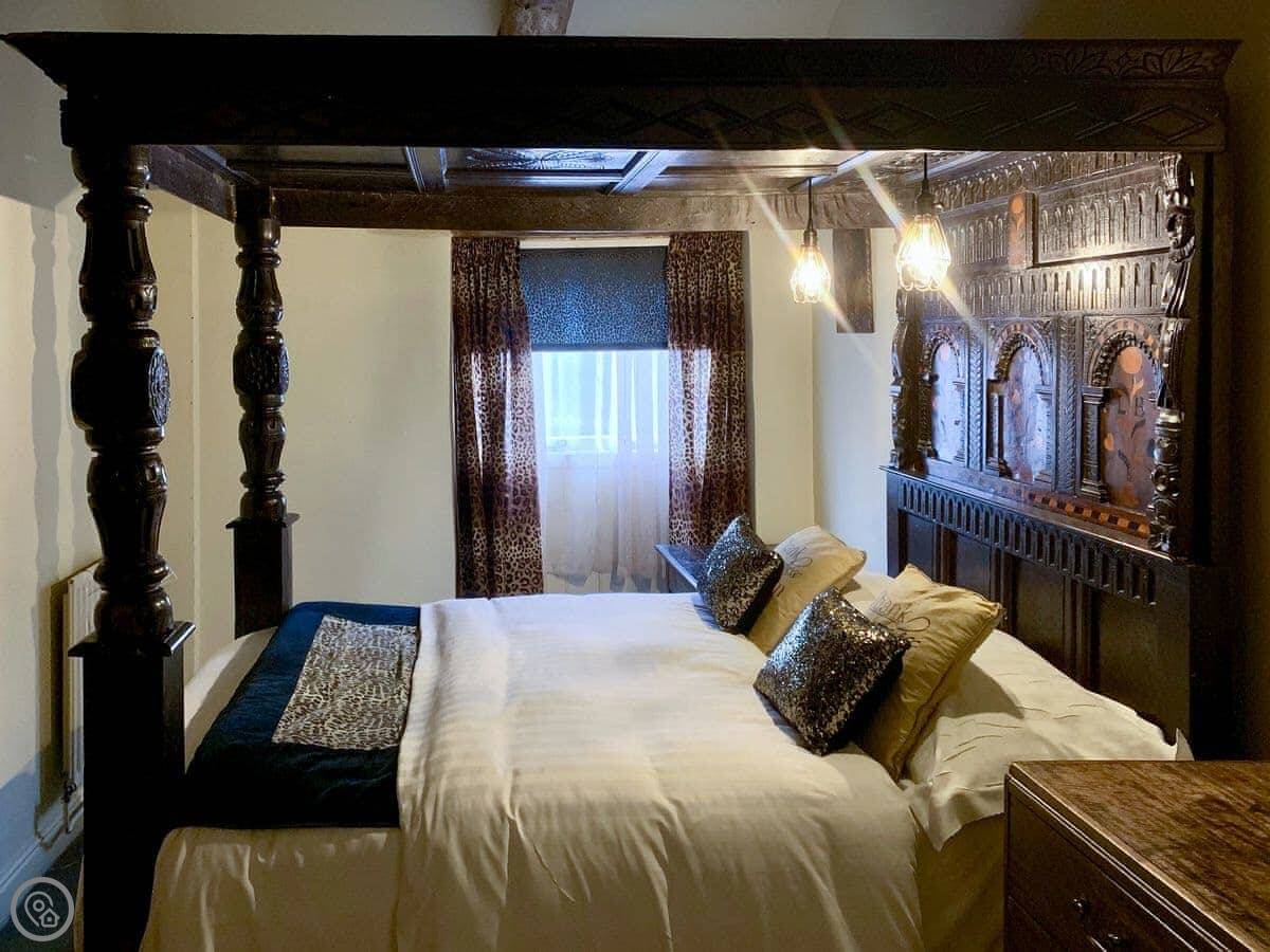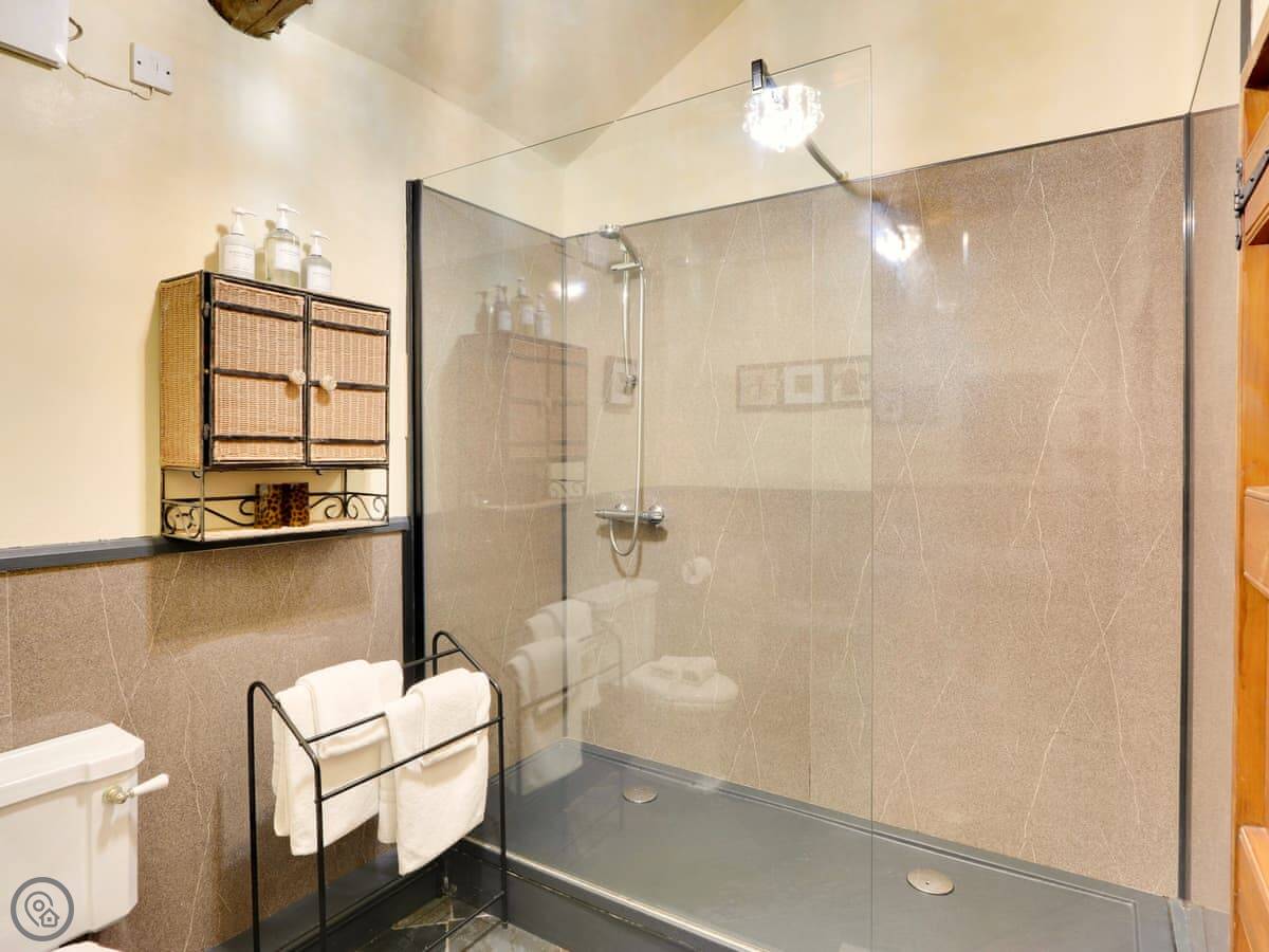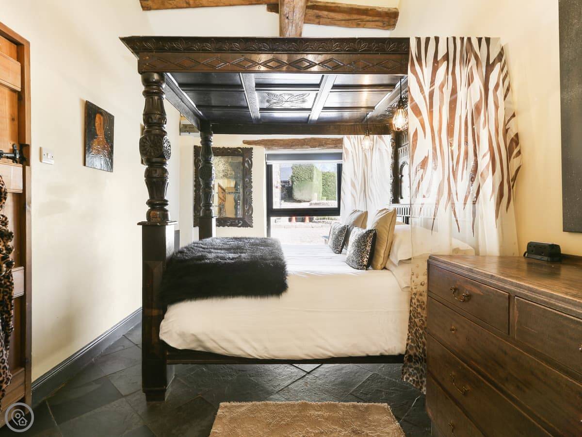 The cottage is for two people. One bedroom, one bathroom. It's a 4 Star, which means it's comfortable and well-finished. The walls are stone, the floors are flagstone, and there are oak beams. It's the sort of place that feels solid.