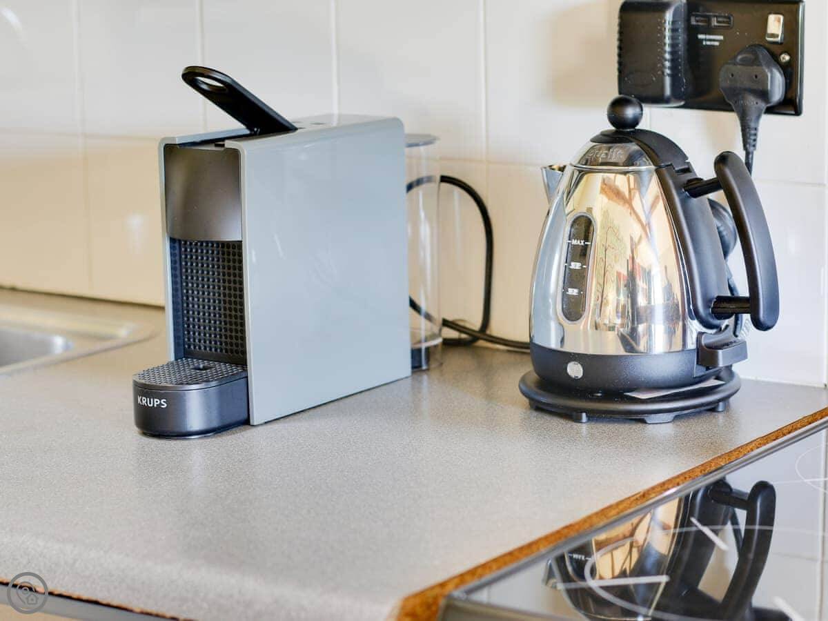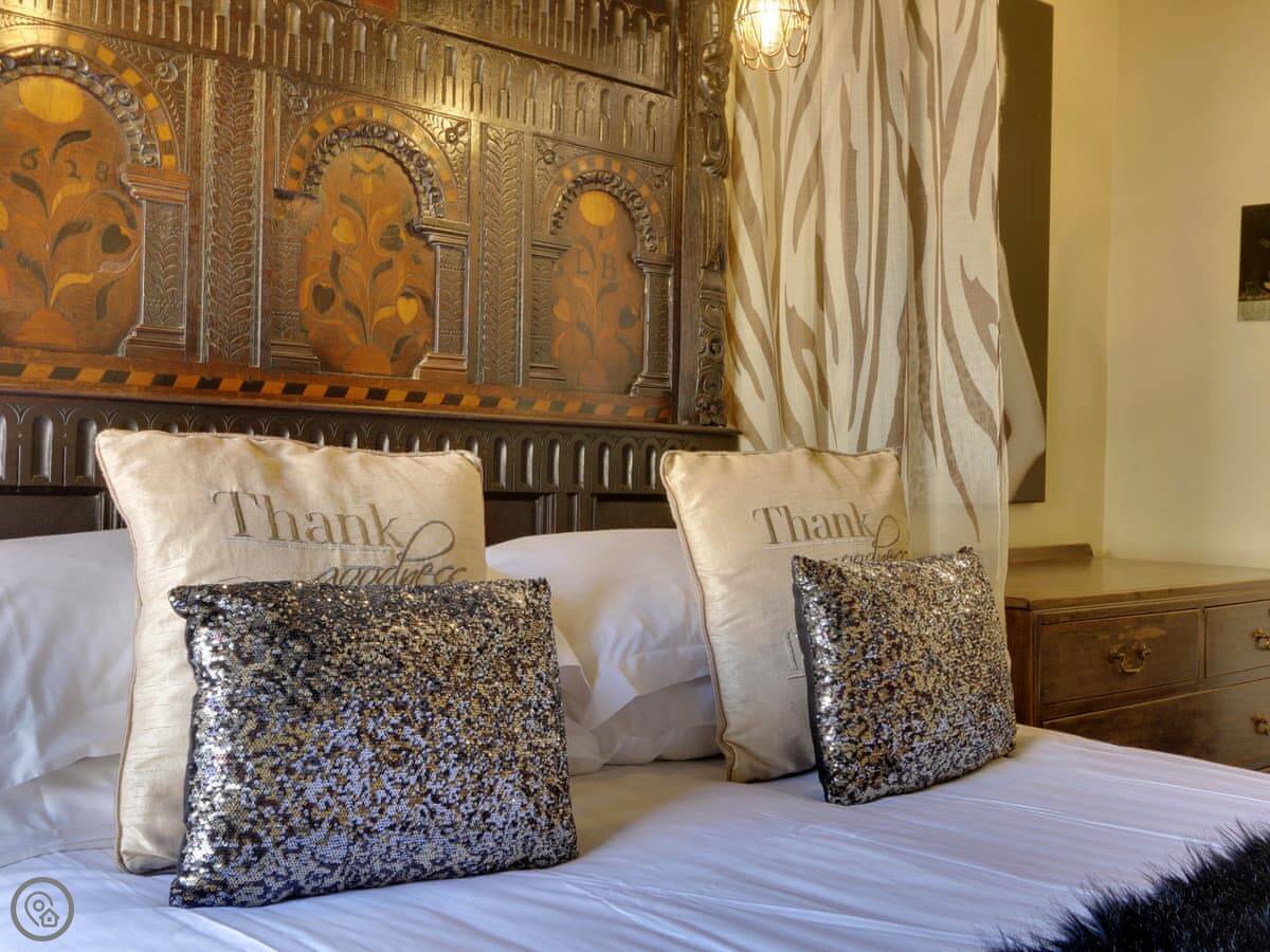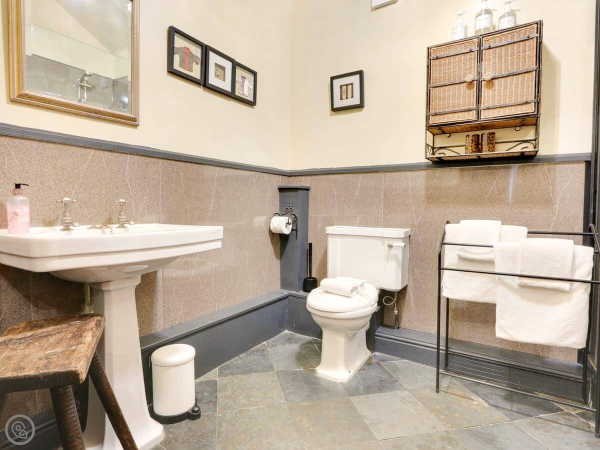 The cottage is for two people. One bedroom, one bathroom. It's a 4 Star, which means it's comfortable and well-finished. The walls are stone, the floors are flagstone, and there are oak beams. It's the sort of place that feels solid.
