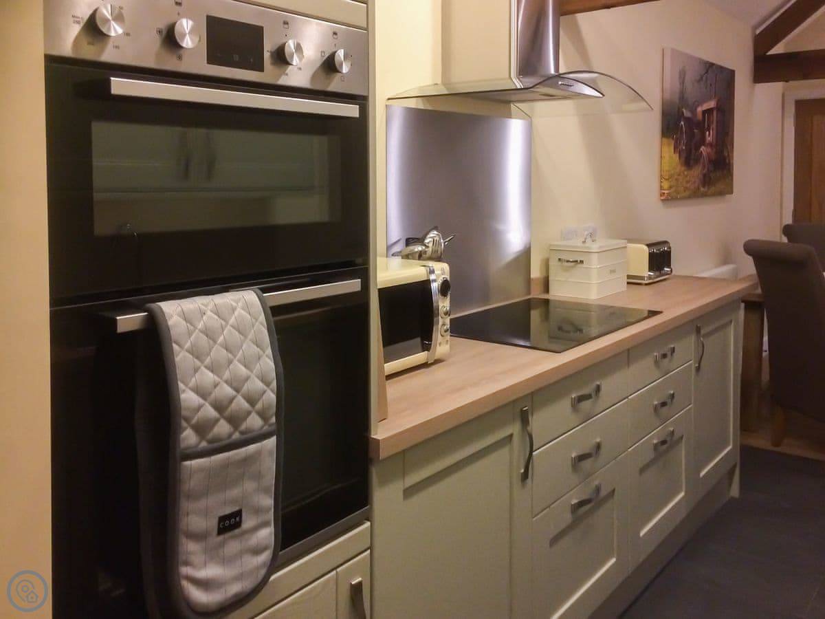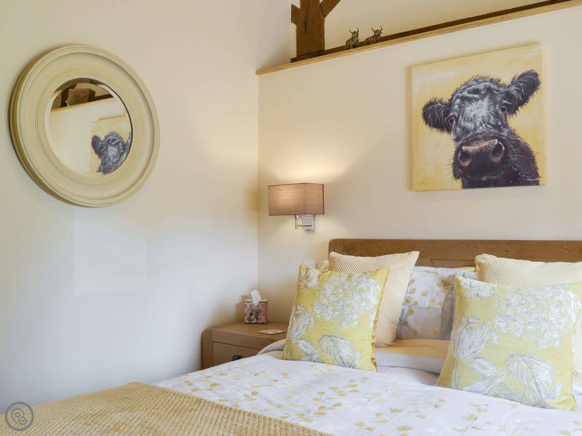 From the front door you walk into the vaulted open plan living area with beautifully restored original exposed beams. A relaxing lounge area with a 50” TV and multi-fuel wood burner, perfect for cosy, romantic nights in. The dining area accommodates four diners to allow for social dining when The Parlour is booked with The Dairy. The living space leads you through into the fully fitted and well-equipped kitchen which includes a dishwasher and large fridge/freezer. There is a separate utility room with washing machine and large pantry. The vaulted bedroom with its exposed beams includes a well-presented feature oak bed and has an en-suite shower room which includes a large double shower cubicle. The spacious garden is equipped with a wooden table and chairs to seat up to four people and BBQ set. The lockable shed within the garden is suitable for storing bikes. There is also a 2 acre field which guests can enjoy that is shared with the owners and other guests. Shop 2½ miles, pub & restaurant 1 mile.