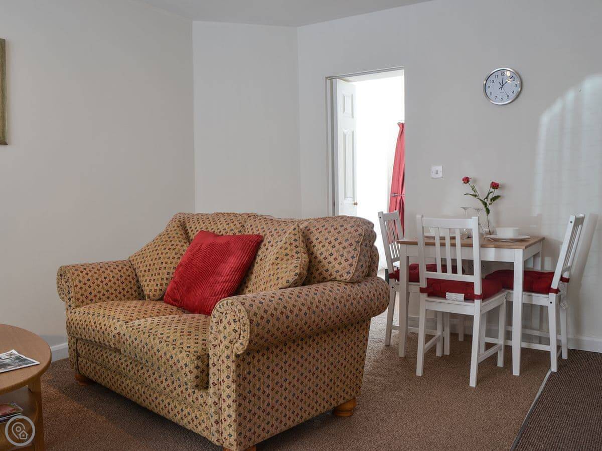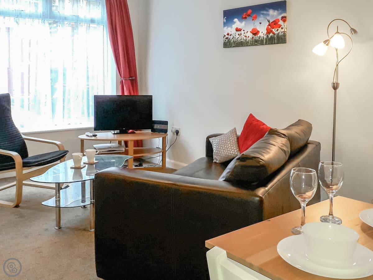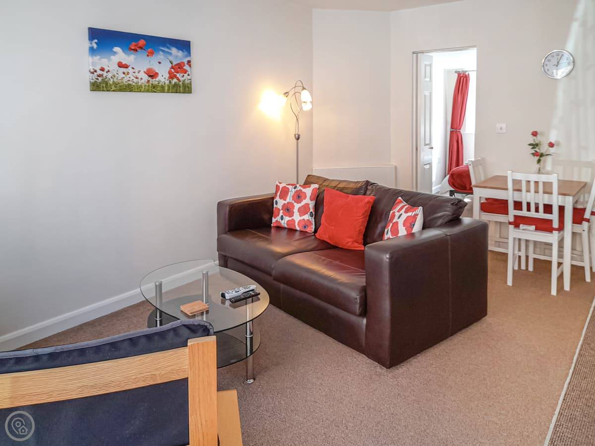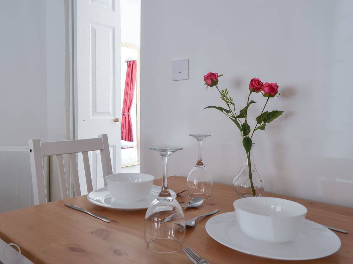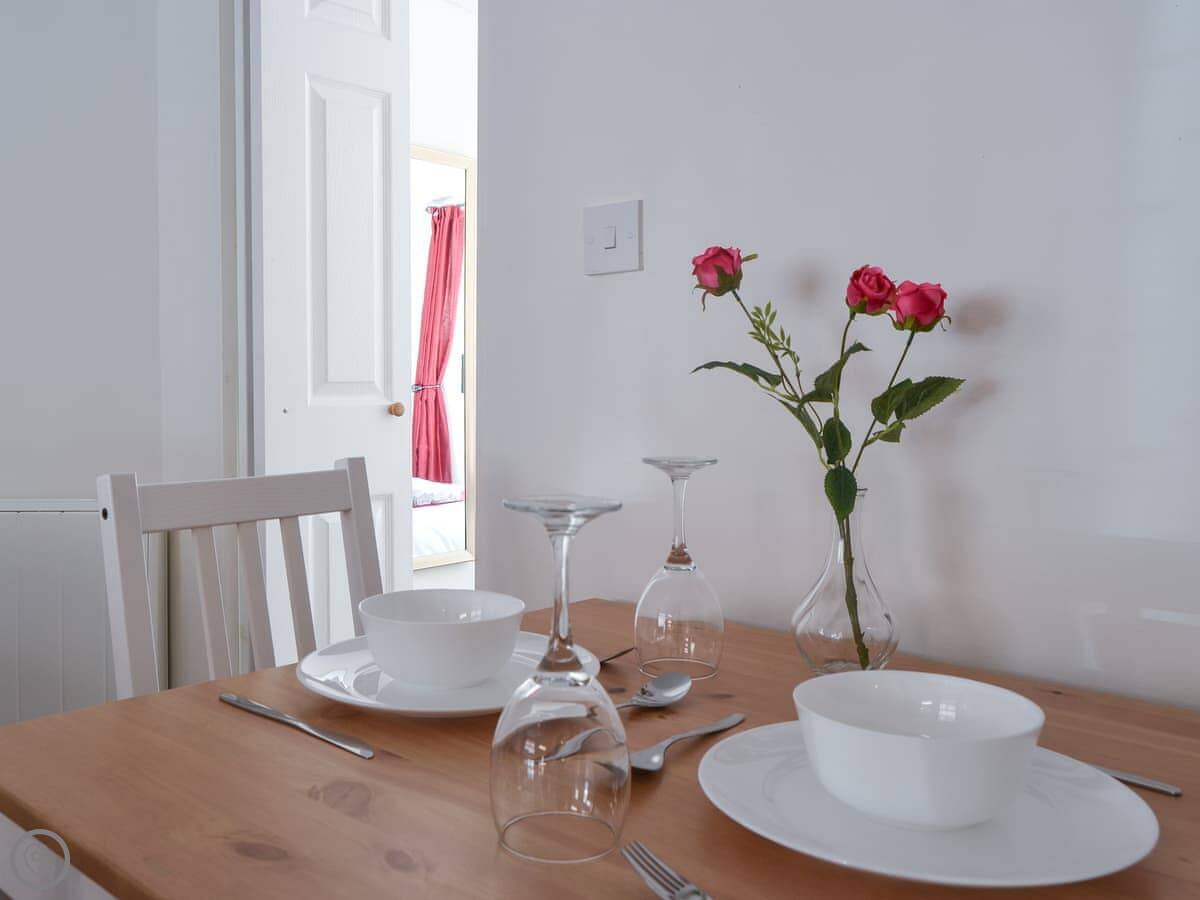 The layout is open plan inside. There's a TV and WiFi. Bedding and towels are included. There's a cot and highchair if you need them.