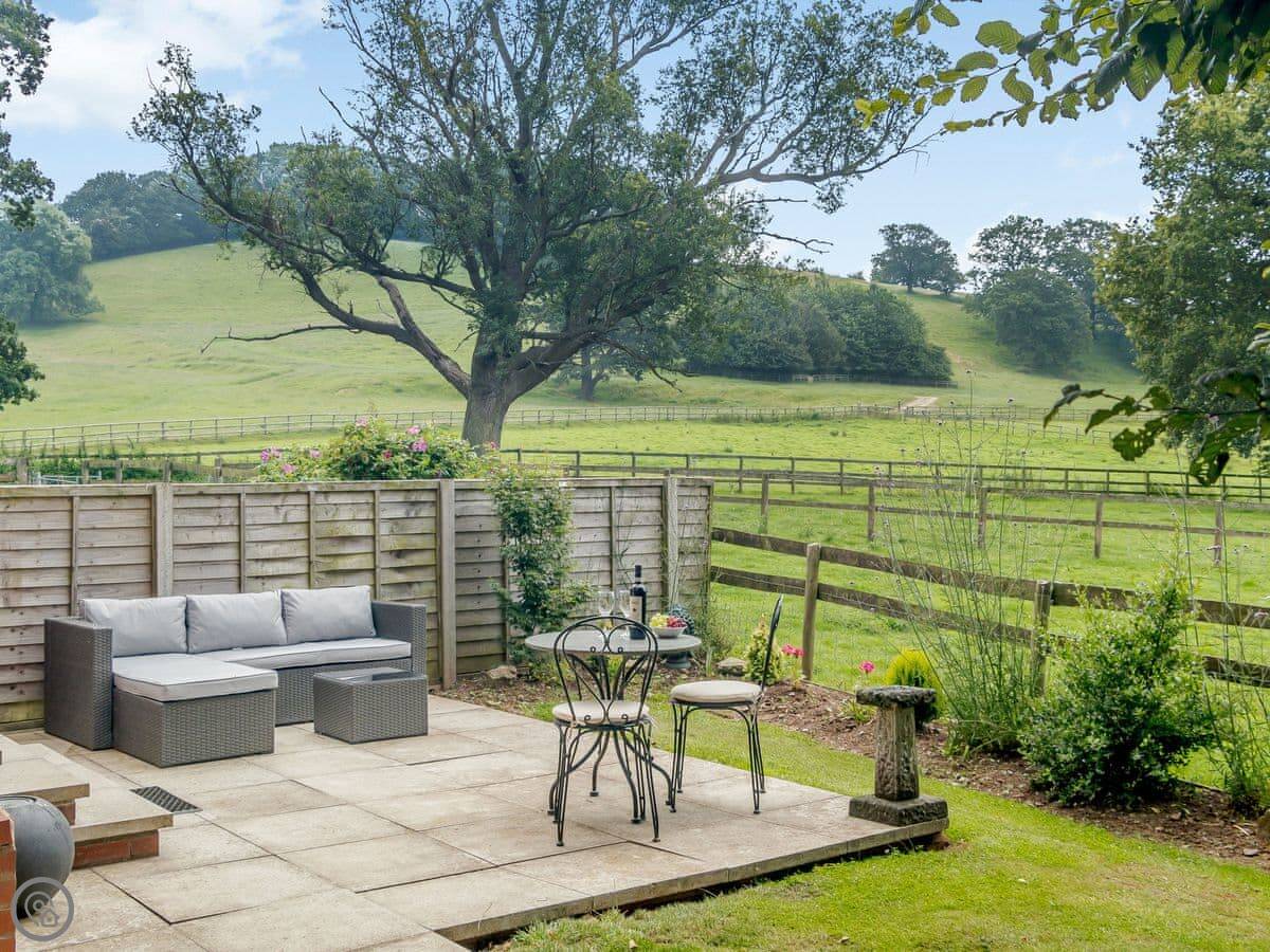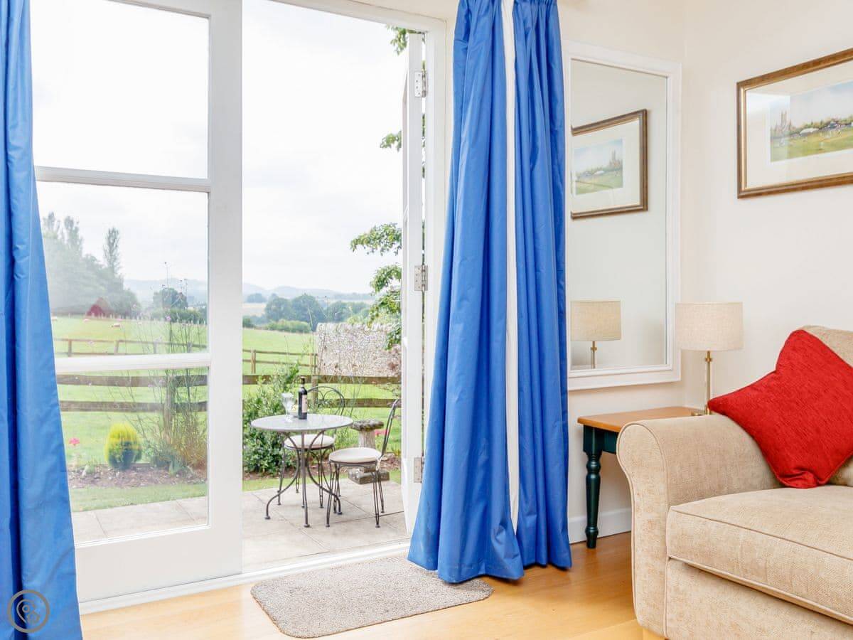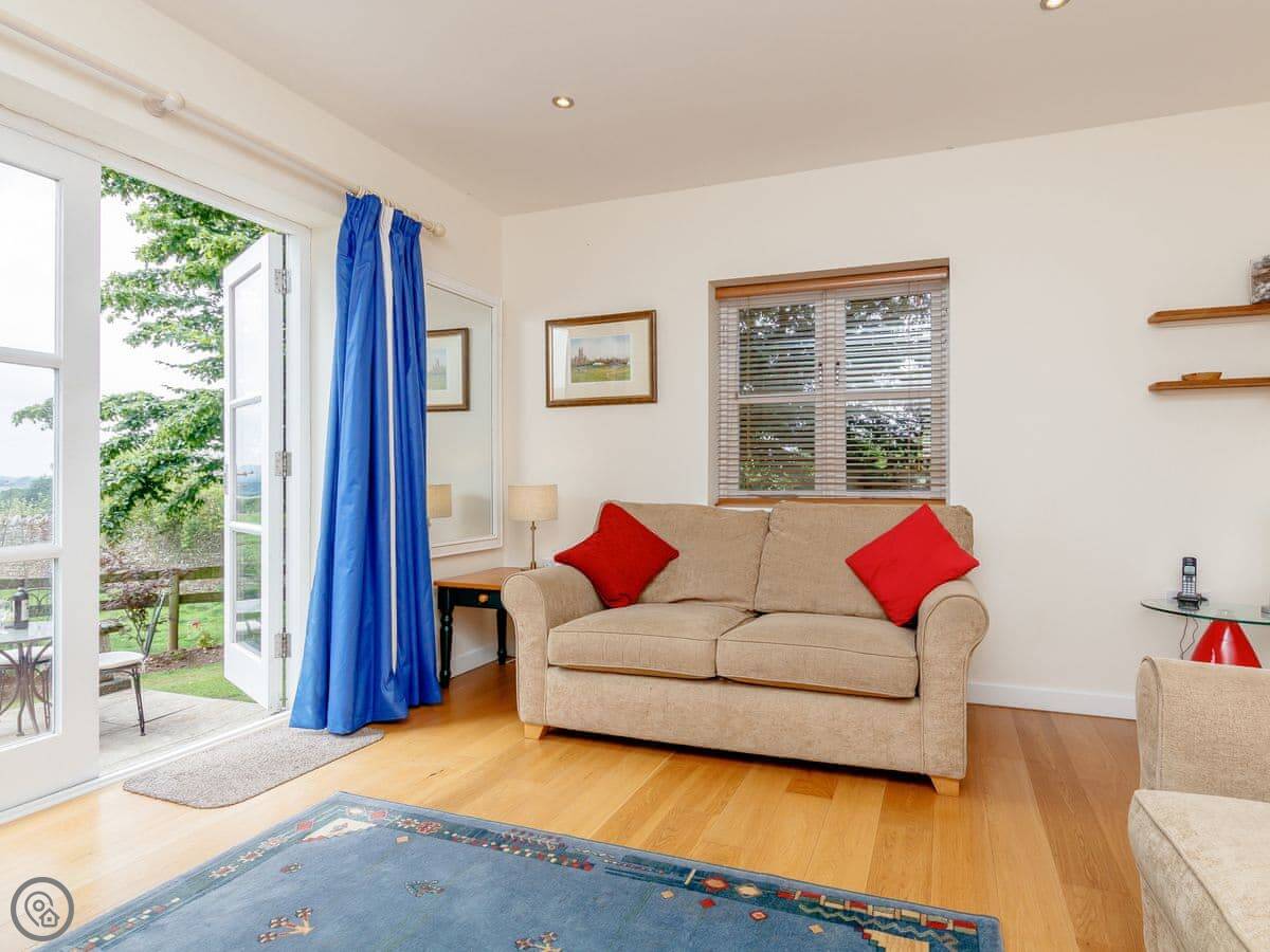 It sleeps four. Two bedrooms, one bathroom. It's got a 5 Star rating which means it's well fitted out. It was renovated in 2019. The living room has French doors that open to the garden, which looks out over farmland.