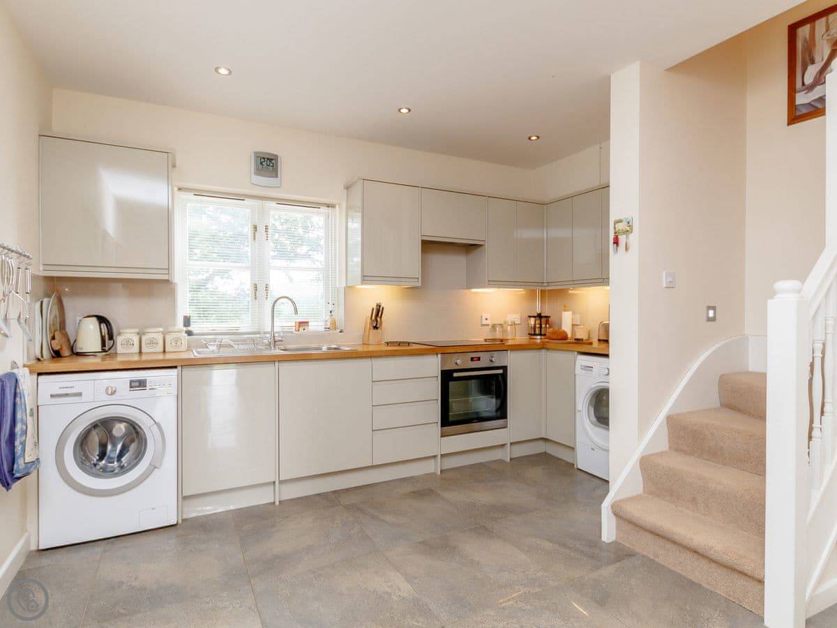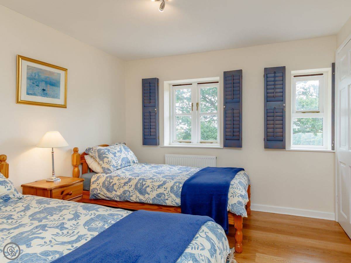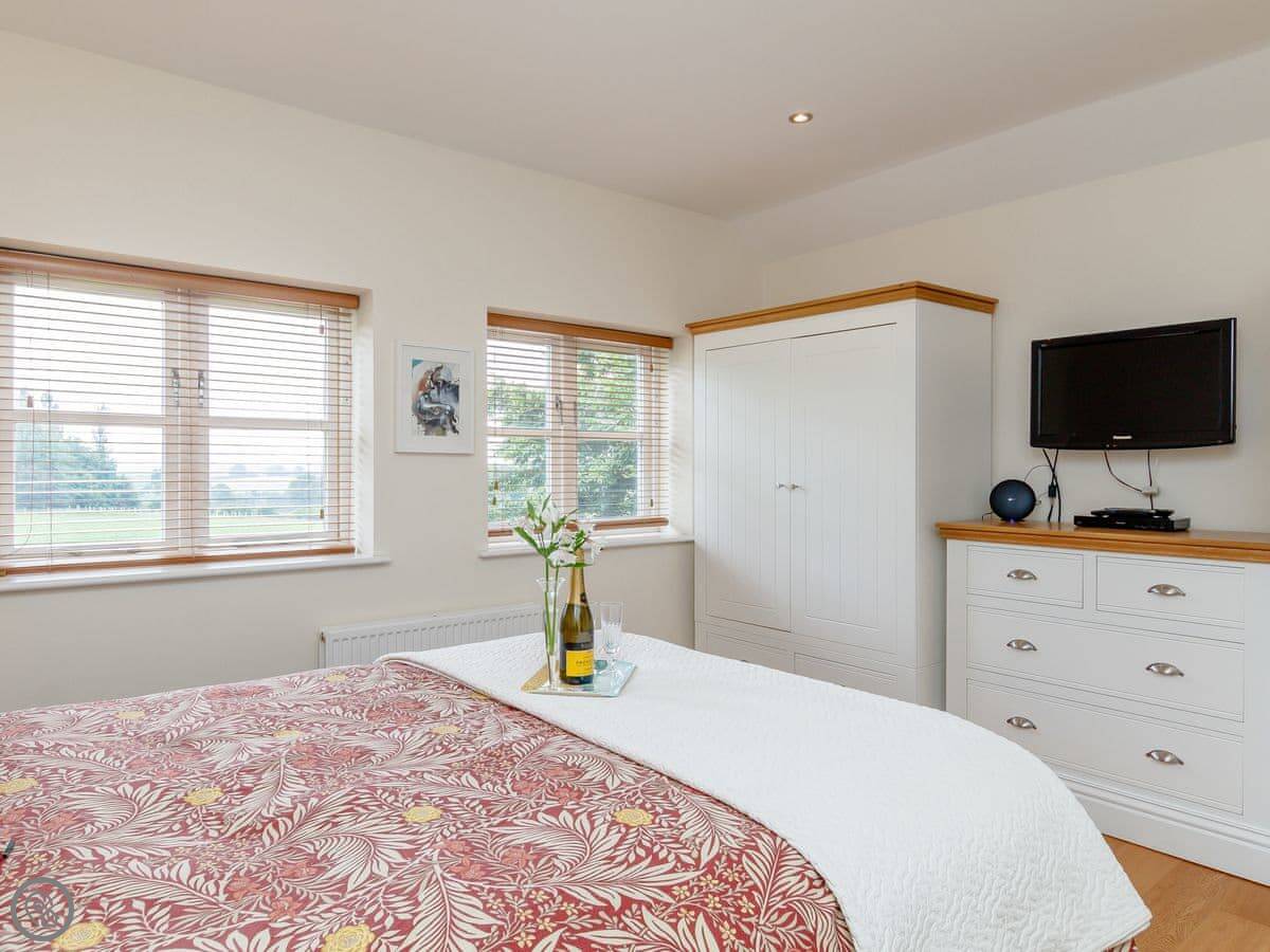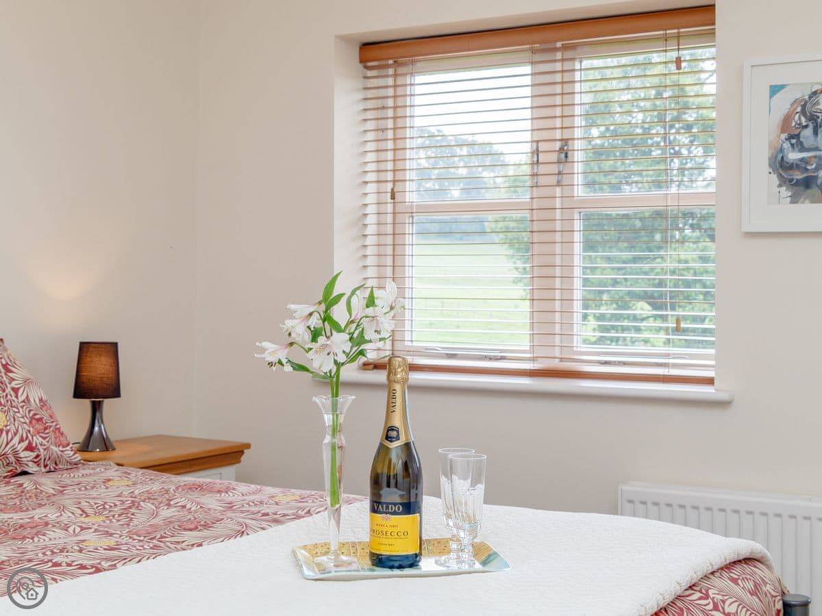 It sleeps four. Two bedrooms, one bathroom. It's got a 5 Star rating which means it's well fitted out. It was renovated in 2019. The living room has French doors that open to the garden, which looks out over farmland.