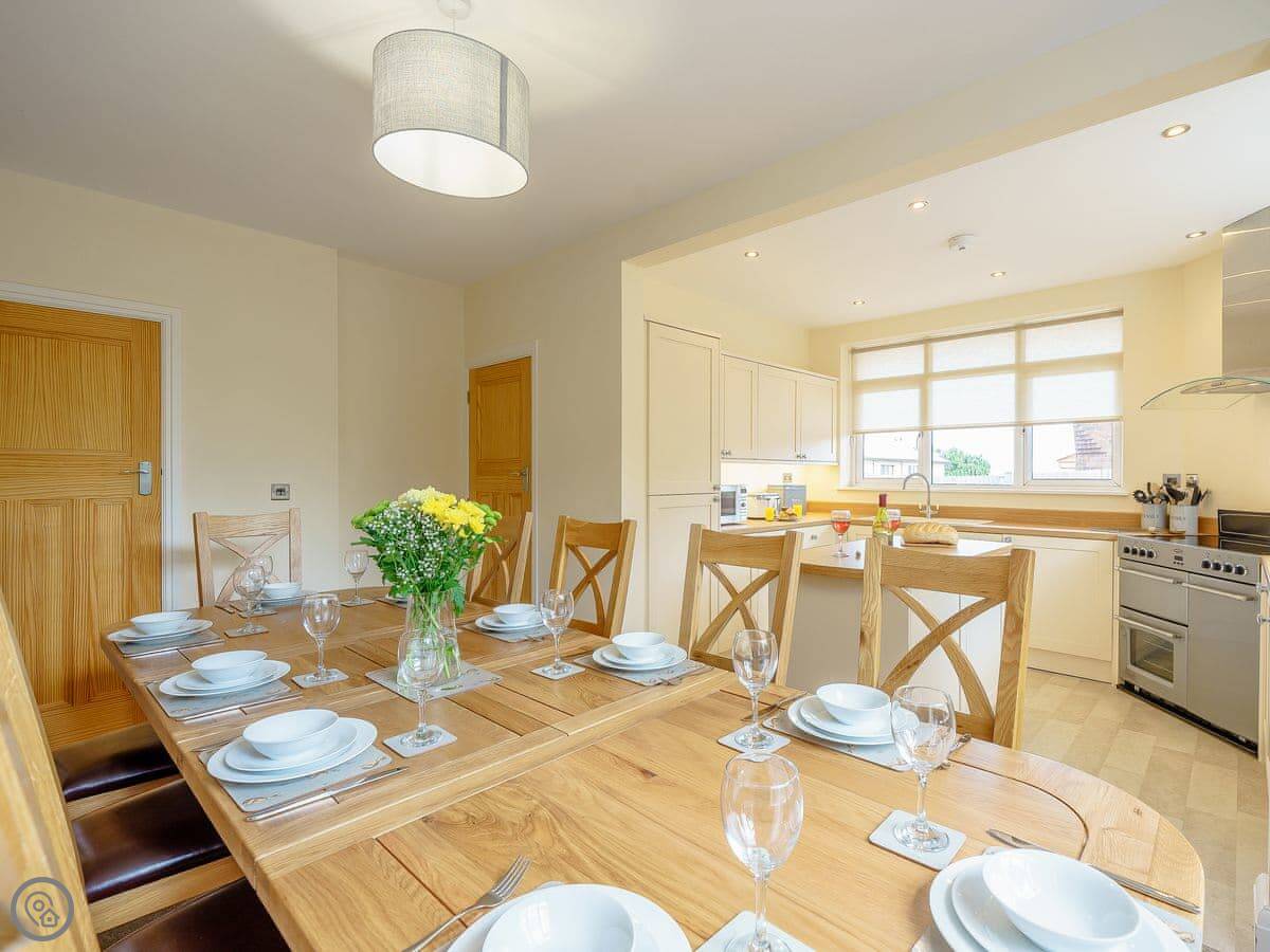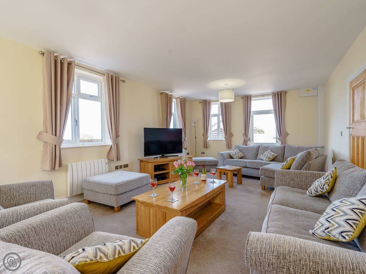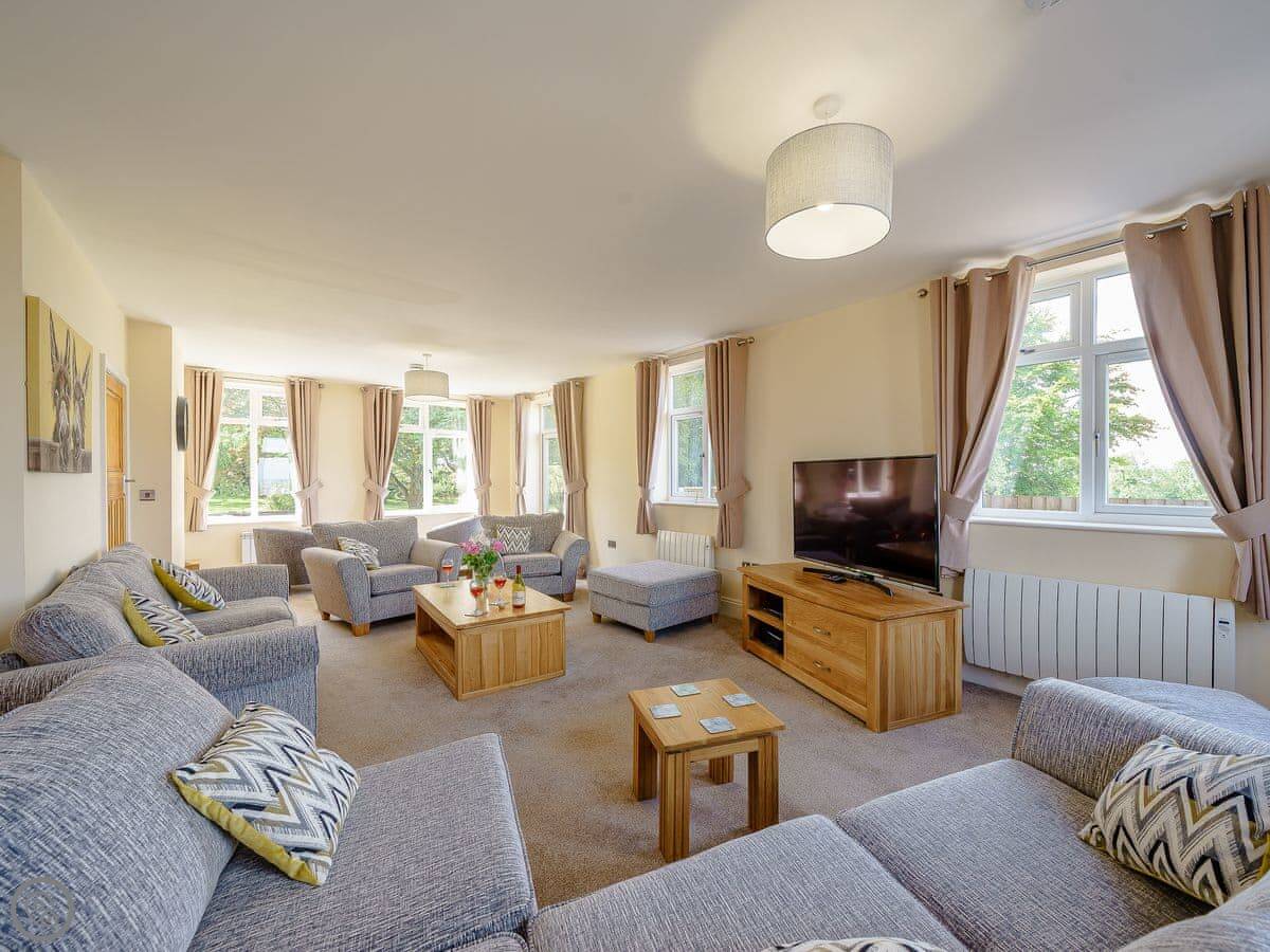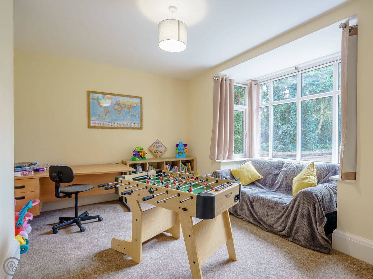 Downstairs there's a big living room, a dining room that seats everyone, and a separate games room with toys. There's also a utility room with a washing machine. Upstairs on the landing, there's a second TV area with sofas, which is handy if people want to split up.