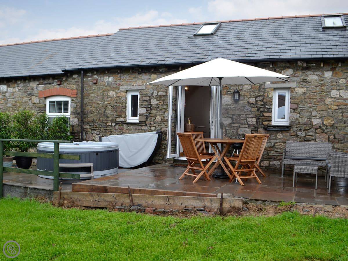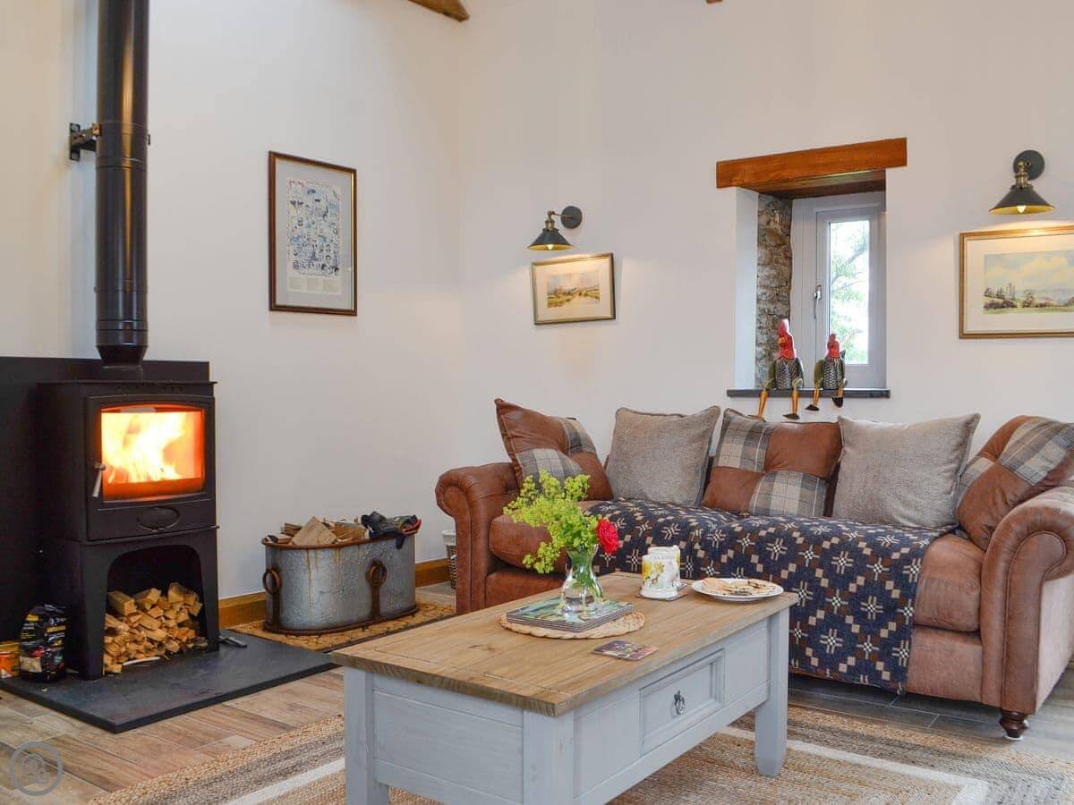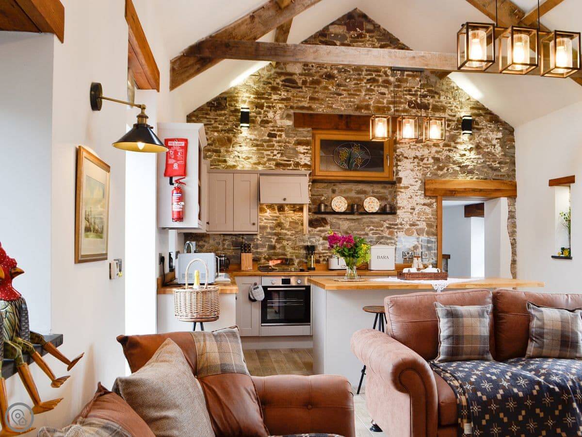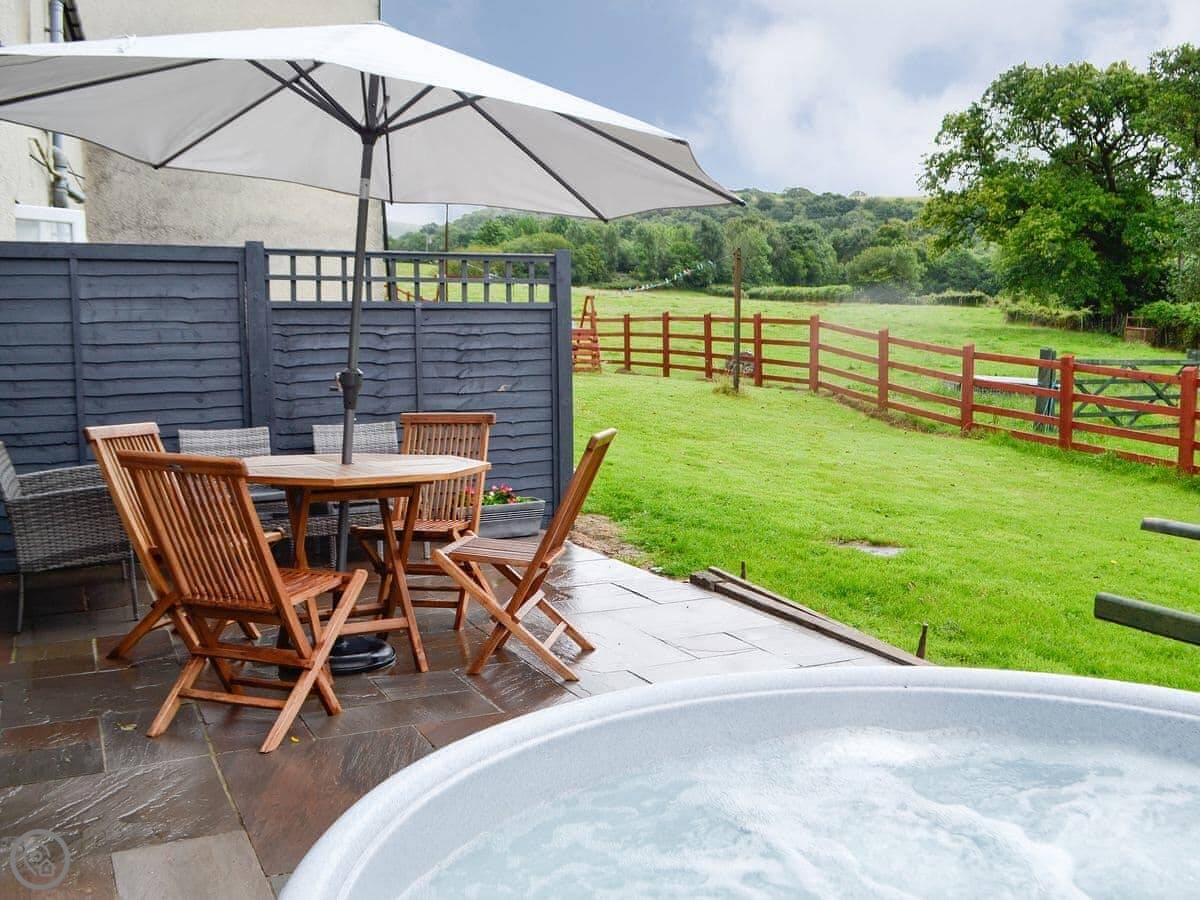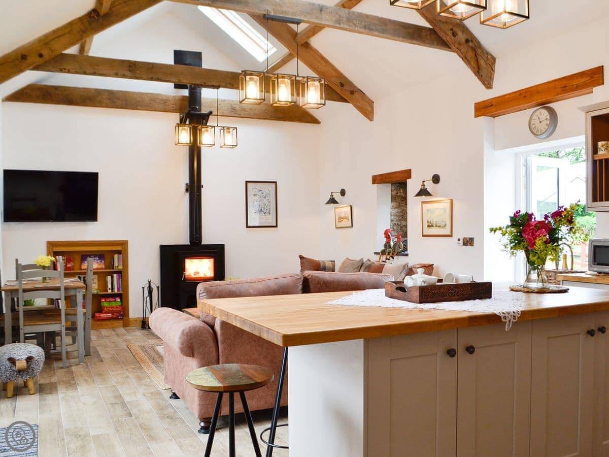 This lovely 1900s barn was formerly a cow shed and milking parlour, and has been converted to a high standard with luxury fixtures and fittings. It is situated on a working beef and sheep farm with a pedigree Hereford suckler herds, sheep and goats and lies adjacent to the owners’ home. This semi-detached property is all one level and has a family bathroom, a double bedroom with en-suite facilities and a twin bedroom. The corridor leads to an open plan living space and the fabulous fitted kitchen has all the necessary appliances you could need. There is also a lovely breakfast bar for you to enjoy your meals whilst looking at the open countryside through the patio doors. The living area has a wood burner, ideal for keeping you cosy on those colder evenings, and patio doors lead out to a patio area and the garden, great for exercising the dogs, and children. After a long walk, imagine relaxing in the private hot tub just looking out onto the rolling green hills – perfect!