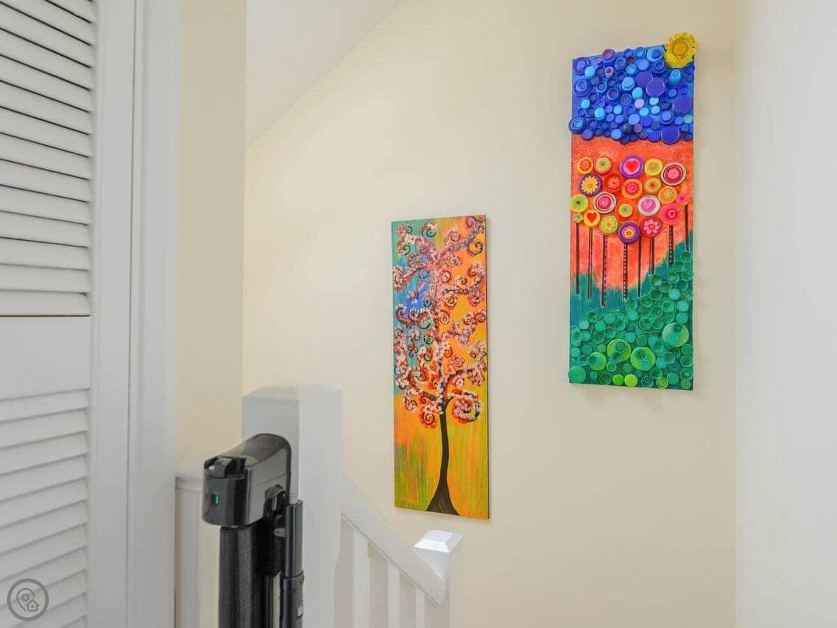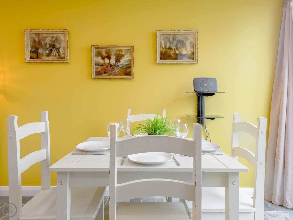 For facilities, it's got pretty much everything. Washing machine, dishwasher, WiFi, TV. There's a cot and a highchair if you need them. Bedding and towels are included. Parking is right there. It has an electric vehicle charger. You can bring up to two dogs.