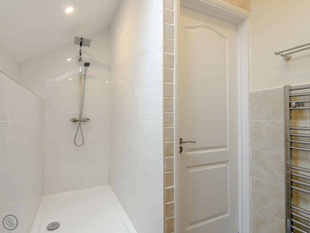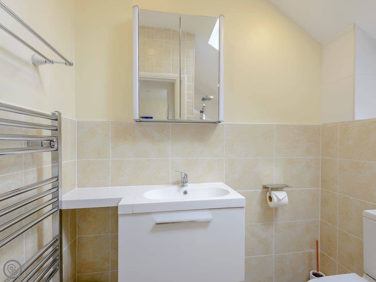 It sleeps four. Two bedrooms, one kingsize and one twin, and two bathrooms. It has a 5 Star rating, which means it's very well finished and comfortable. The living area is open plan.