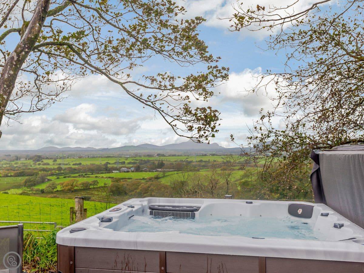 Outside, there's an enclosed courtyard with a private hot tub. The views are of the fields and mountains. It's a quiet spot.