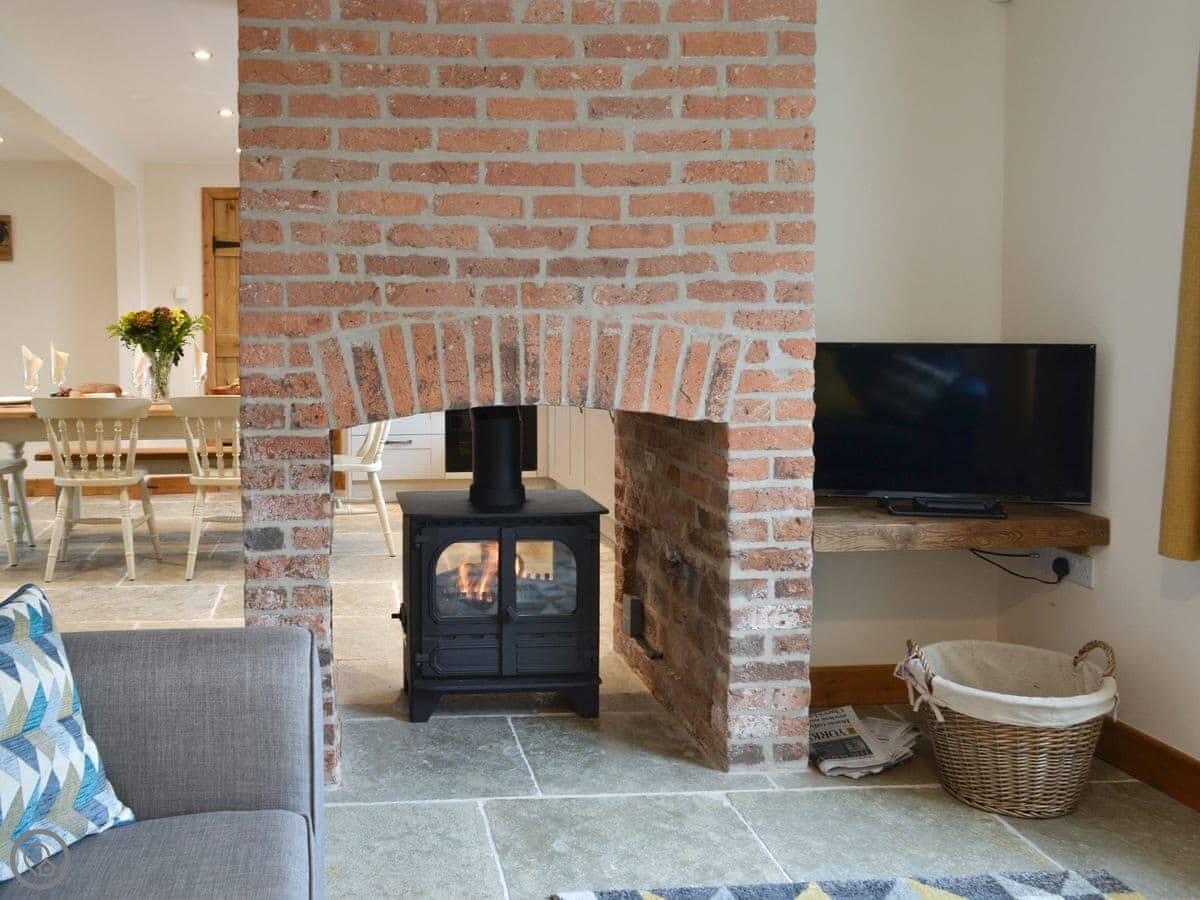 Inside, it's straightforward. There's a wood burner in the living room. Both bedrooms have their own en-suite bathrooms. The kitchen has a dishwasher and washing machine. We provide the bedding and towels. The entrance and main rooms are all on the ground floor and are wheelchair accessible.
