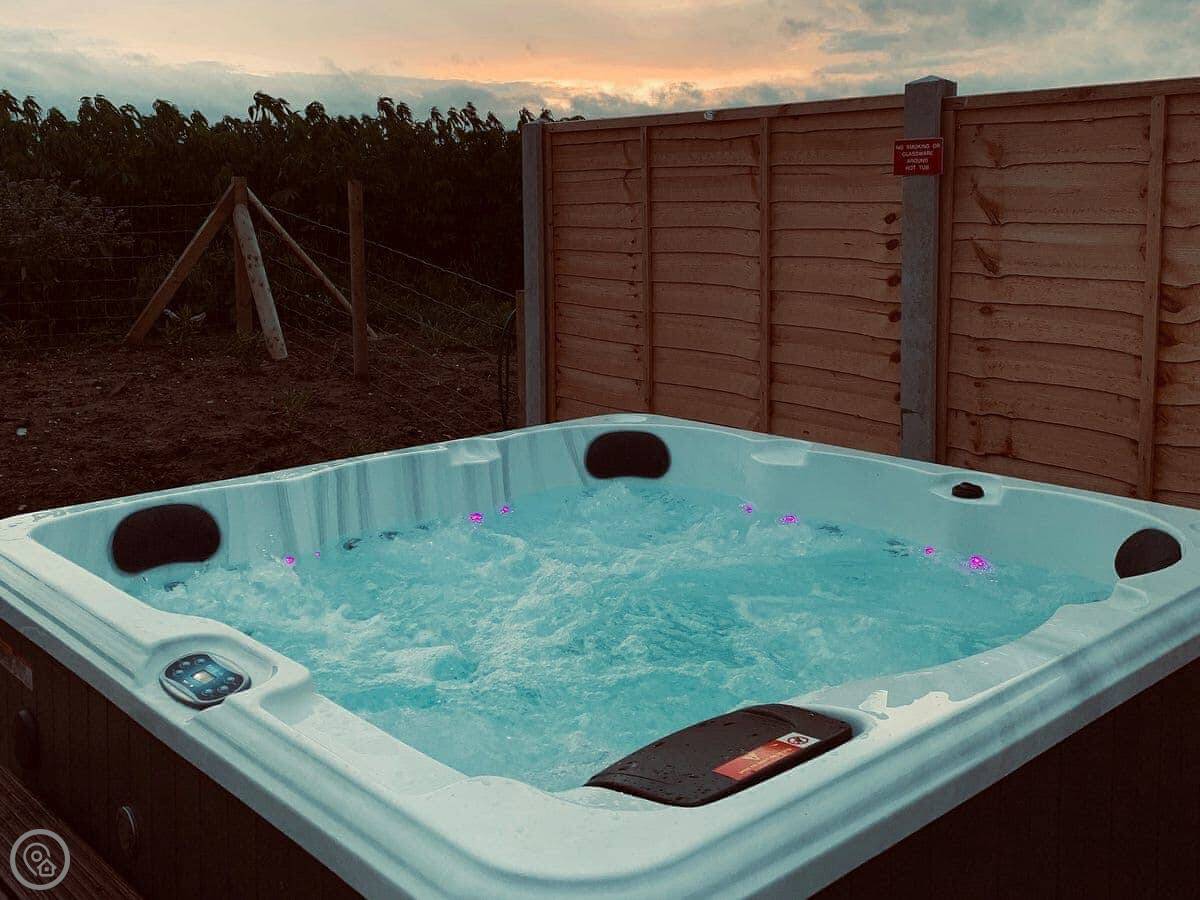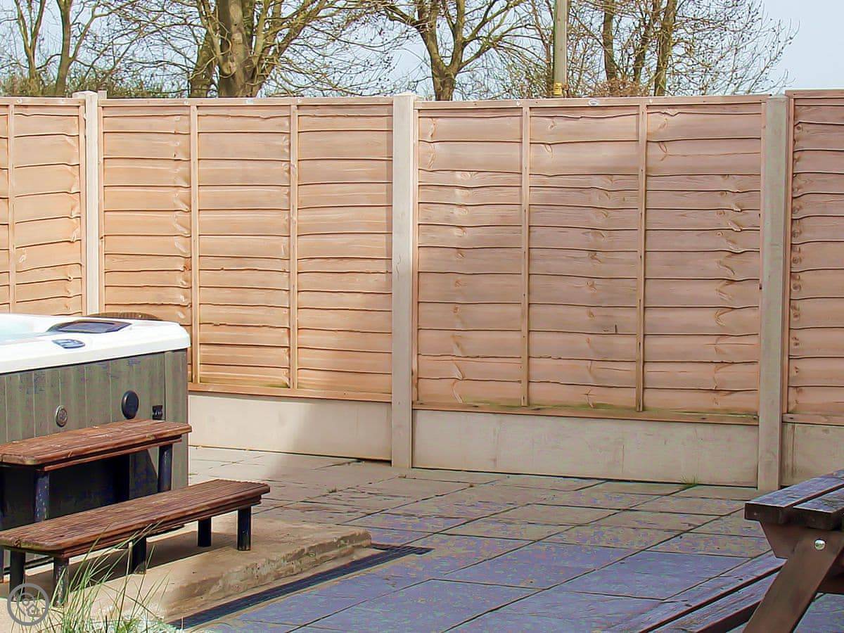 Outside, the gardens are enclosed. There's a patio with a hot tub. Plenty of space for kids to run around or for sitting out.