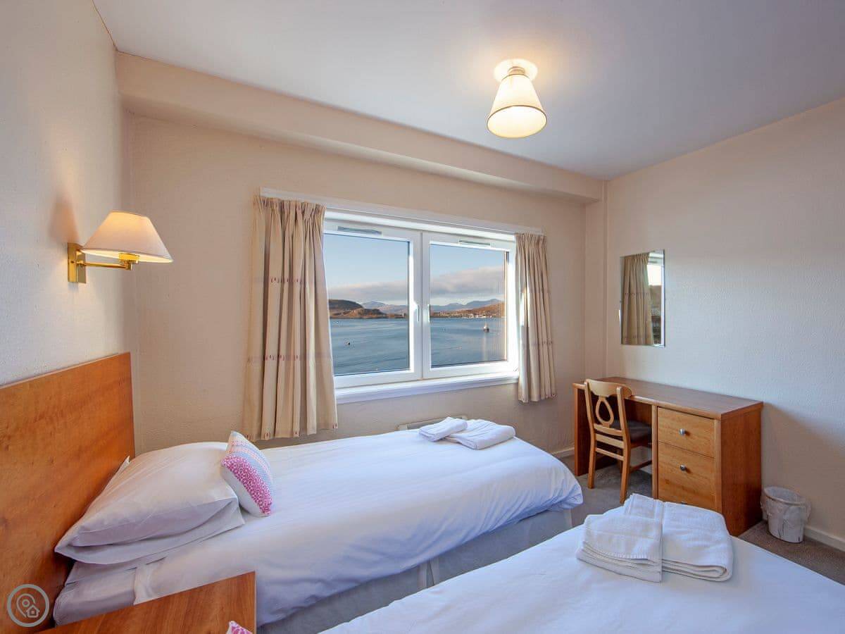 Jura 2 is a dog friendly apartment, with an open plan living/dining room/kitchen with spectacular views over Oban Bay. There is a twin bedroom and shower room. Beach 2 miles. Shop, pub and restaurant 500 yards.
