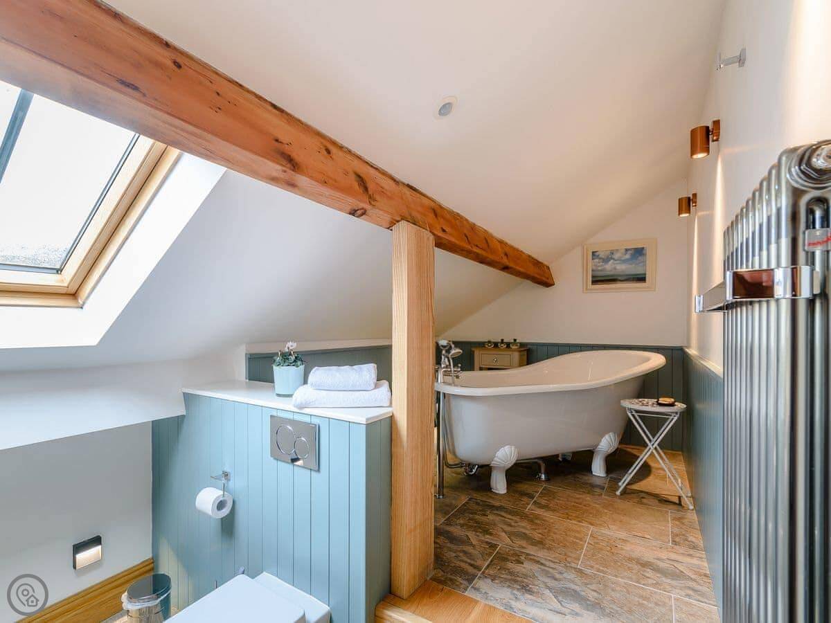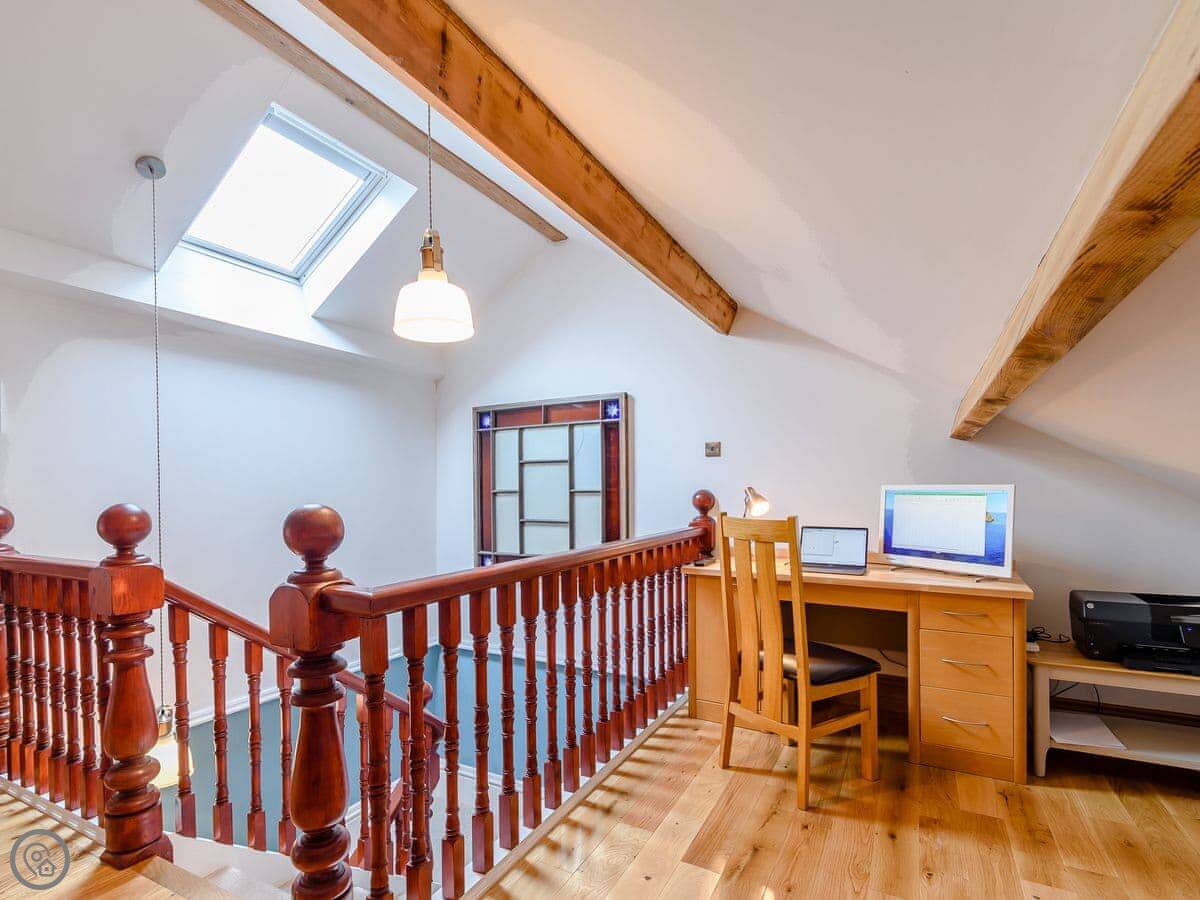 Another flight of stairs goes up to a top floor. This is a galleried space with a desk and printer. It leads to the main bathroom, which has a slipper bath under the eaves. The ceiling is vaulted but low in places. You go down two steps into the room.