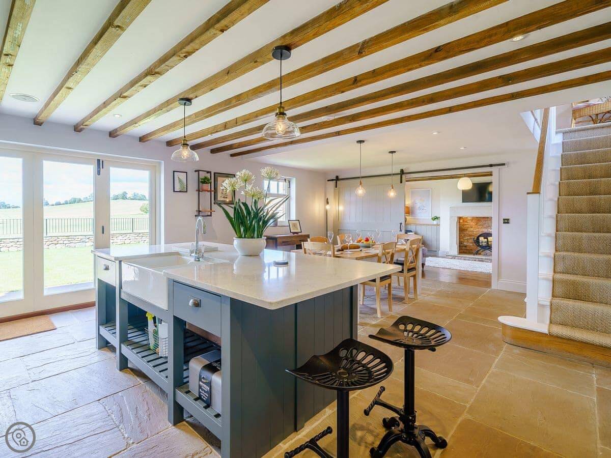 Downstairs is mostly one big room. The kitchen's at one end with an island and a big table, the living area's at the other with sofas. French doors lead out to the patio from both sides. It's a good space for a group.