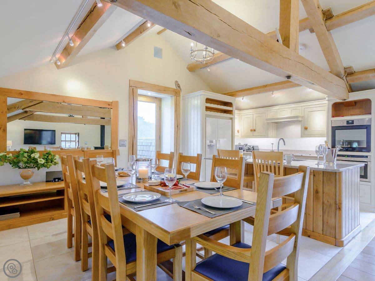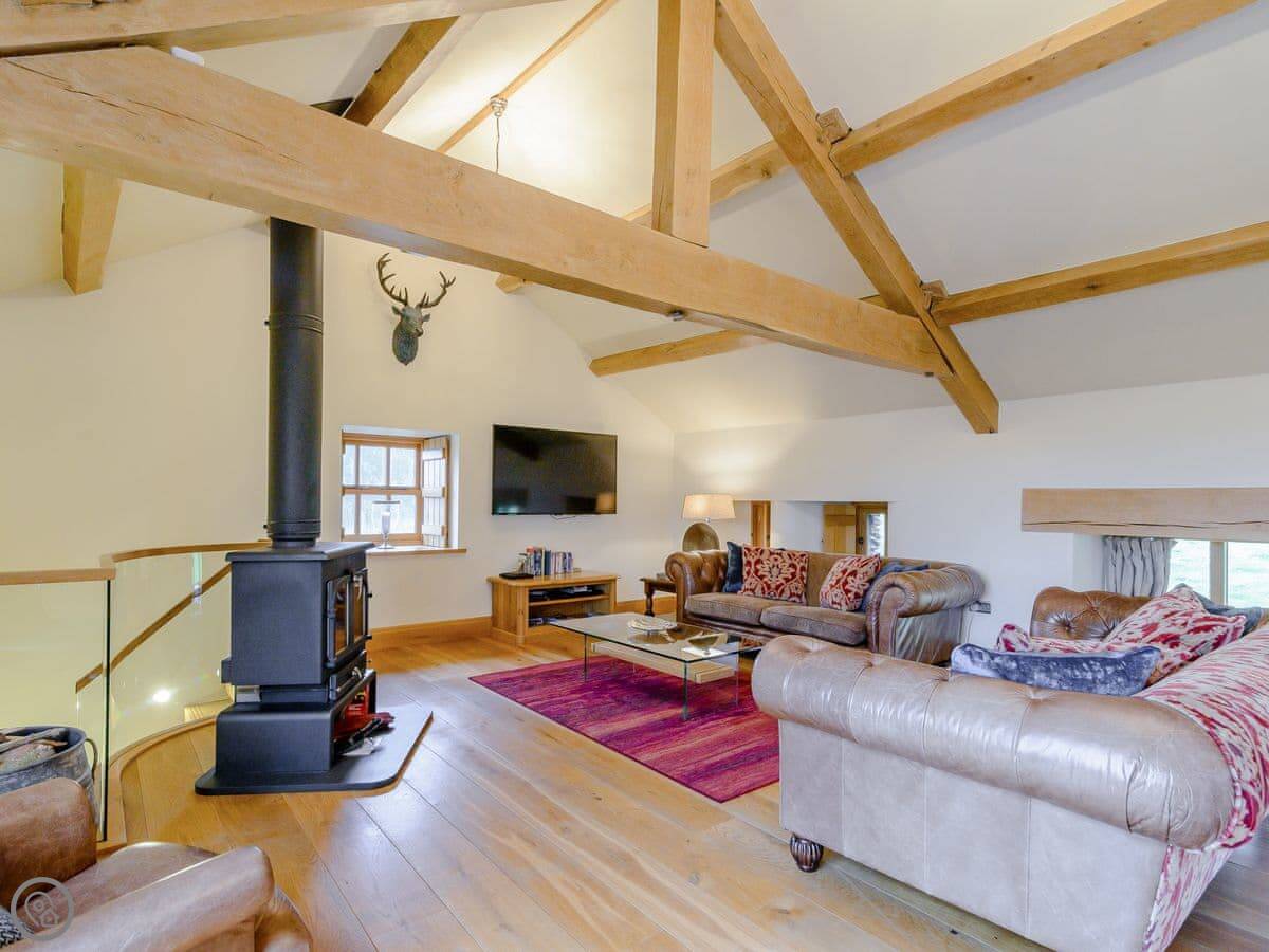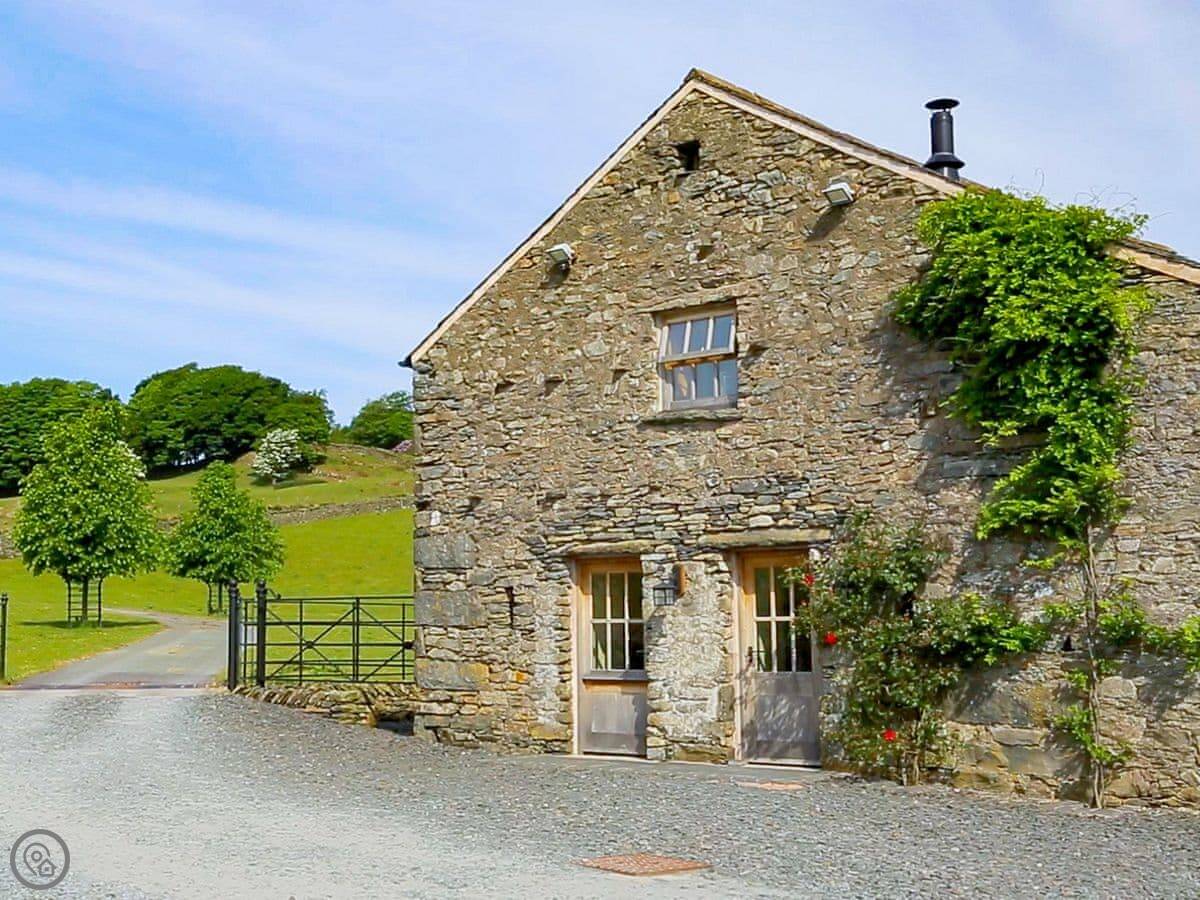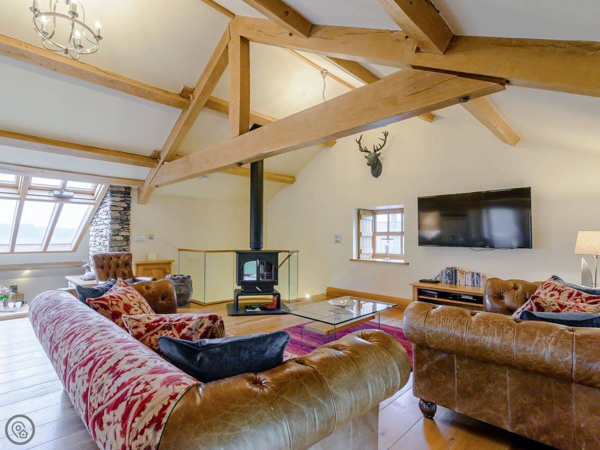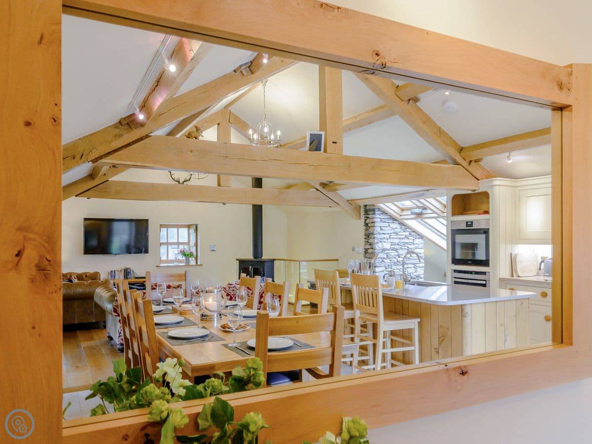 Mungeon Barn is on an estate we run as a family, near Backbarrow. It's detached and sleeps eight. There are four bedrooms and three bathrooms, which are all on the ground floor. The main living area is upstairs. That's where the kitchen, dining, and sitting room are, with a wood burner. There's a second living room downstairs with a TV.