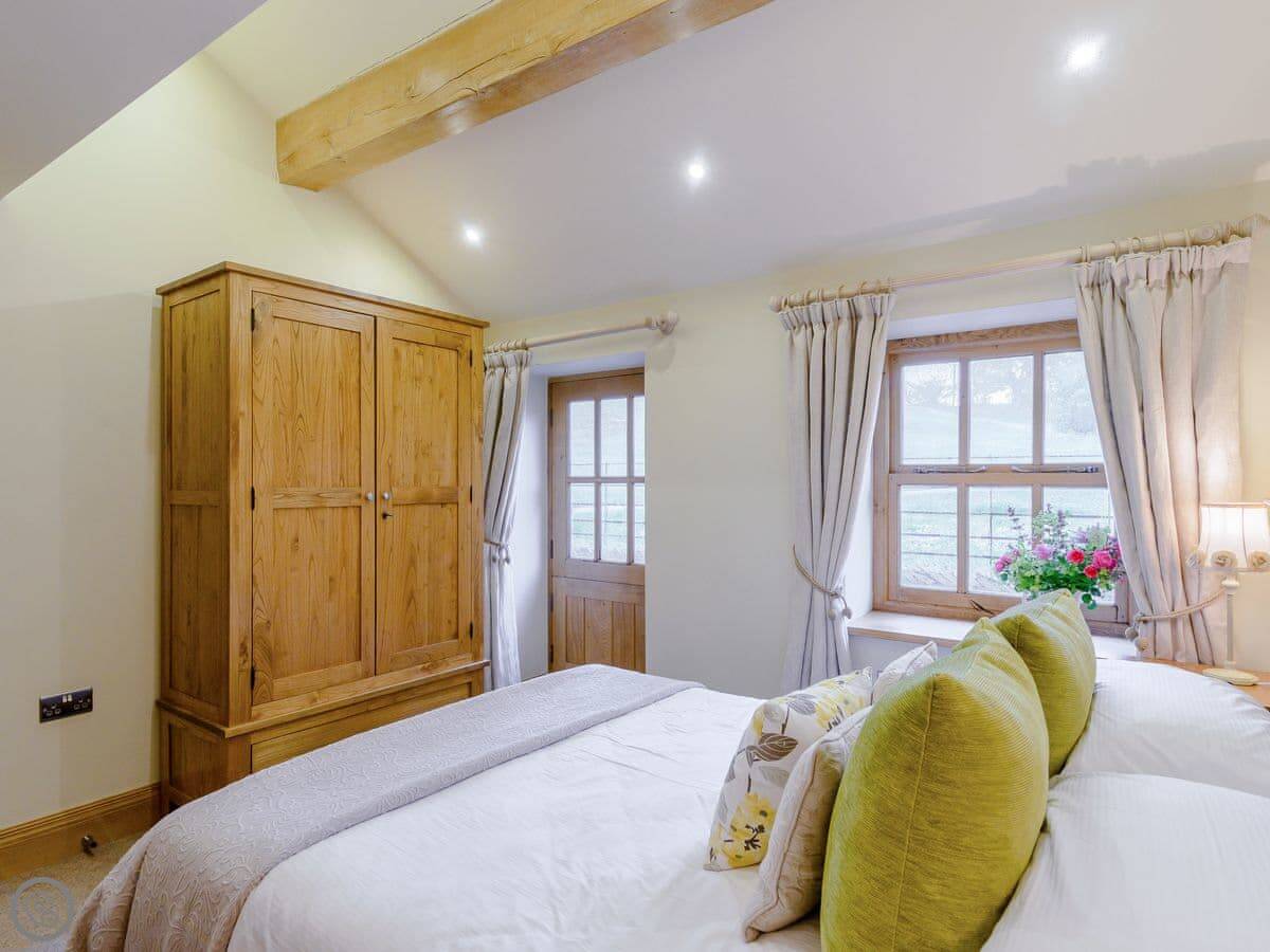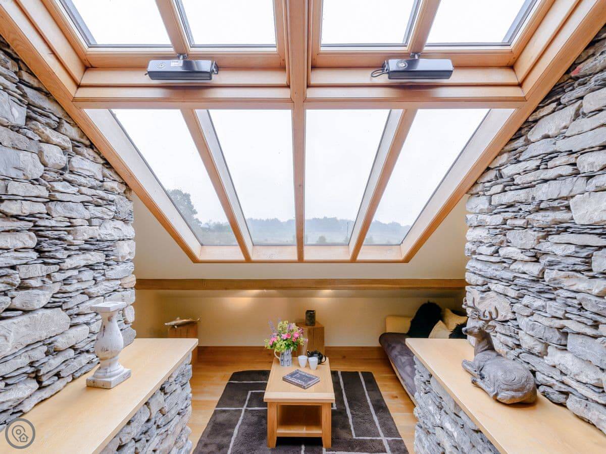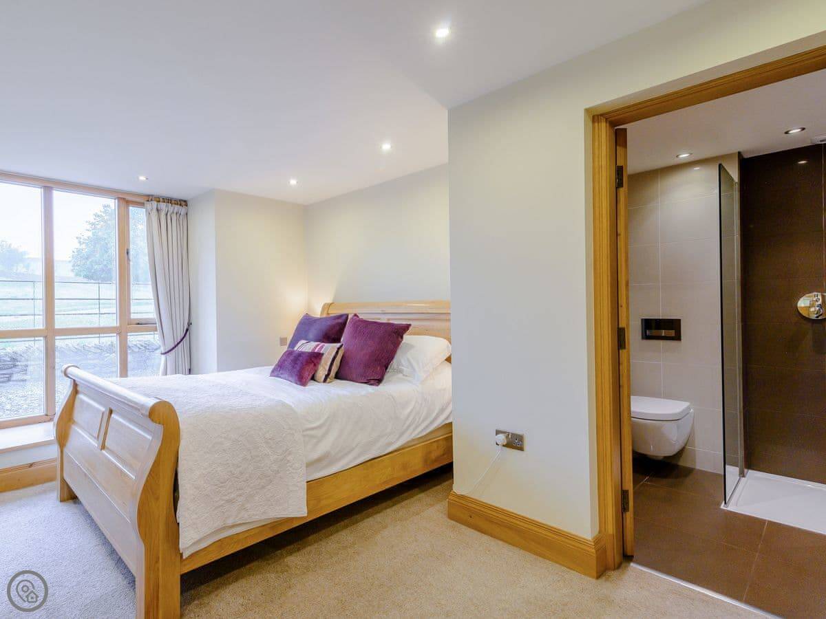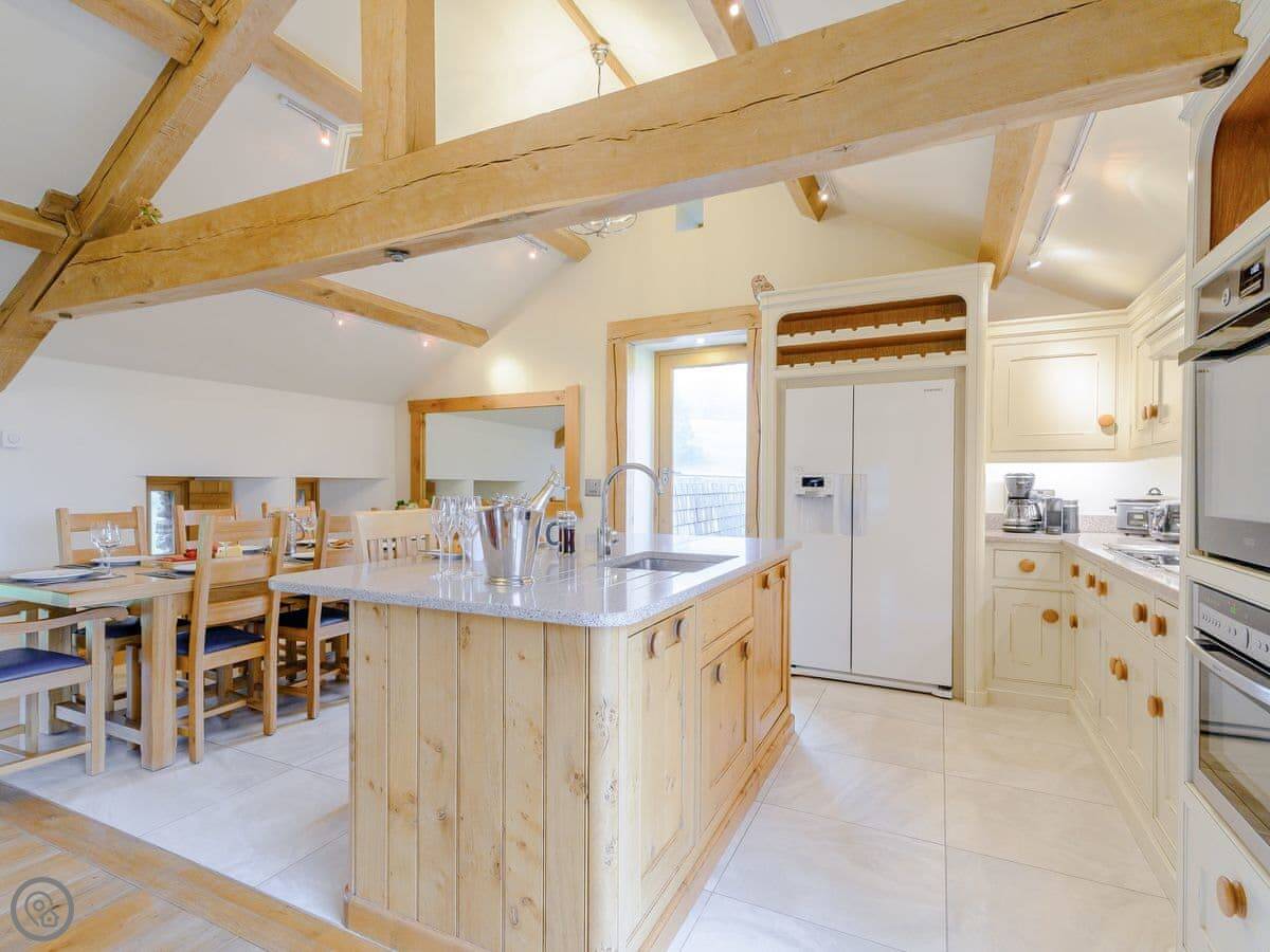 Mungeon Barn is on an estate we run as a family, near Backbarrow. It's detached and sleeps eight. There are four bedrooms and three bathrooms, which are all on the ground floor. The main living area is upstairs. That's where the kitchen, dining, and sitting room are, with a wood burner. There's a second living room downstairs with a TV.