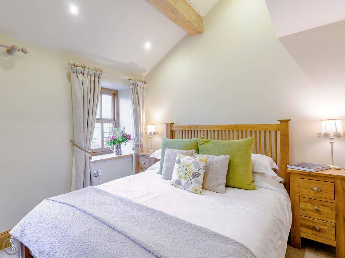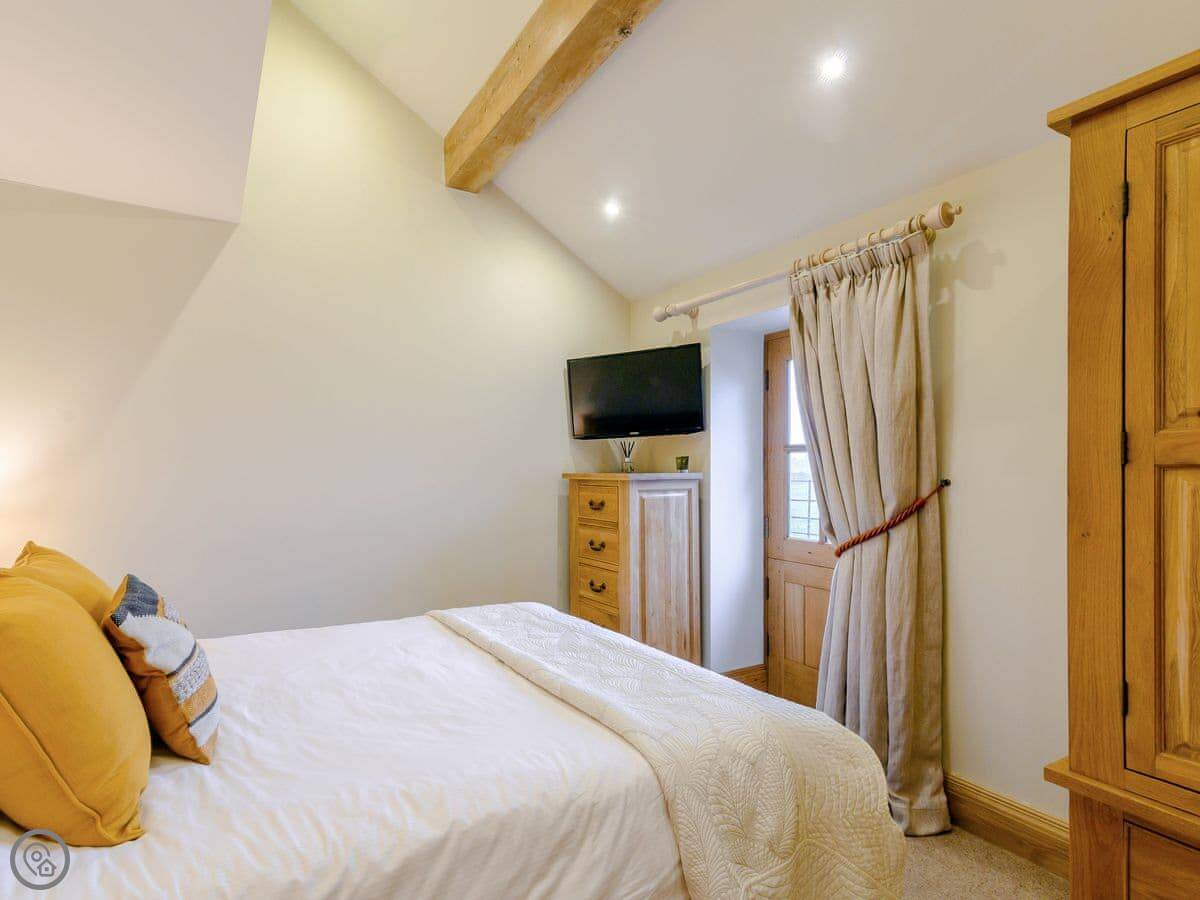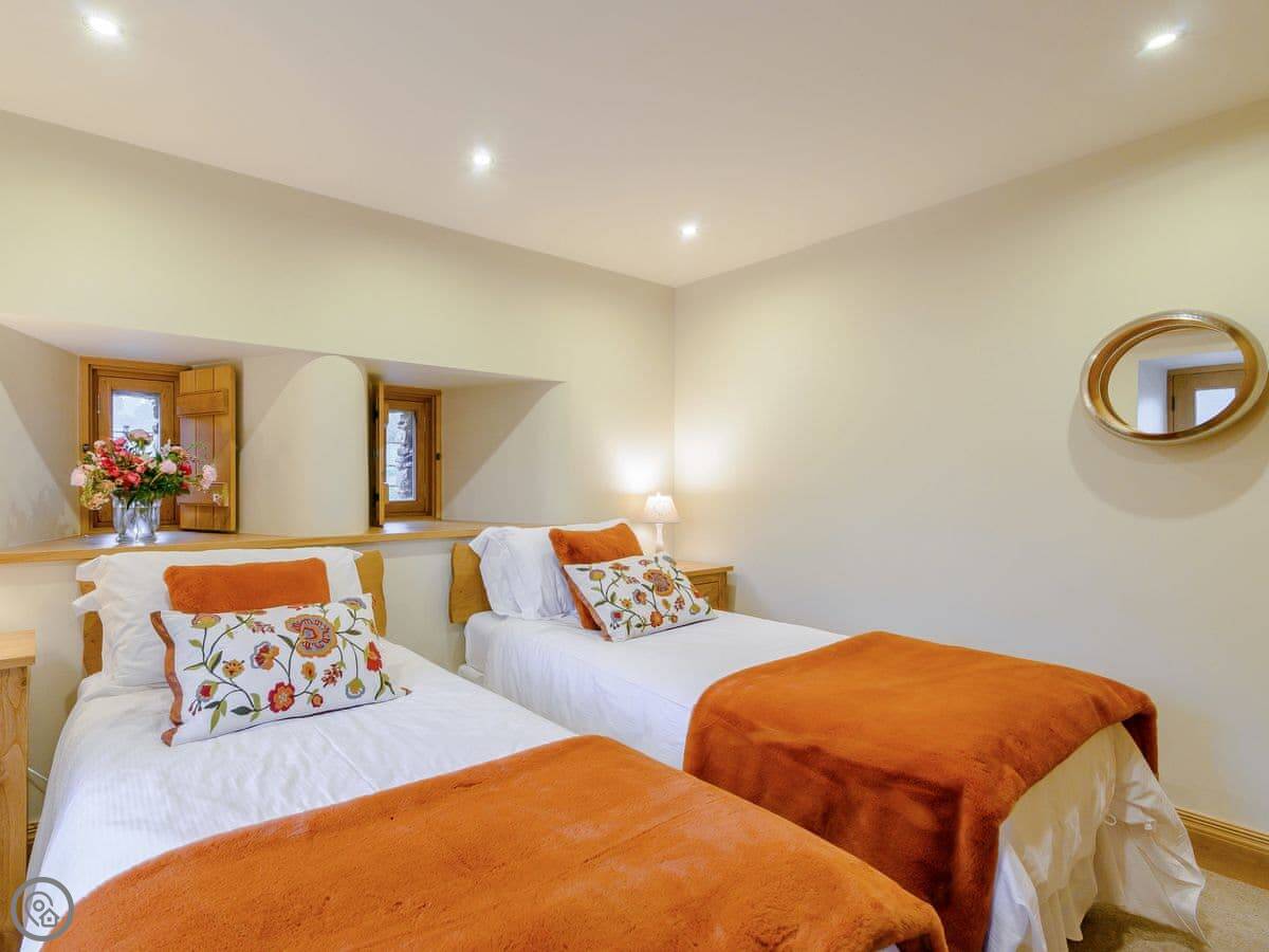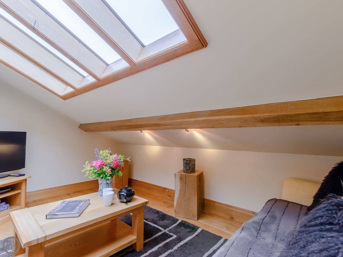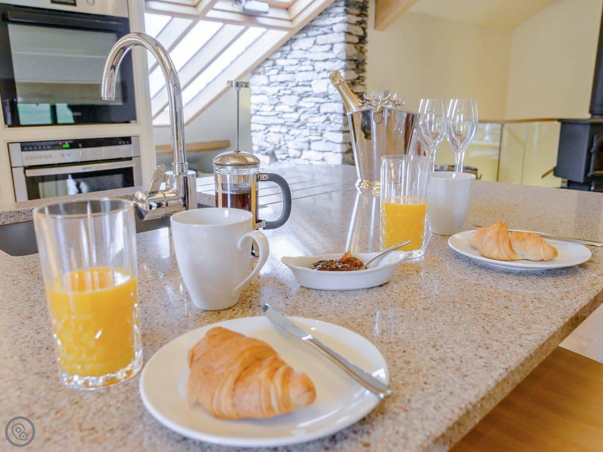 Mungeon Barn is on an estate we run as a family, near Backbarrow. It's detached and sleeps eight. There are four bedrooms and three bathrooms, which are all on the ground floor. The main living area is upstairs. That's where the kitchen, dining, and sitting room are, with a wood burner. There's a second living room downstairs with a TV.