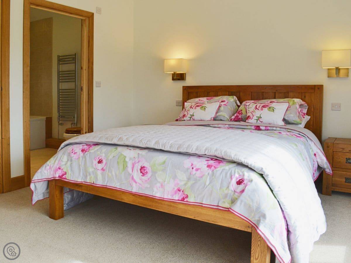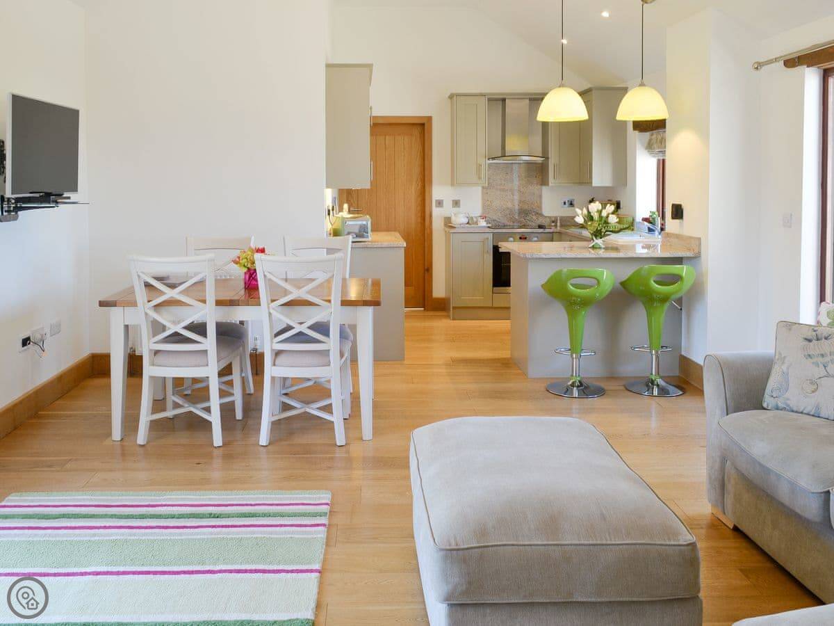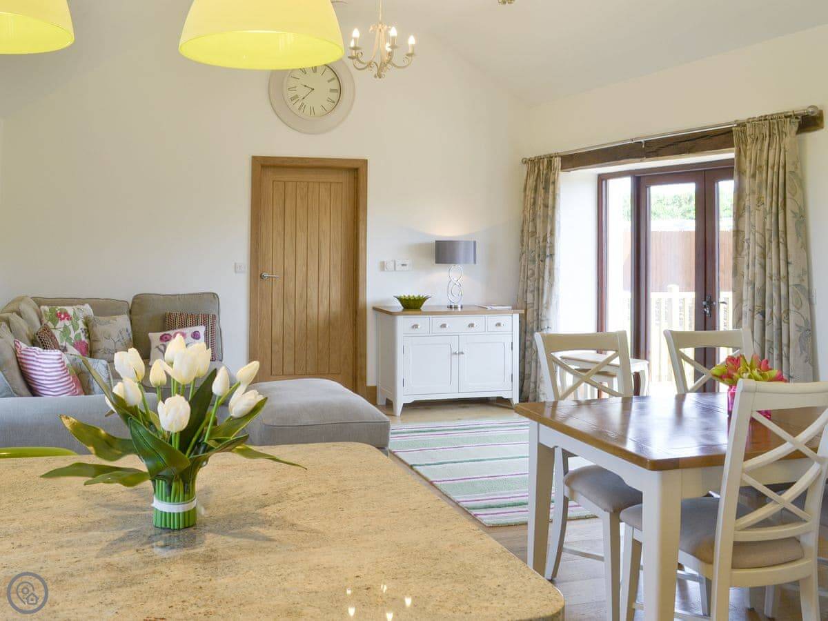The barn sleeps four. Two bedrooms, both with their own bathrooms. It's got a 5 Star rating, which means it's well-finished and comfortable. It's open plan downstairs. The kitchen has granite worktops.