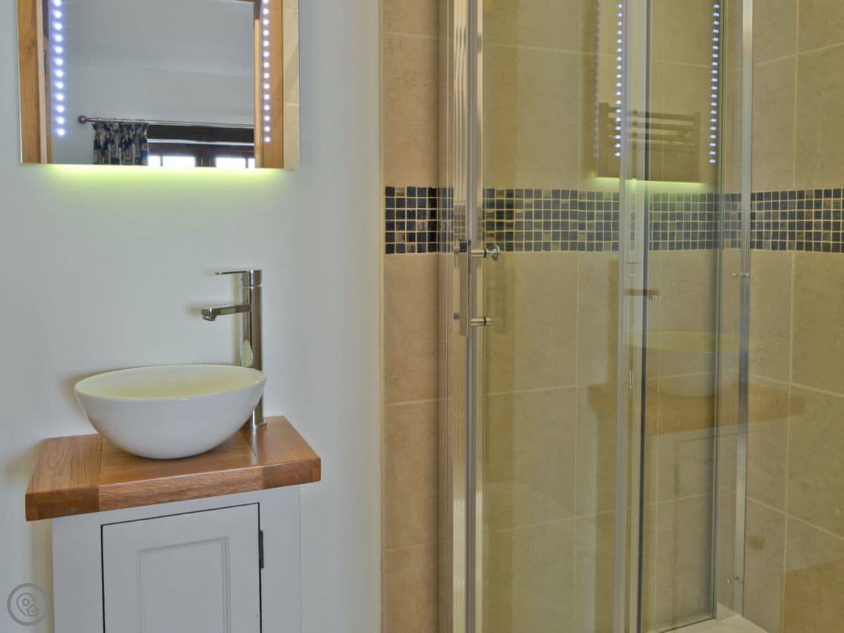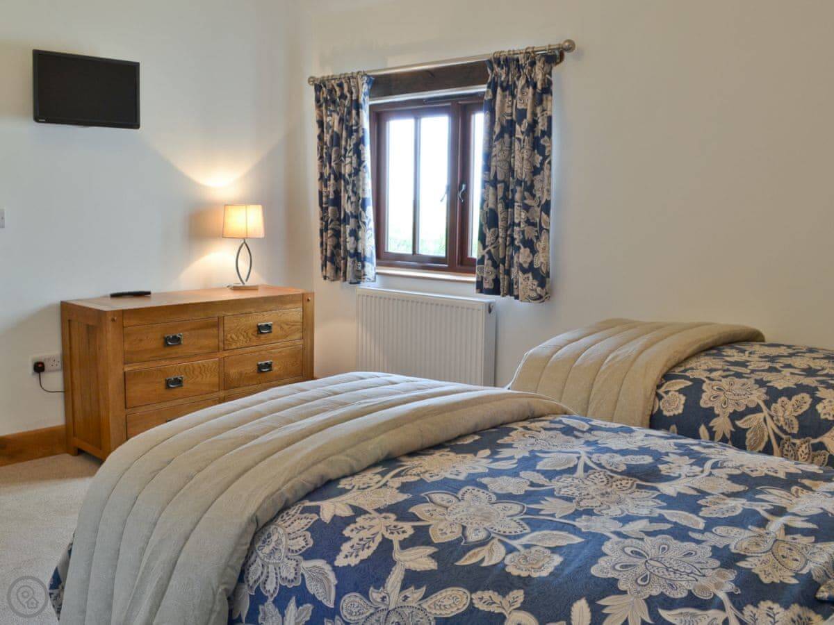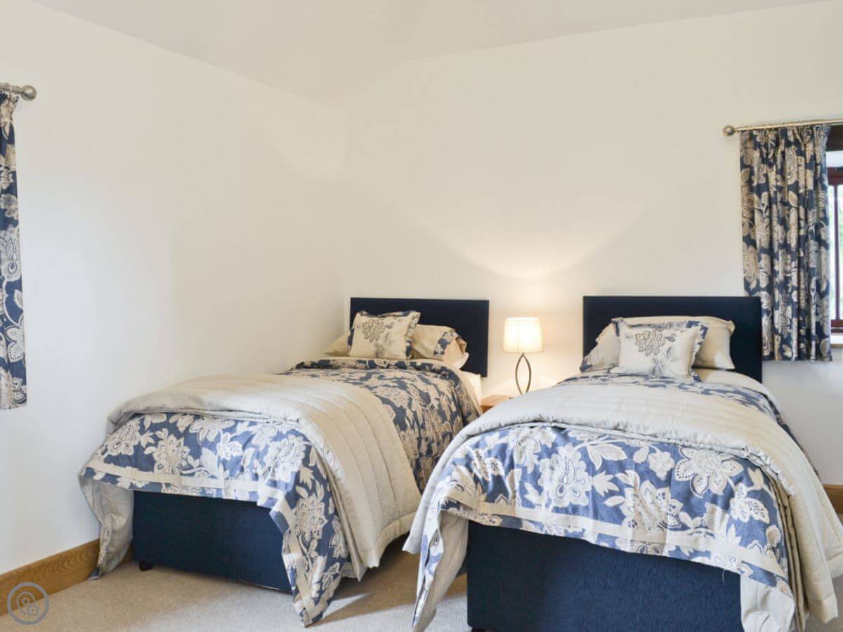 The barn sleeps four. Two bedrooms, both with their own bathrooms. It's got a 5 Star rating, which means it's well-finished and comfortable. It's open plan downstairs. The kitchen has granite worktops.