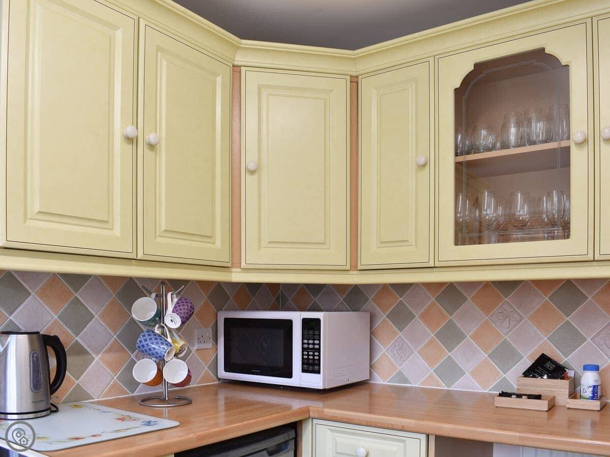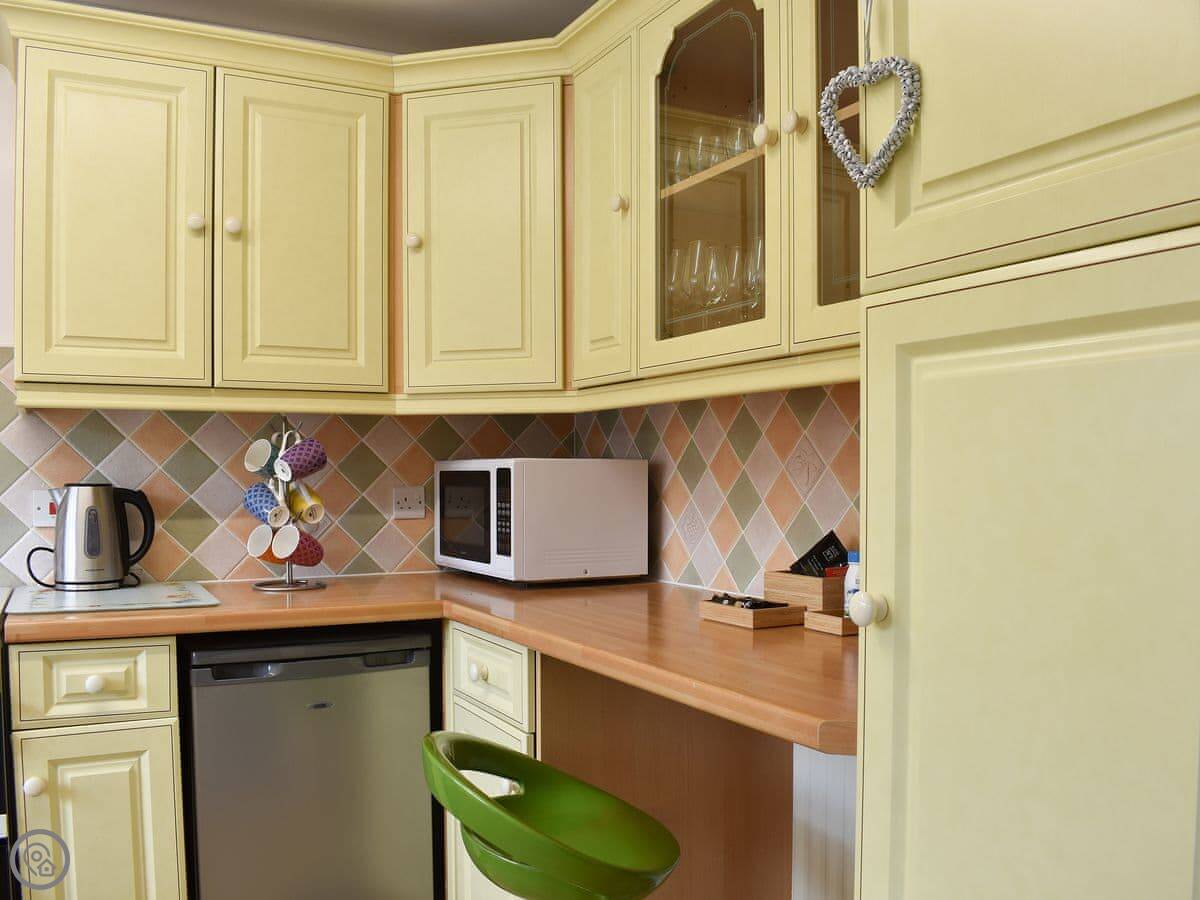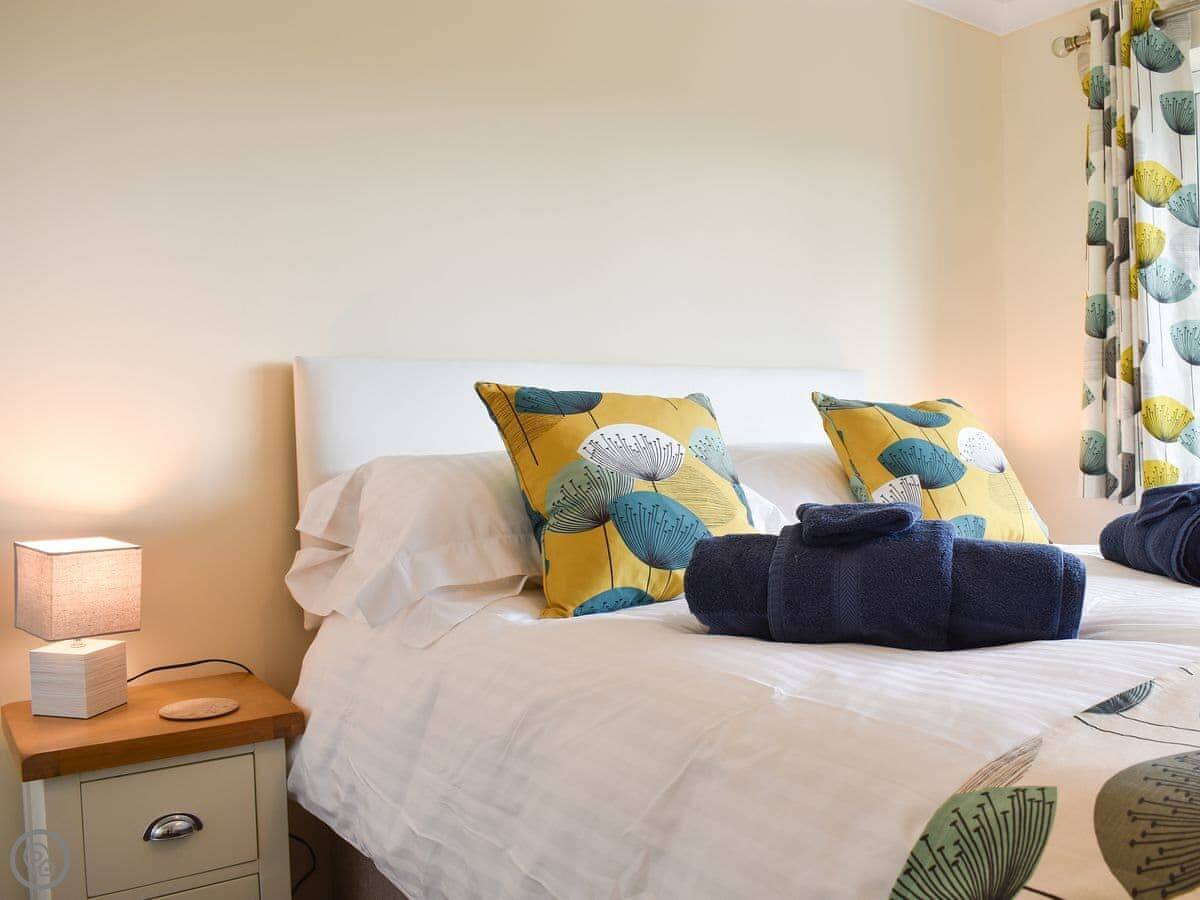 It sleeps four. Two bedrooms, one bathroom. One king size bed, two singles. It’s a 4 Star rating, so everything’s there and it’s comfortable, but it’s not huge. The kitchen is compact but it has what you need.