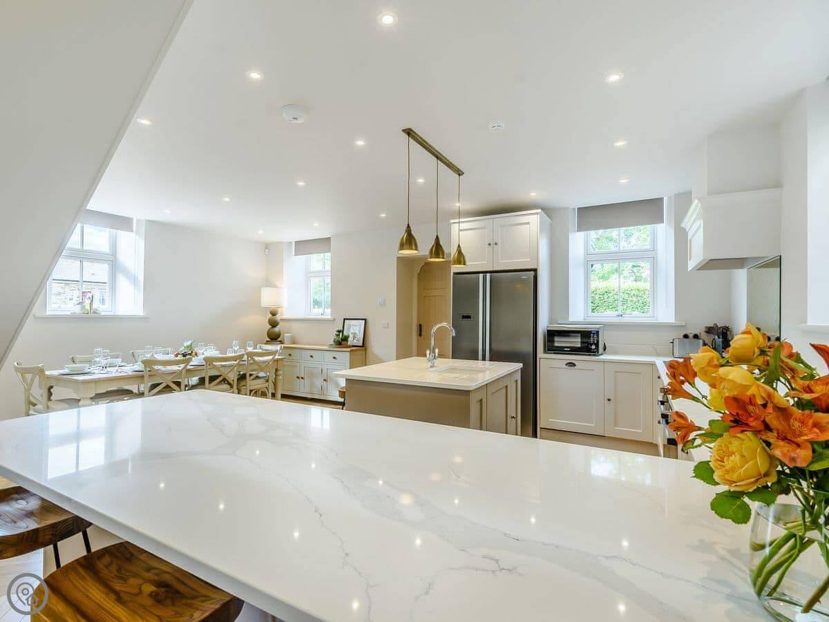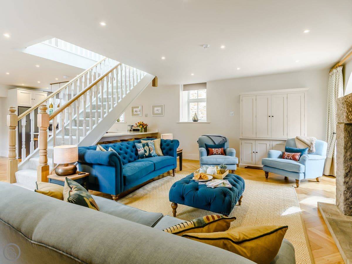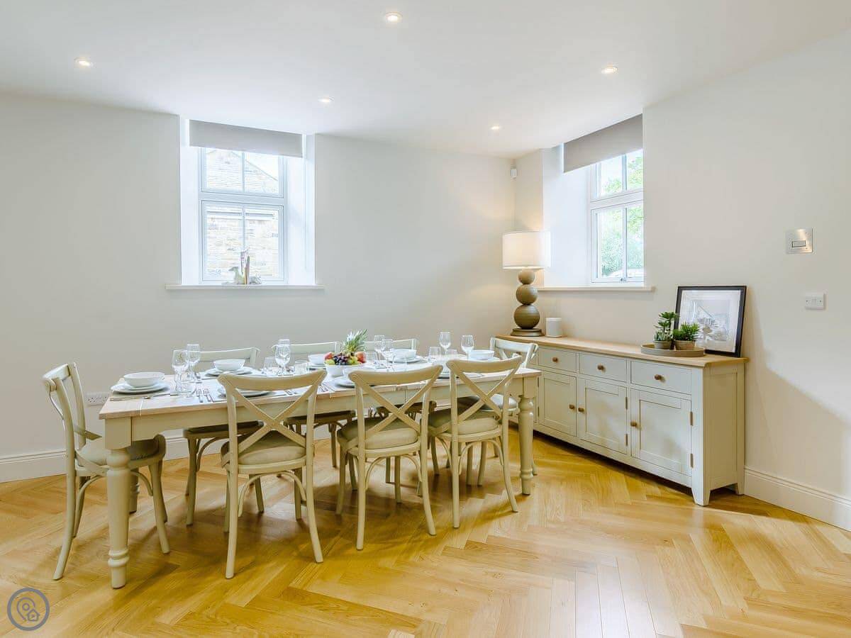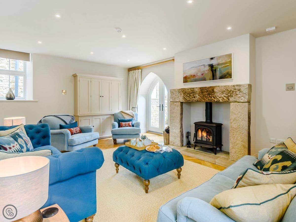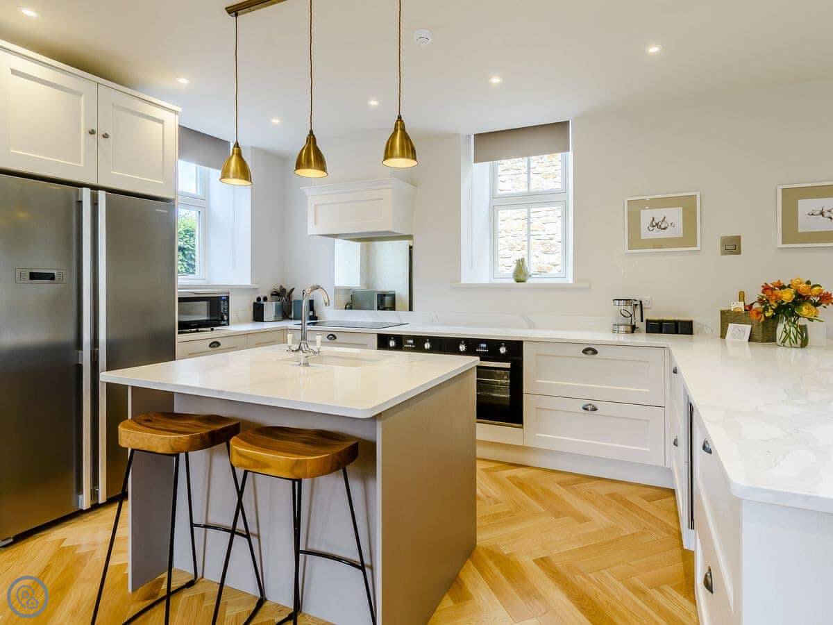 It sleeps eight. Four bedrooms, each with its own bathroom. That’s handy with a full house. The rating is 5 Star, so it’s well finished and comfortable. It was all done up in 2020. The main living area is open plan downstairs, with a wood burner. There’s a bedroom and a shower room on the ground floor as well, which is useful.