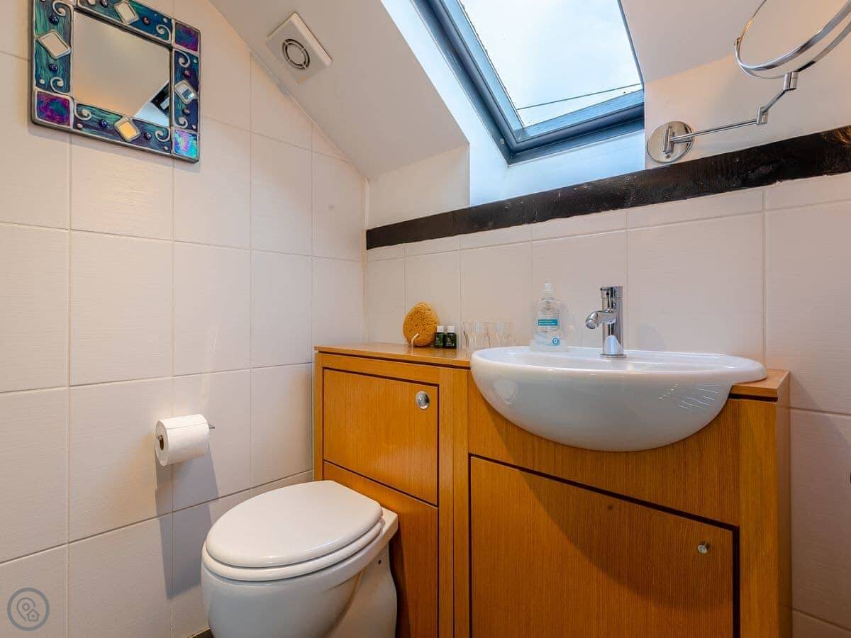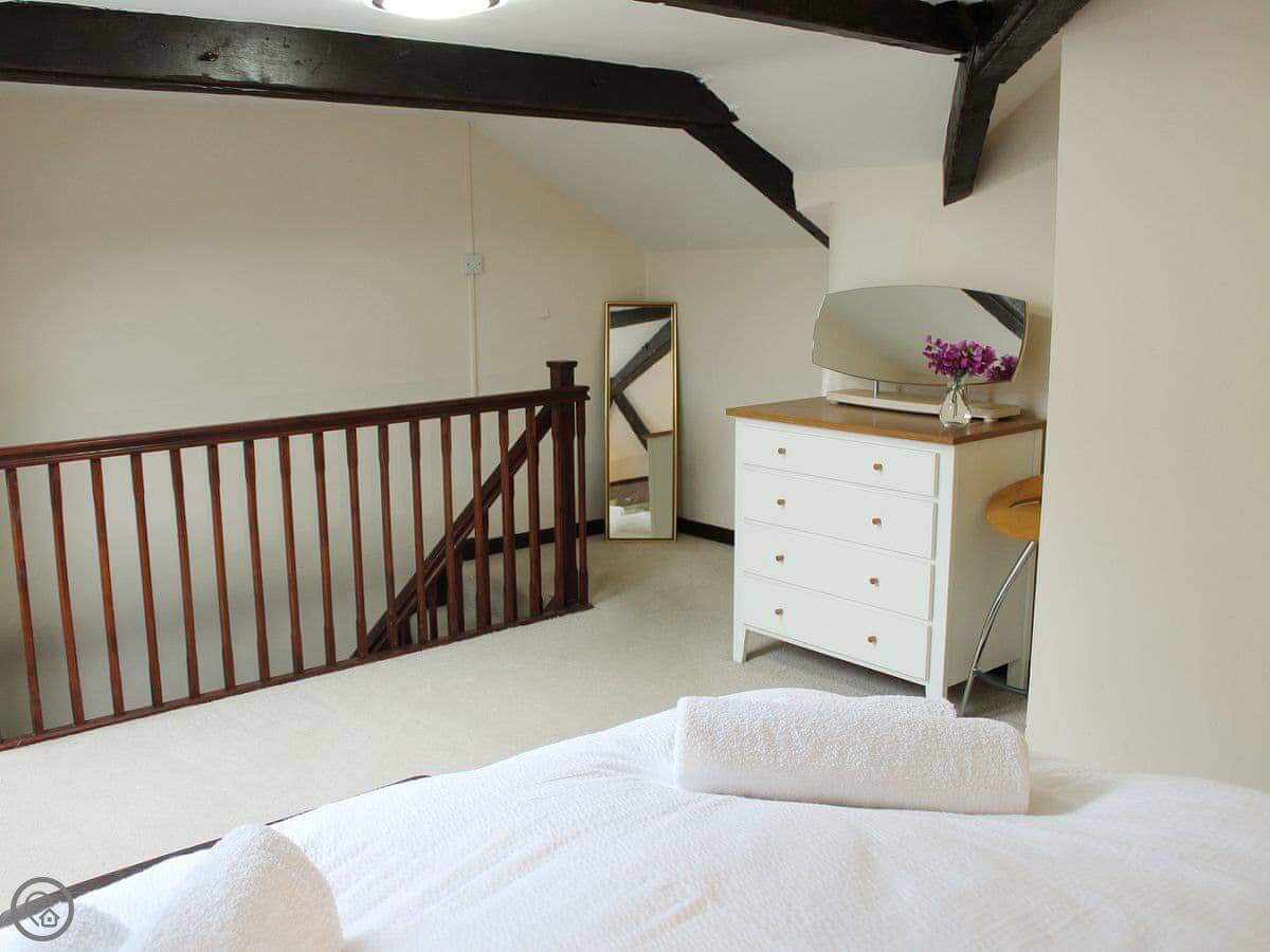 Inside, it's open plan downstairs. Living area, kitchen, dining table all in one room. It's got a wood burner, which is nice in the winter. The stairs go up from there. They're cottage stairs, so they turn a corner and are a bit steep. The bedroom's up there with the shower room.