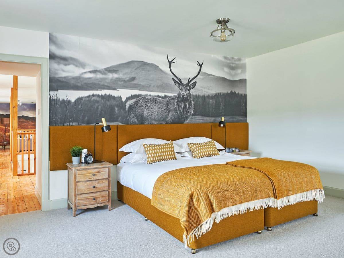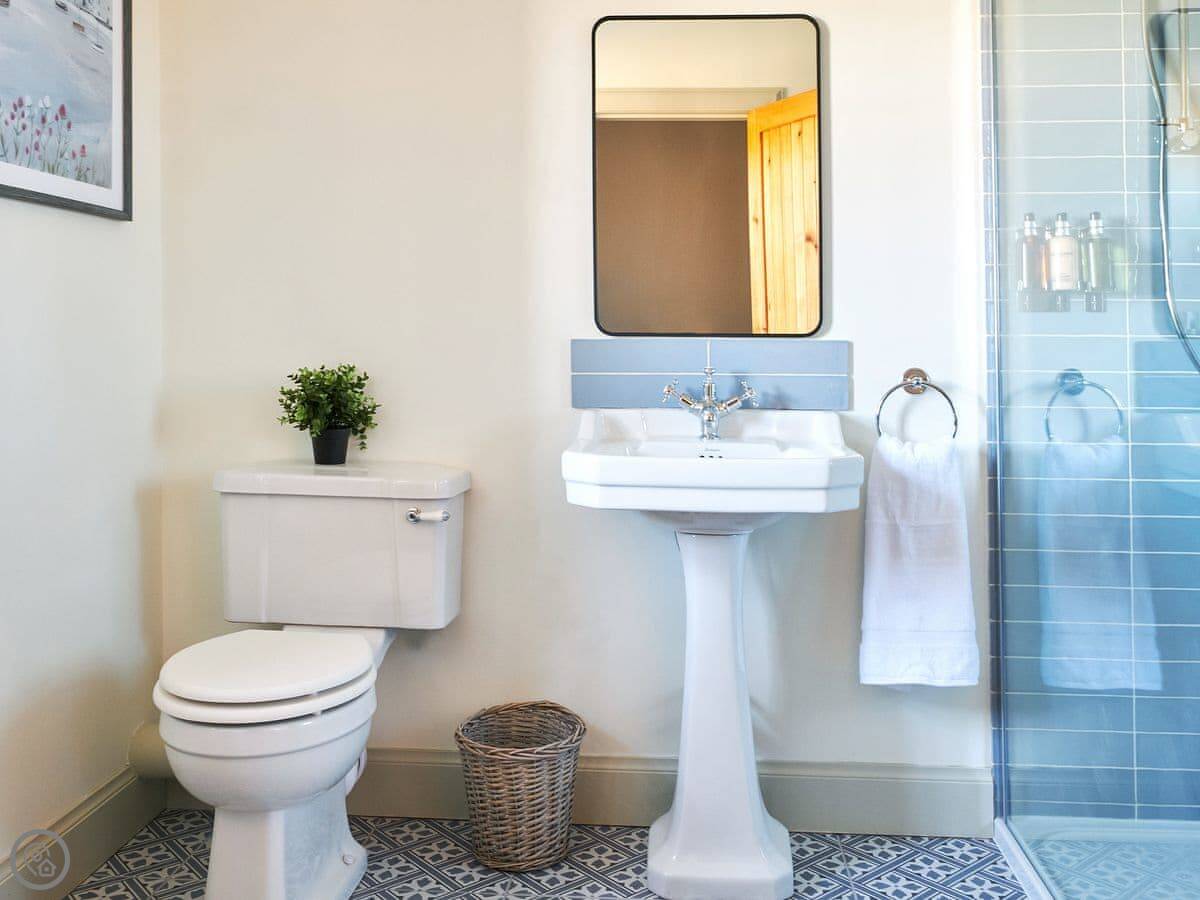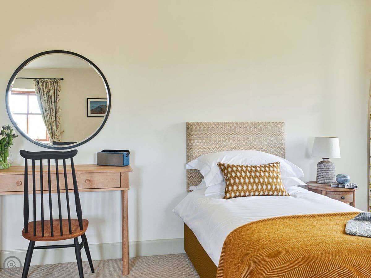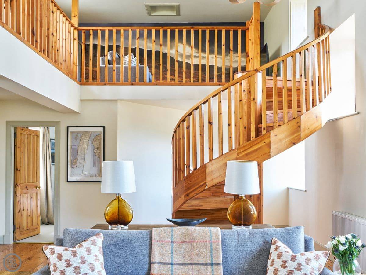 It sleeps five. There are two bedrooms. One double is on the ground floor. Upstairs, there's a room with three single beds. There's also a sofa bed on the gallery if you need it. Just one bathroom, but it's a good size wet room on the ground floor. The entrance and the main living area are step-free.